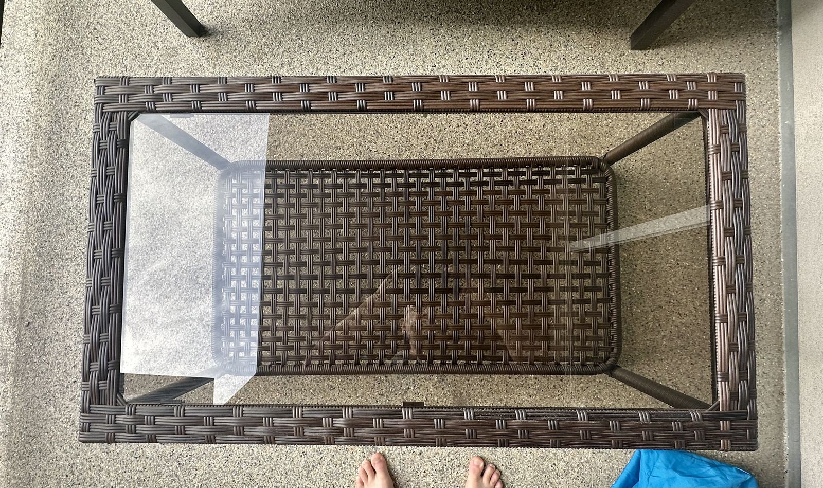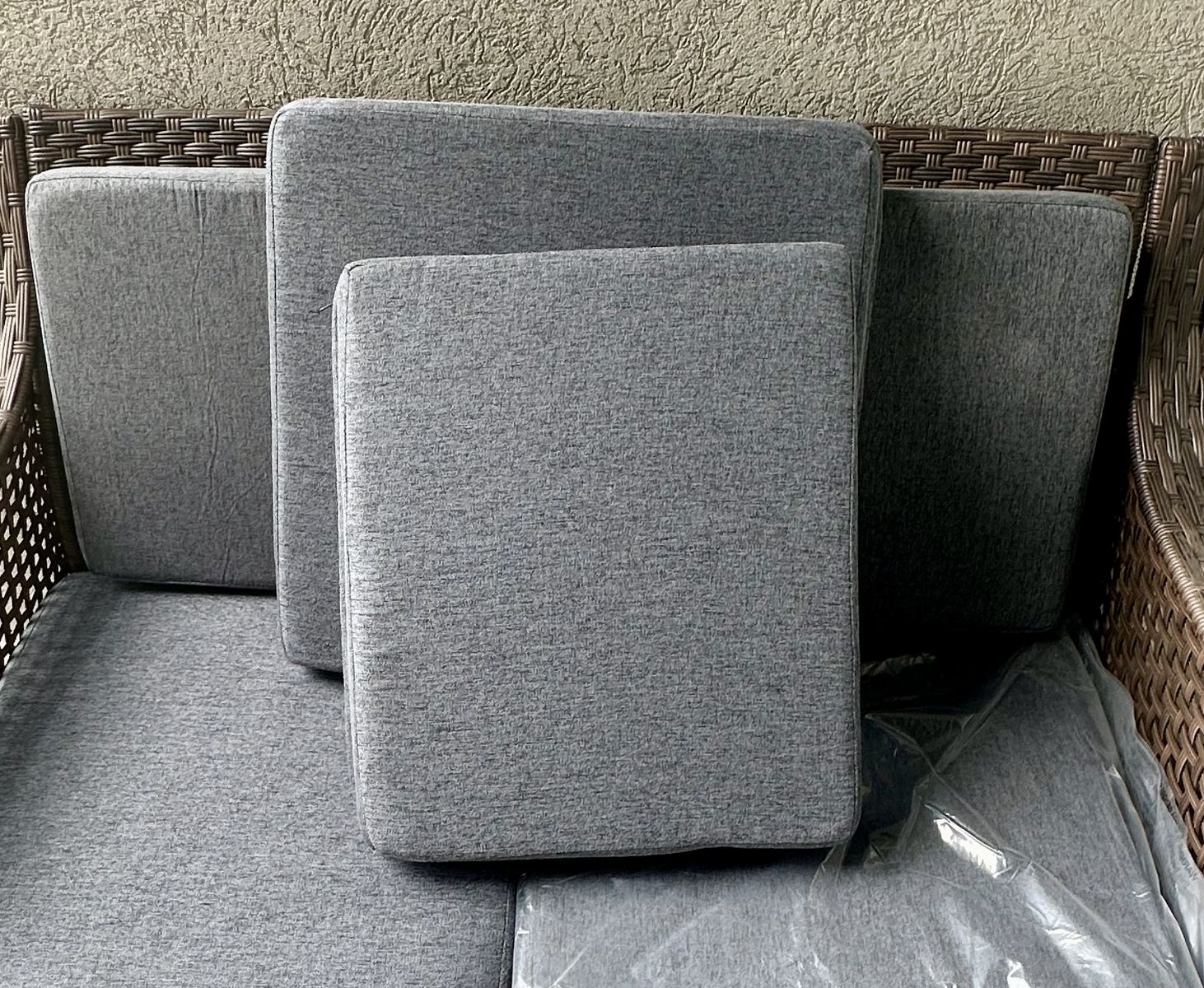Features: • Condition: Brand new • Durable dark brown wicker/resin frame • Comfortable seat & back cushions included (still in plastic) • Built-in side table (perfect for drinks, decor, or snacks) • Lower shelf for extra storage • Clean, modern look that fits any space