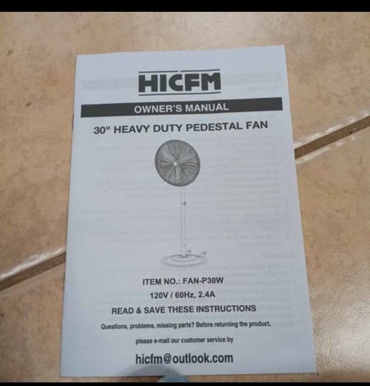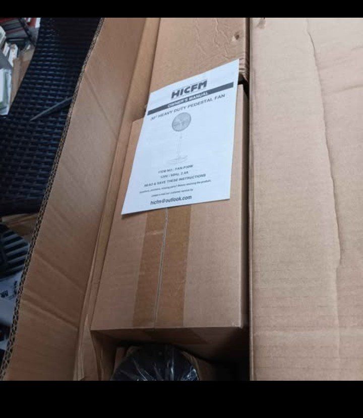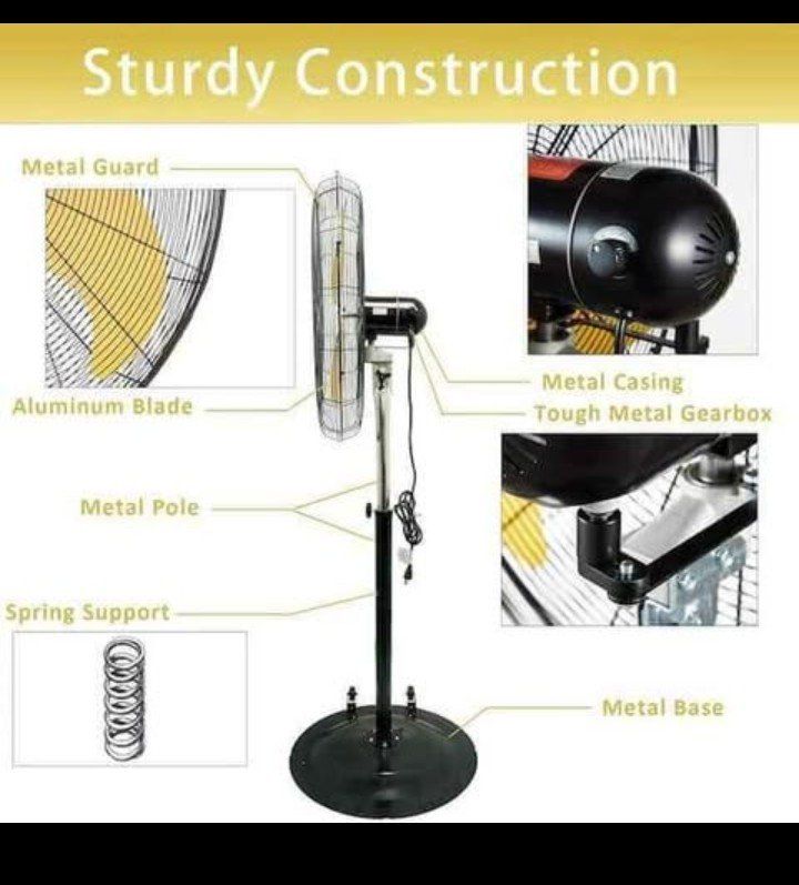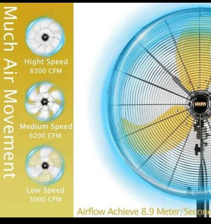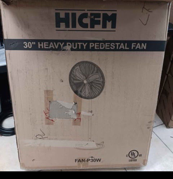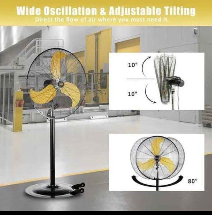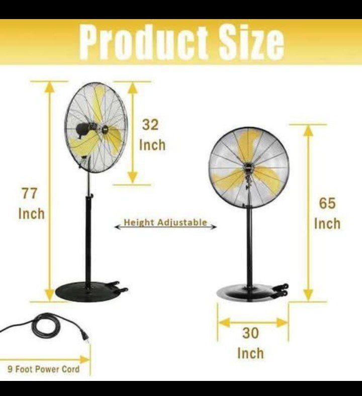 New in box WOCK HiCFM 30 in. Yellow 8300 CFM Oscillating Heavy Duty Pedestal Fan, 1/3 HP Motor, Ball Bearing, 9 ft. Cord - UL Listed