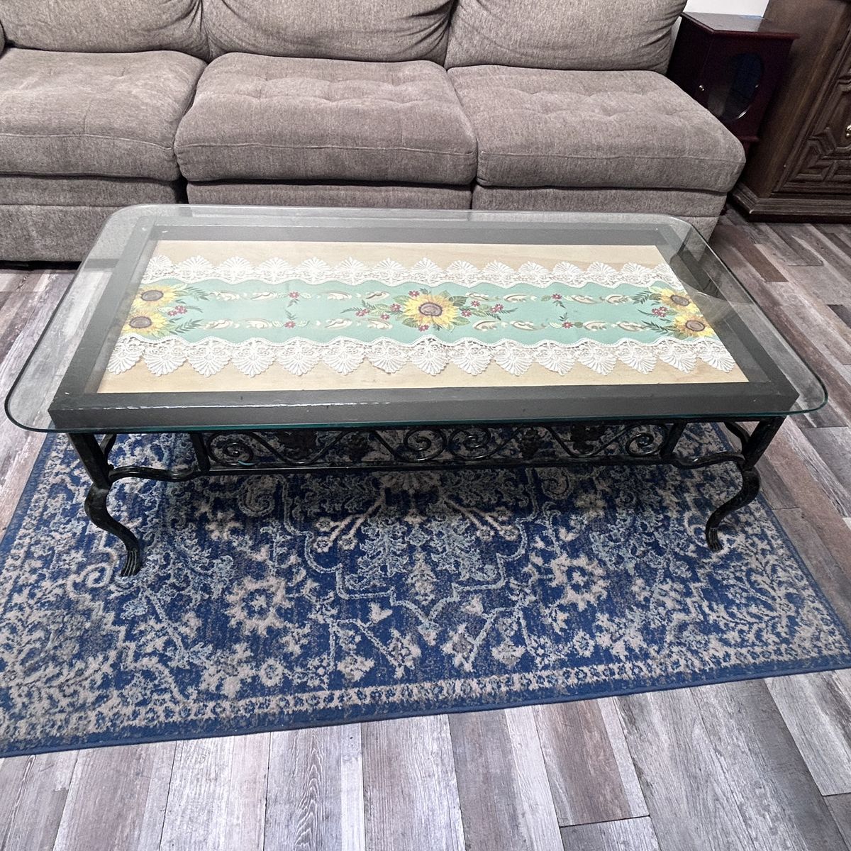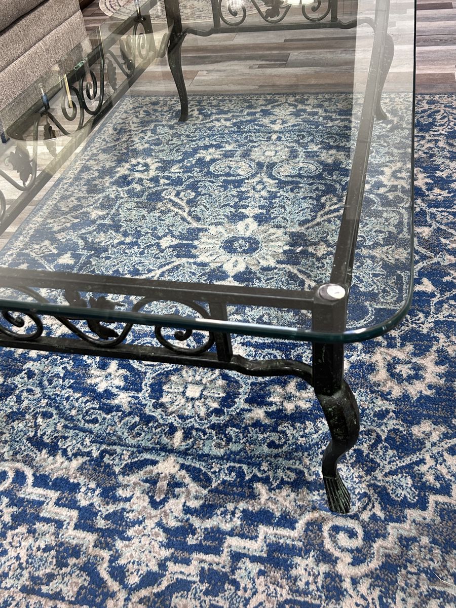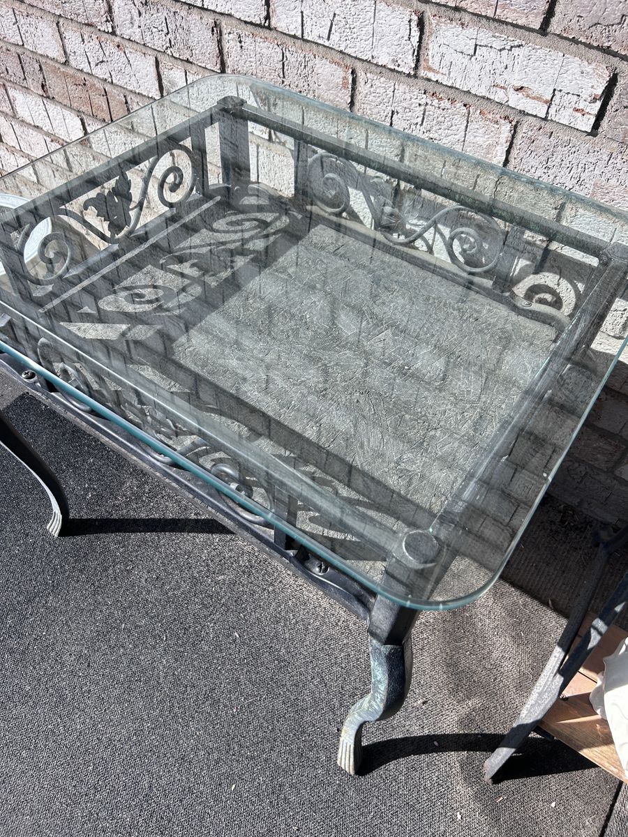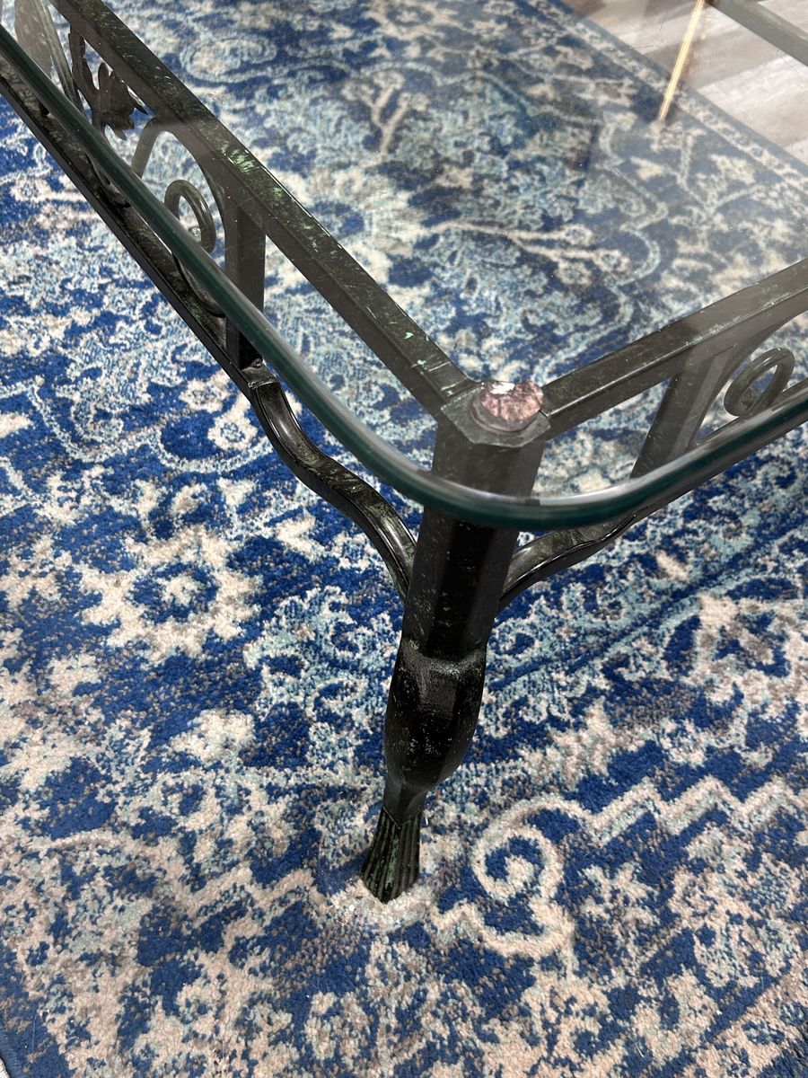 Each has an ornate metal frame with a thick clear glass top, one is a Coffee table, the other a square end table. In good condition. Coffee table has an optional wood top that sits under the glass and can hold small Items for display, like seashells, rocks, coins, marbles, etc and can be added. Right now the wood “tray” has a mounted table runner that you can see in the photographs, giving it a bohemian, European feel. You’re not required to take the wooden addition.