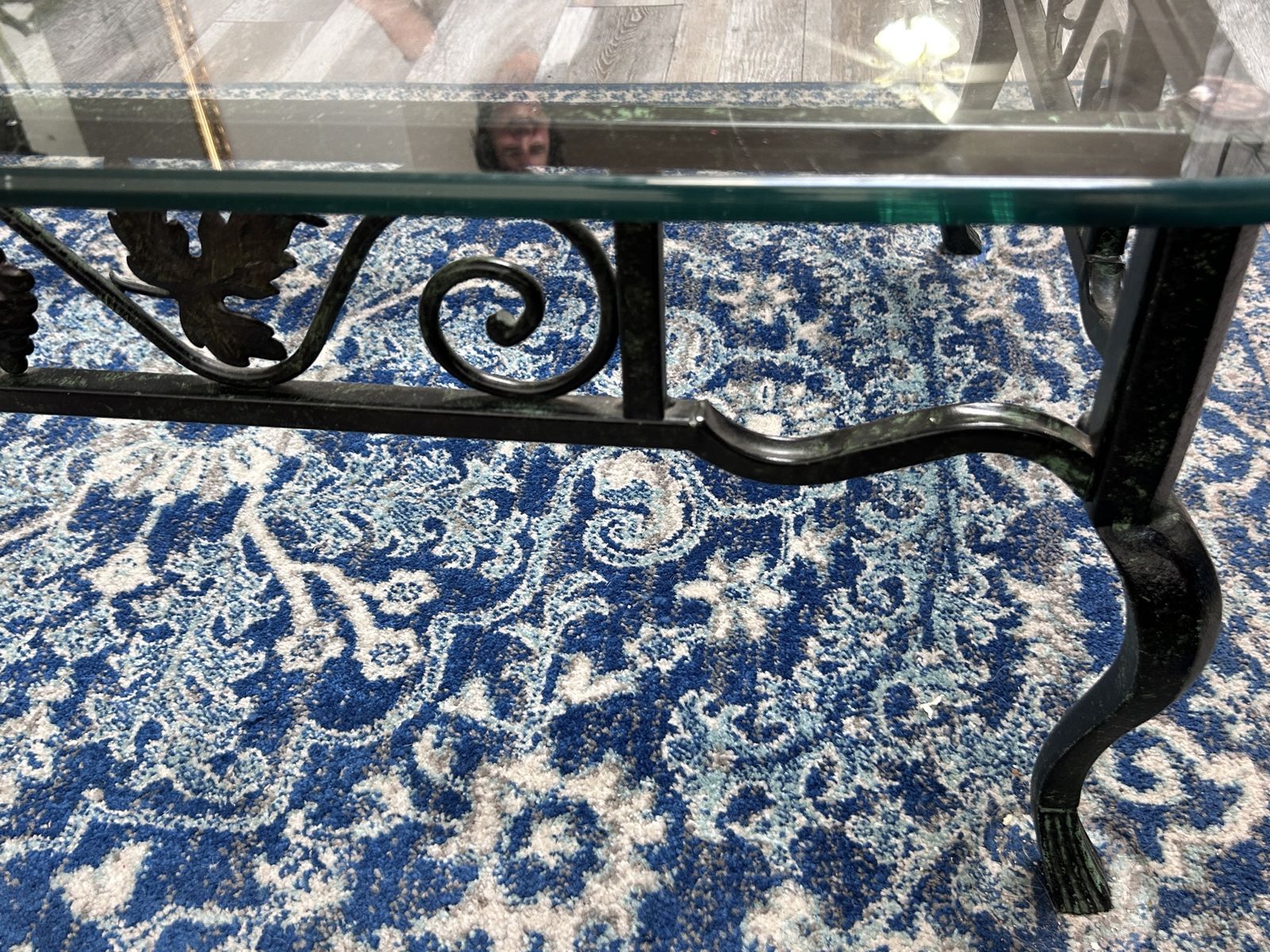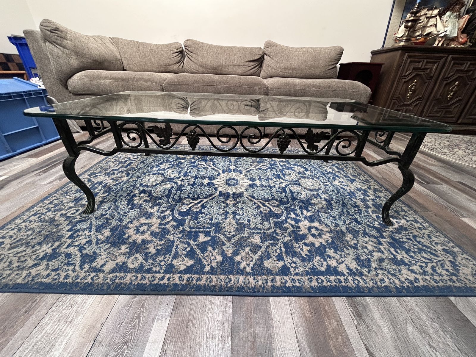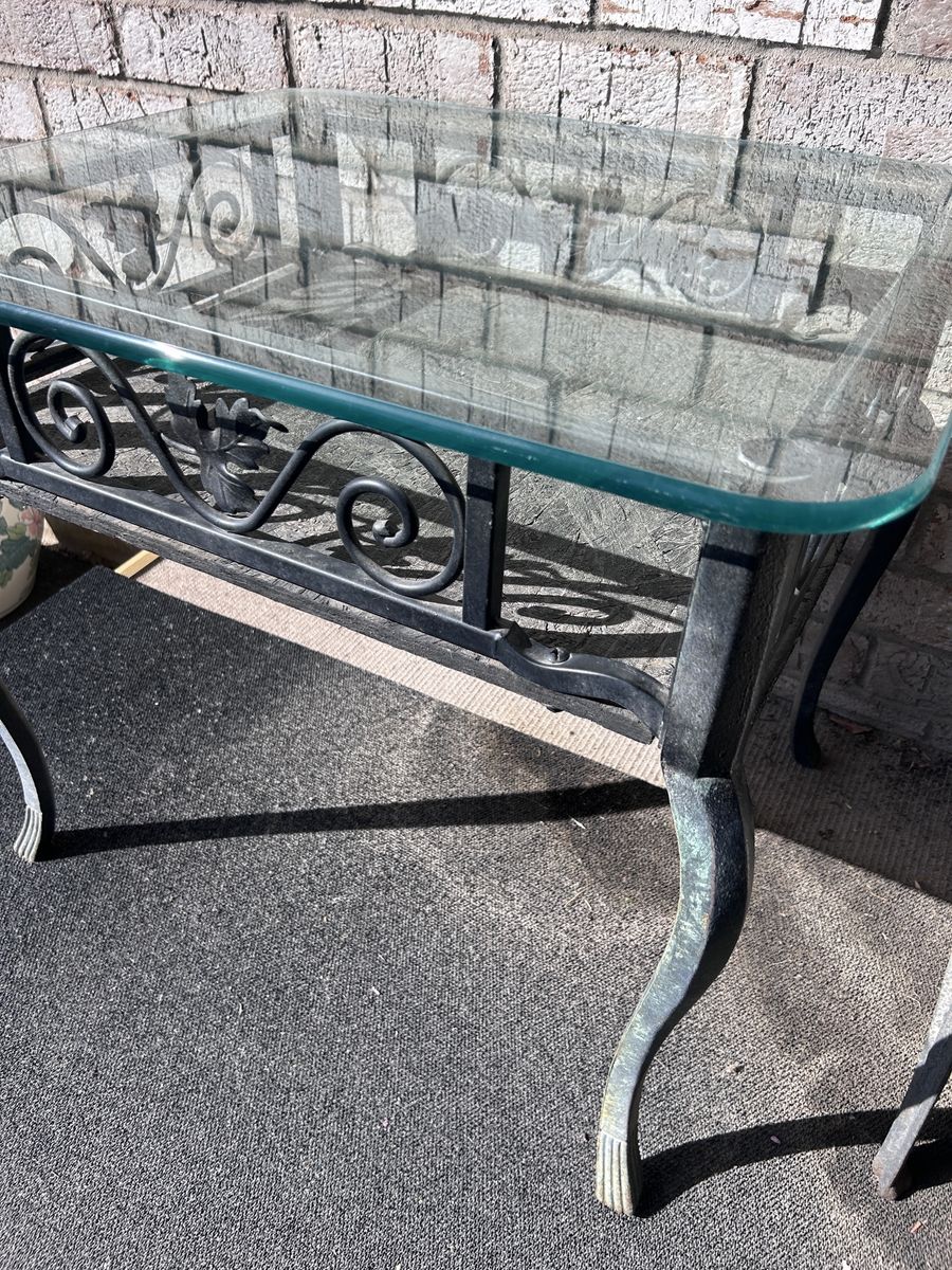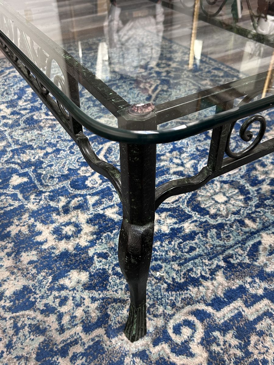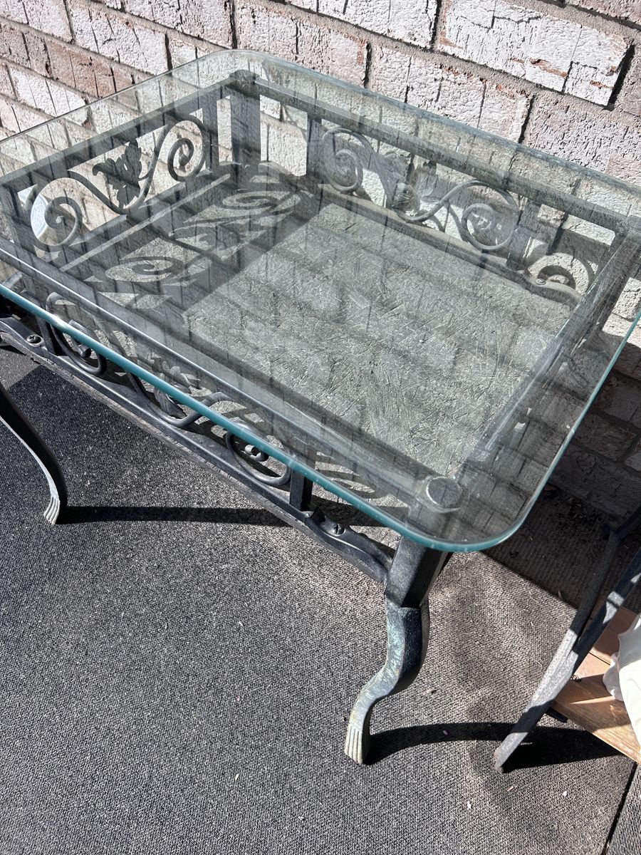 Each has an ornate metal frame with a thick clear glass top, one is a Coffee table, the other a square end table. In good condition. Coffee table has an optional wood top that sits under the glass and can hold small Items for display, like seashells, rocks, coins, marbles, etc and can be added. Right now the wood “tray” has a mounted table runner that you can see in the photographs, giving it a bohemian, European feel. You’re not required to take the wooden addition.