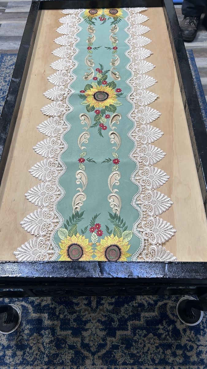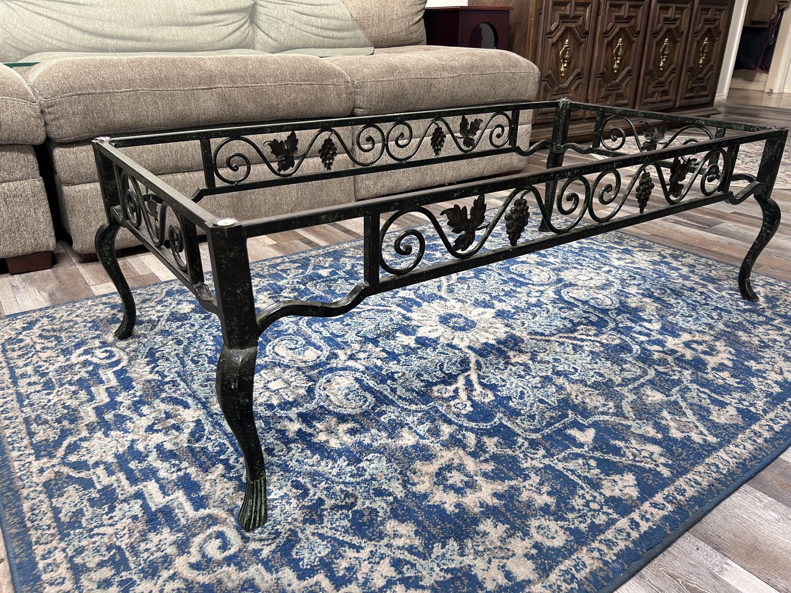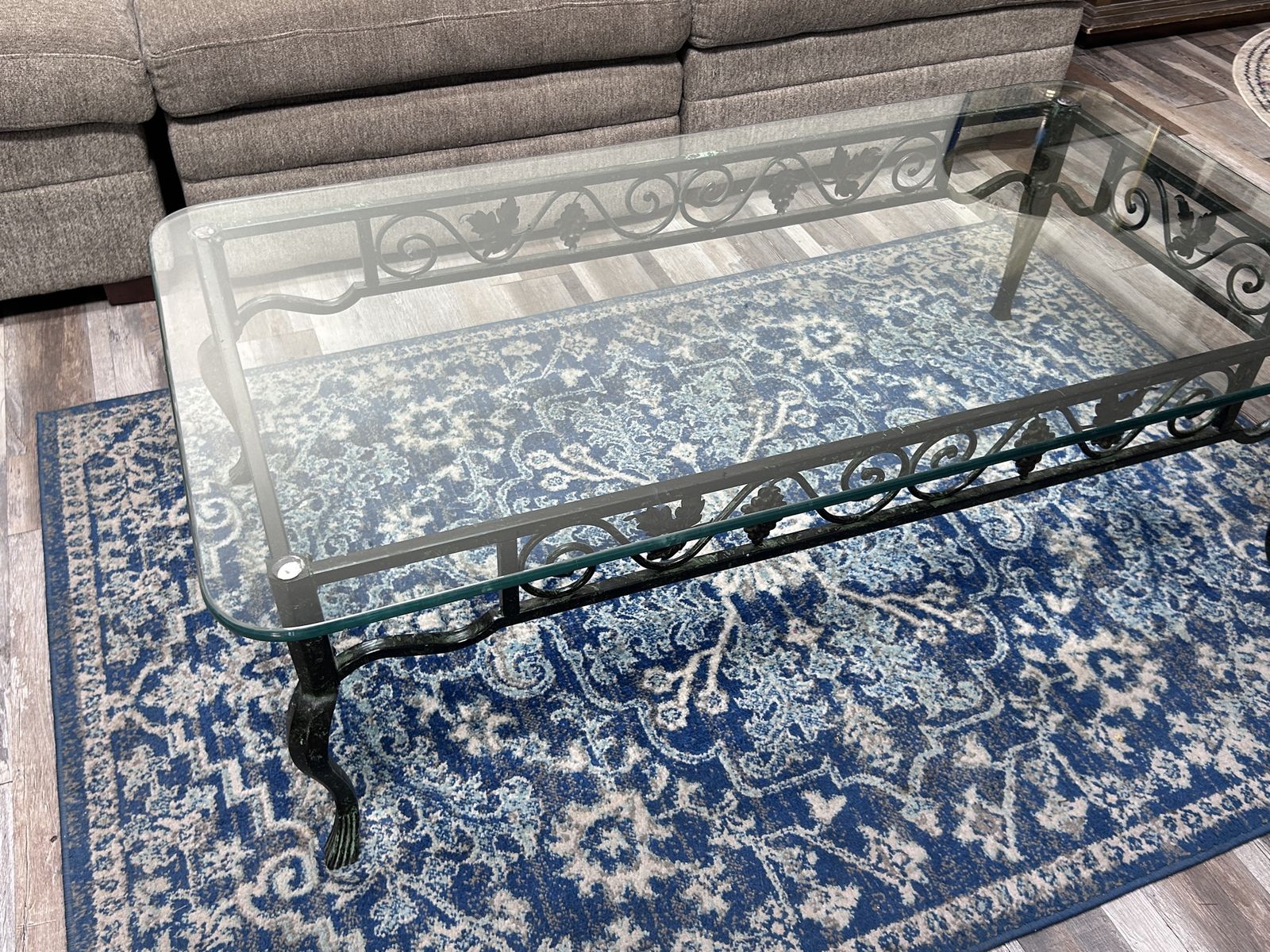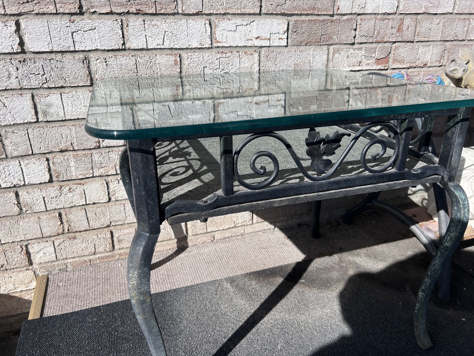 Each has an ornate metal frame with a thick clear glass top, one is a Coffee table, the other a square end table. In good condition. Coffee table has an optional wood top that sits under the glass and can hold small Items for display, like seashells, rocks, coins, marbles, etc and can be added. Right now the wood “tray” has a mounted table runner that you can see in the photographs, giving it a bohemian, European feel. You’re not required to take the wooden addition.