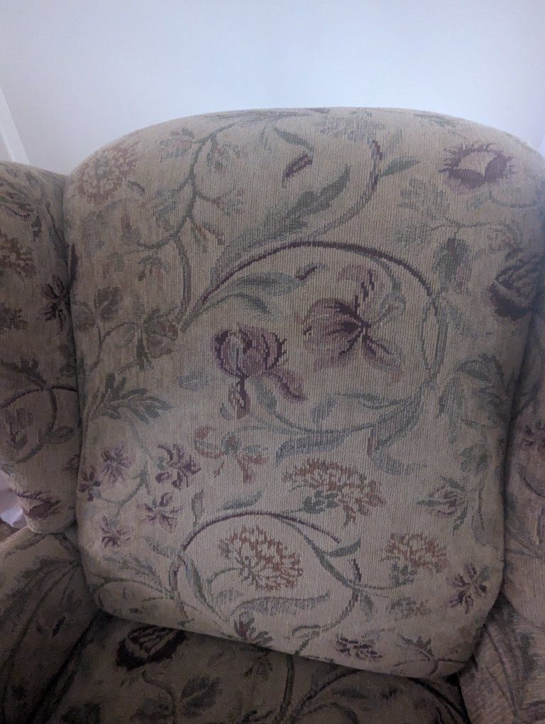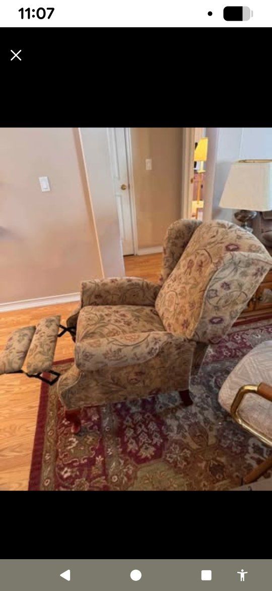 CashAppliving room chair with flowered fabric, chair does recline & has footrest 40 x 27 x 32