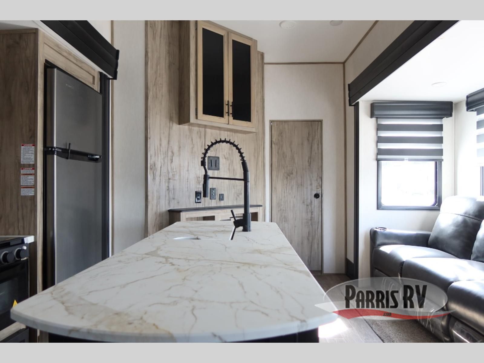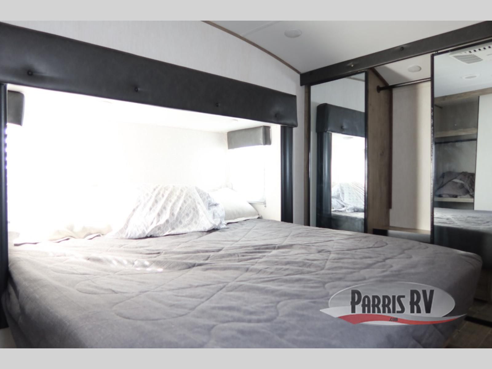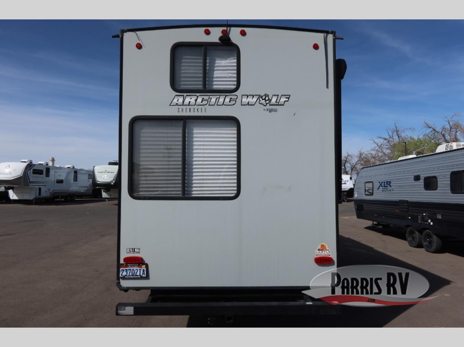 You will have amazing residential comfort in the Forest River Cherokee Arctic Wolf Suite fifth wheels! These units have a "SuperStor" dual-cavern basement storage compartment to allow you to bring more gear, and they have been constructed with a "ToughBend" rigid skirt metal design, a 1x engineered wood "SuperTruss" roof structure with 3/8" decking, and a 5/8" tongue-and-groove plywood floor decking. Each model includes Leash Latch pet safety technology, an outside shower with hot/cold water, preparations for an exterior TV, motion-sensing lighting, and a smart monitor panel with smart phone Bluetooth connectivity. The supersized central air conditioning unit (15,000 BTU) with quick cool air dump feature and second oversized 15,000 BTU ducted air conditioner will cool your unit down in a snap when you camp in the hot summer months.