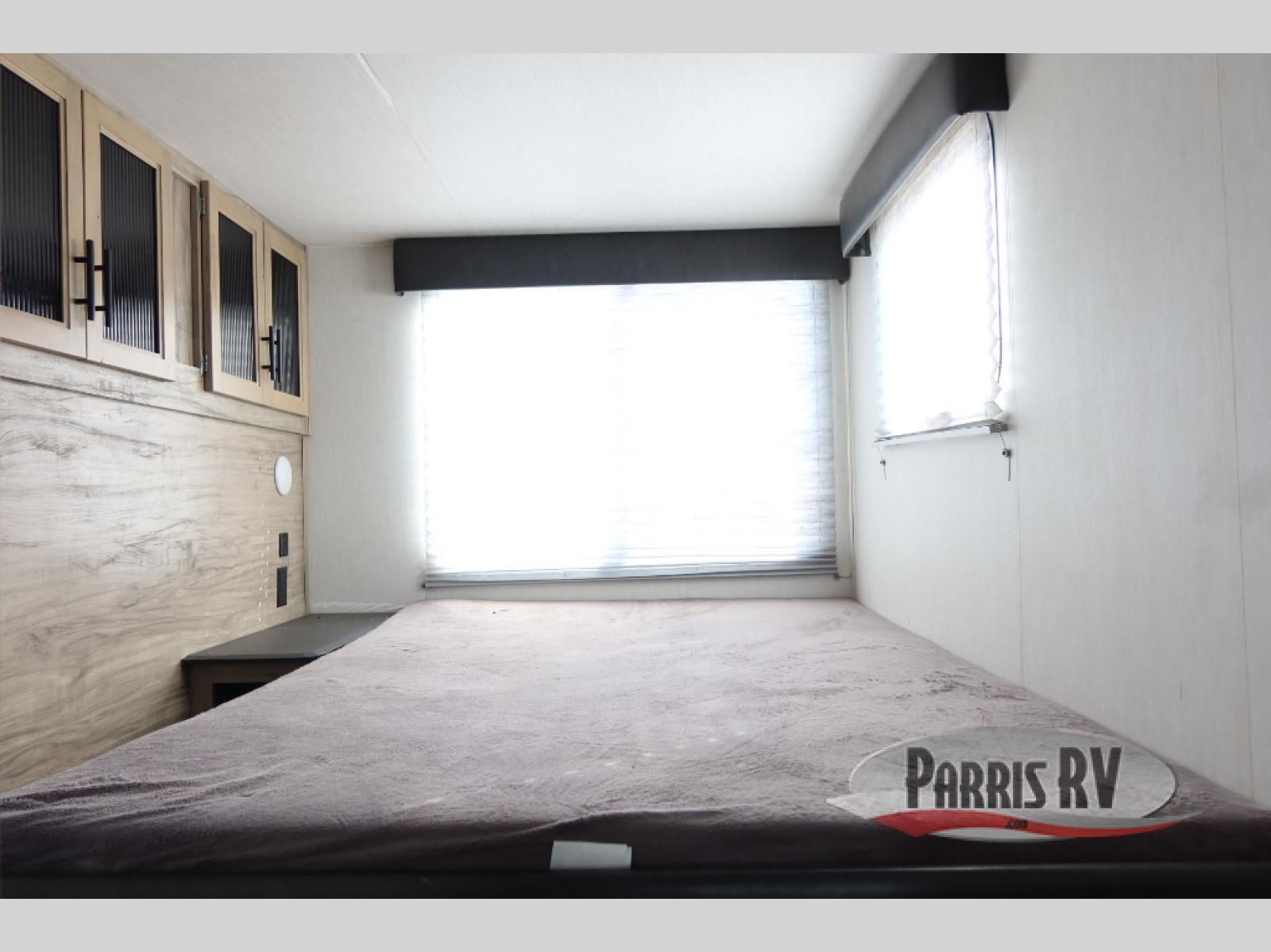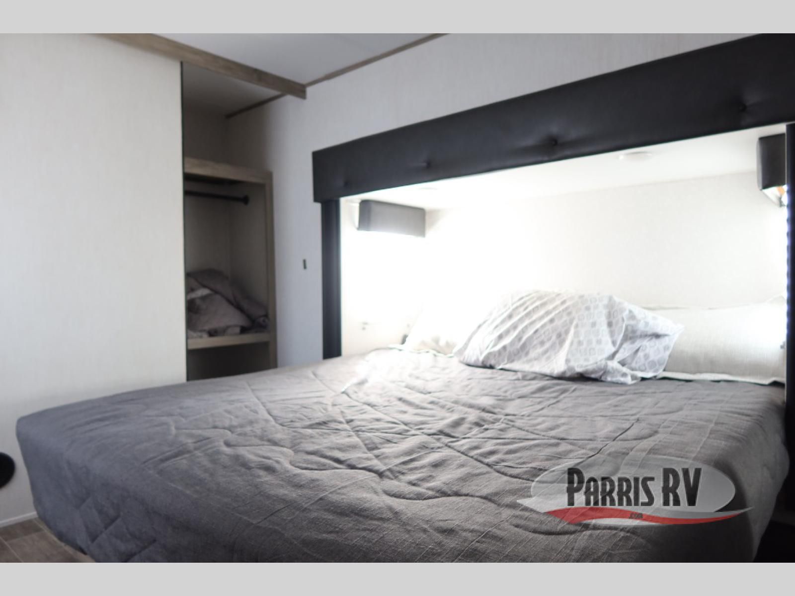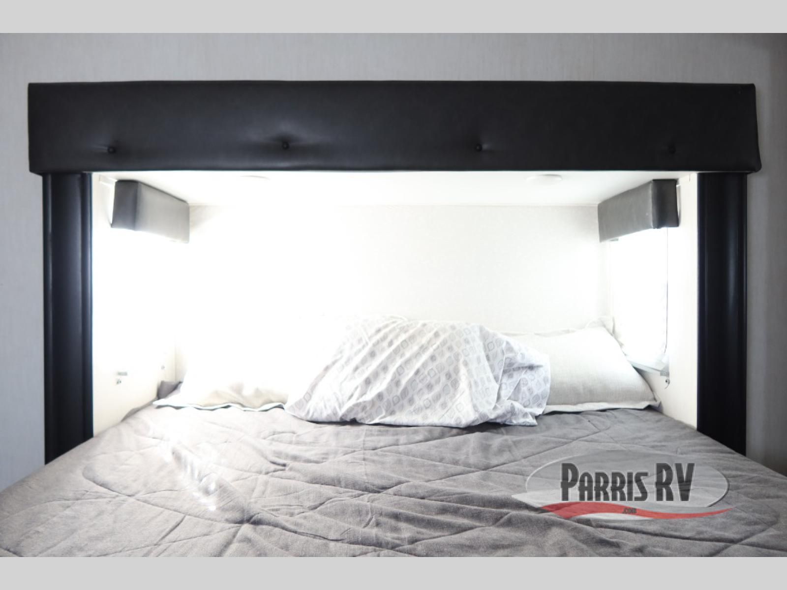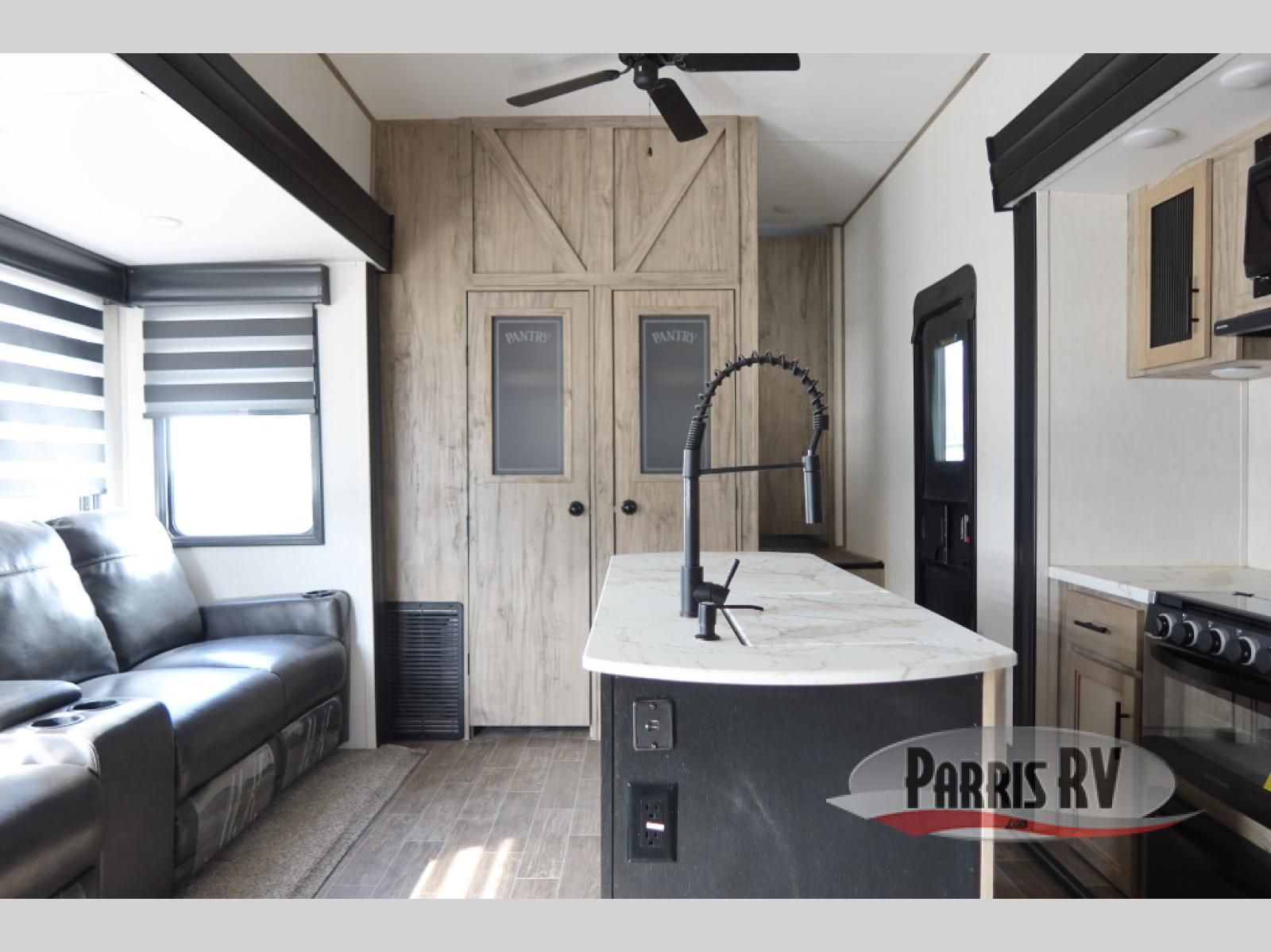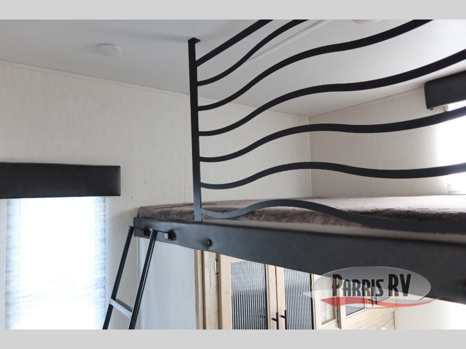 This Cherokee Arctic Wolf Suite fifth wheel is an excellent choice if you have a large family that wants to get away! Not only is there a private bedroom up front for you, but there is also a bedroom suite in the back. This suite has a 54" x 74" bed next to some wardrobe storage, a 60" x 80" loft above the bed with a ladder, a half bathroom all to itself, and the second exterior entry door. What a space! You'll also be highly impressed with the living area because it has a large slide that holds two sets of home theater seating with removable tables in front. Now you can sit down and enjoy dinner while you watch the optional residential-size LED TV that you added above the fireplace. The large pantry is another feature you'll appreciate since it can store all of the food needed to feed your group, and the Juice Pack 50W solar panel will help your unit stay powered wherever you camp.