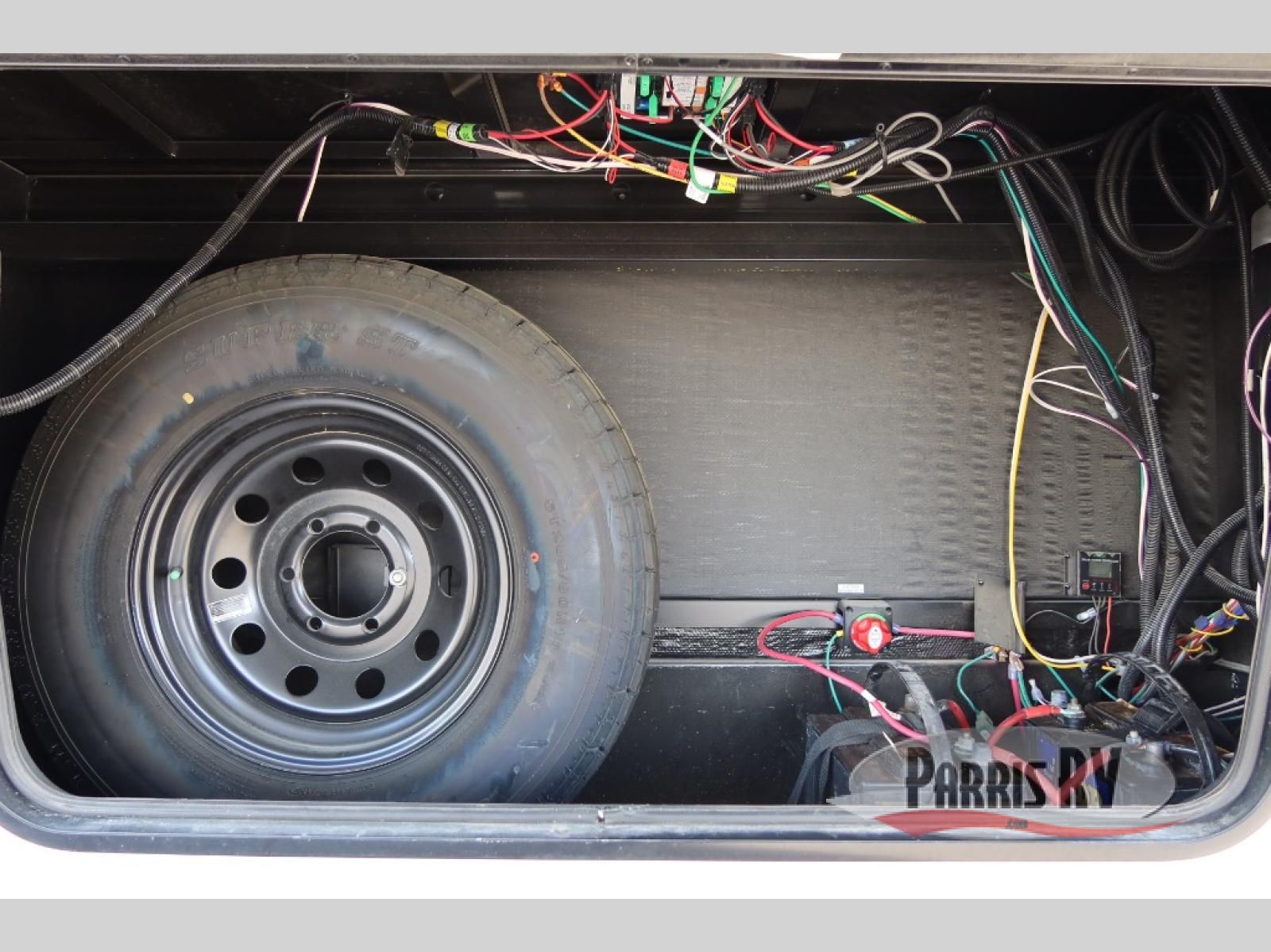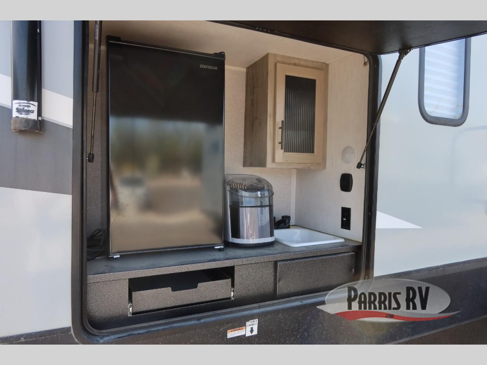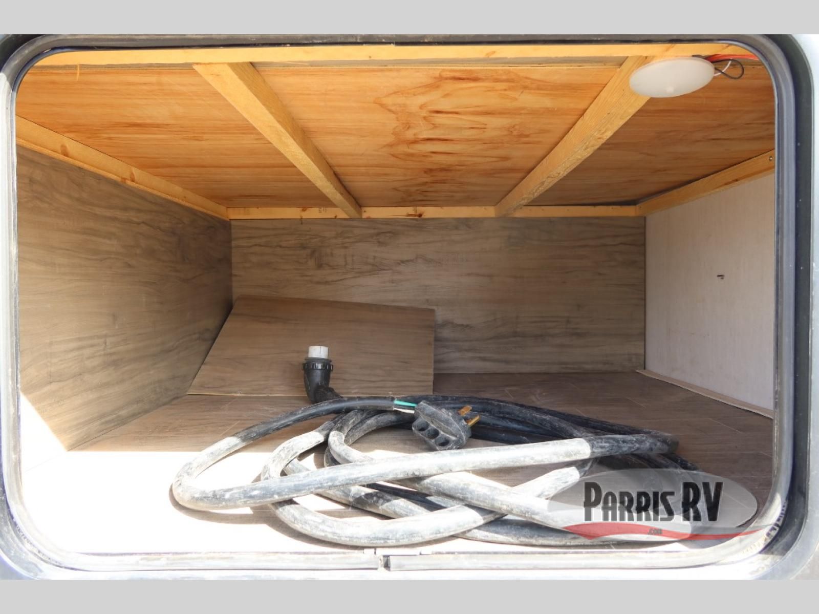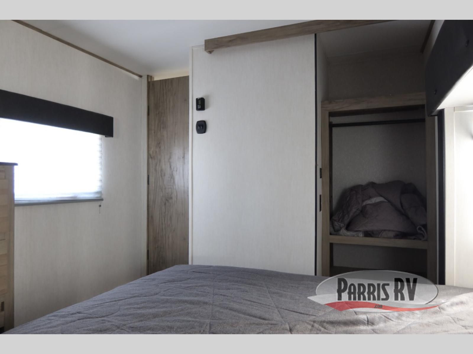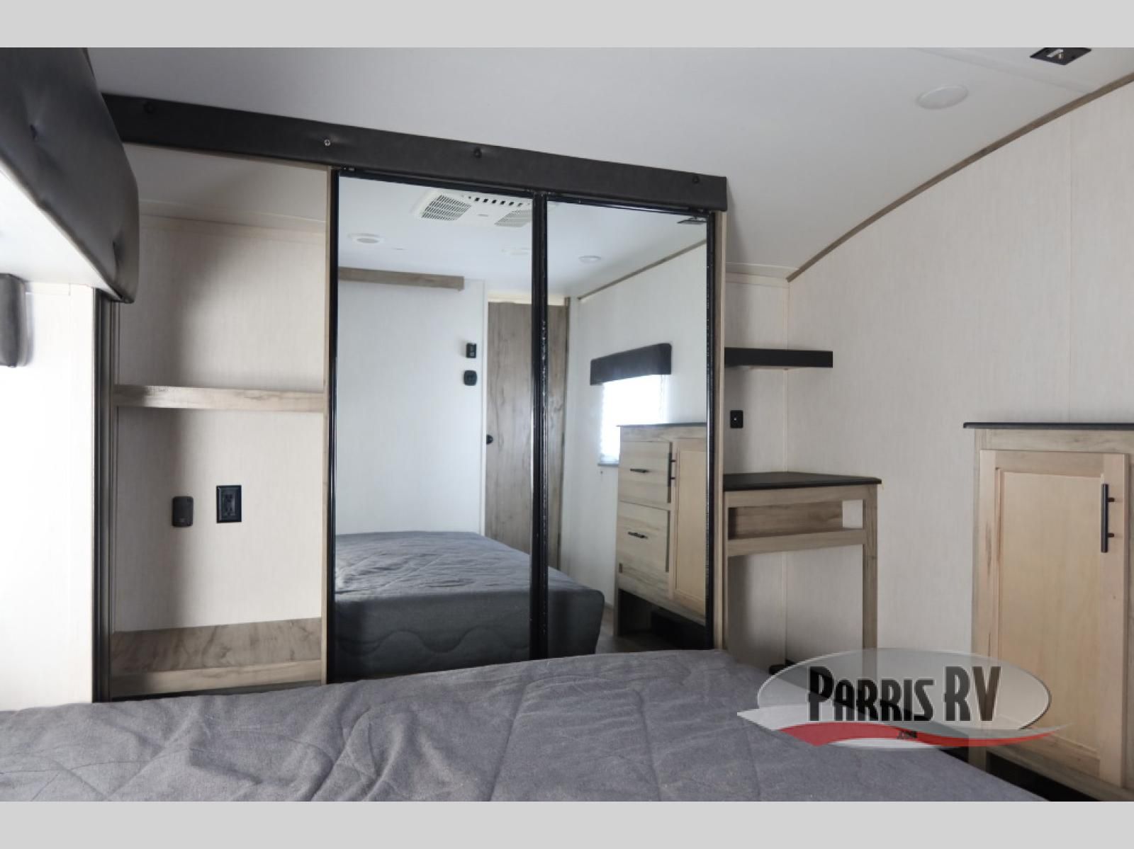 This Cherokee Arctic Wolf Suite fifth wheel is an excellent choice if you have a large family that wants to get away! Not only is there a private bedroom up front for you, but there is also a bedroom suite in the back. This suite has a 54" x 74" bed next to some wardrobe storage, a 60" x 80" loft above the bed with a ladder, a half bathroom all to itself, and the second exterior entry door. What a space! You'll also be highly impressed with the living area because it has a large slide that holds two sets of home theater seating with removable tables in front. Now you can sit down and enjoy dinner while you watch the optional residential-size LED TV that you added above the fireplace. The large pantry is another feature you'll appreciate since it can store all of the food needed to feed your group, and the Juice Pack 50W solar panel will help your unit stay powered wherever you camp.