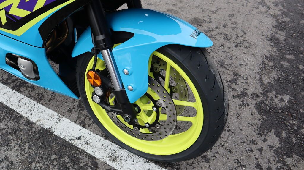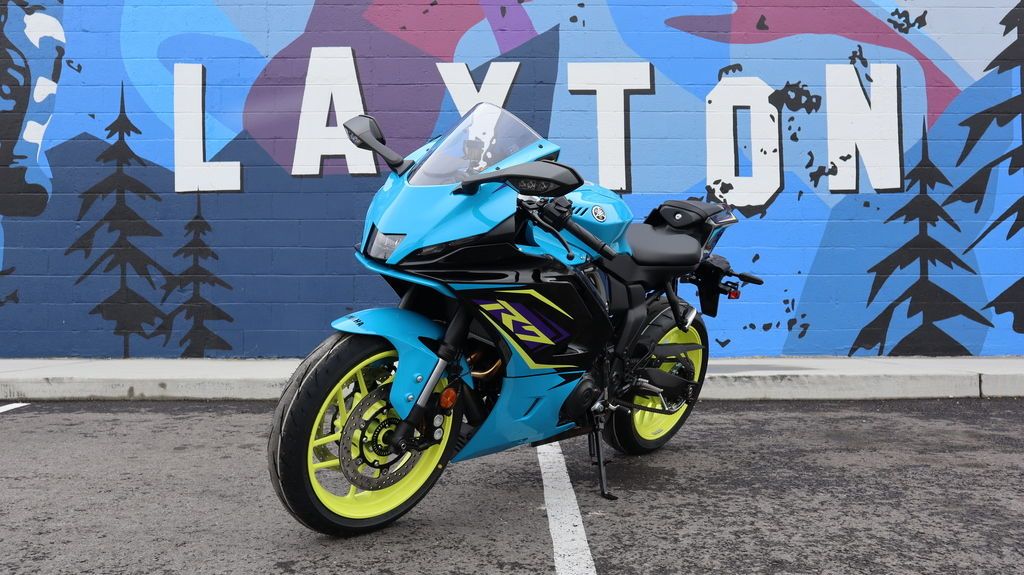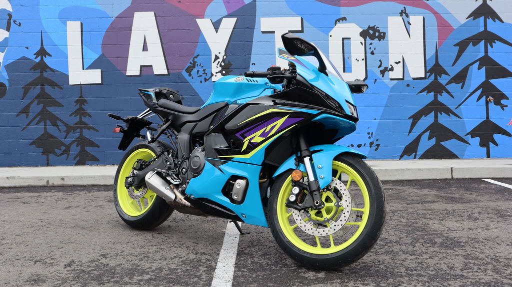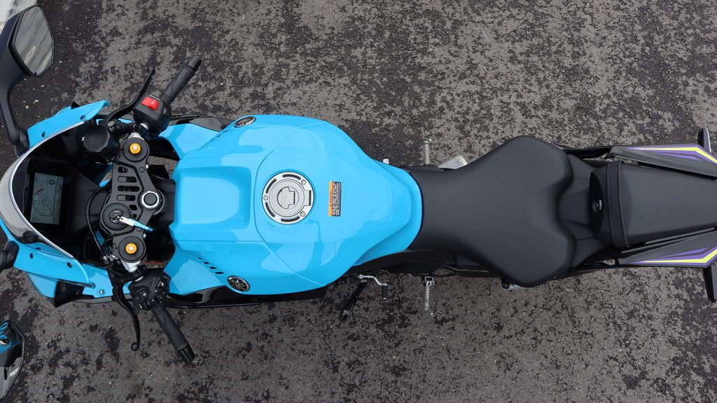 Sharp aerodynamic bodywork features a compact front fairing, slim contoured side fairings, aerodynamic winglets, and LED turn signals integrated into the mirrors, finished with Yamaha R-Series DNA throughout.