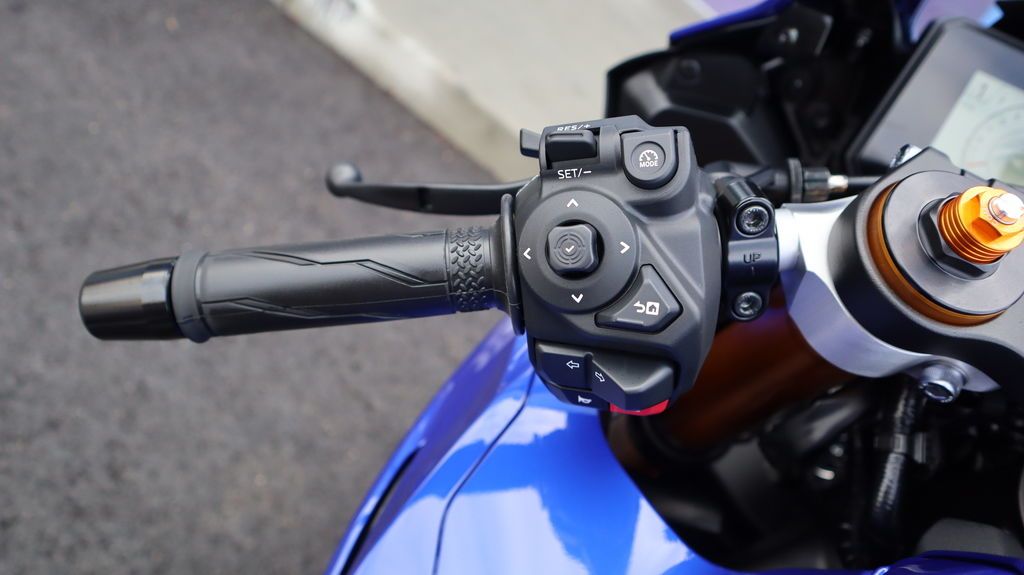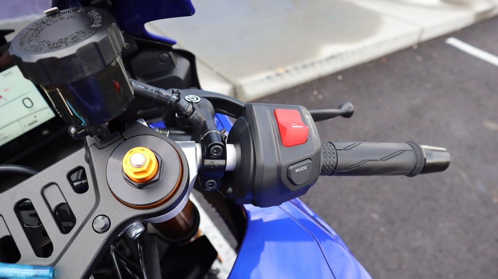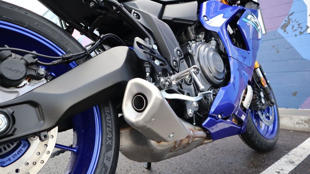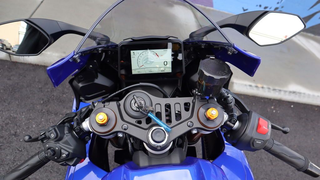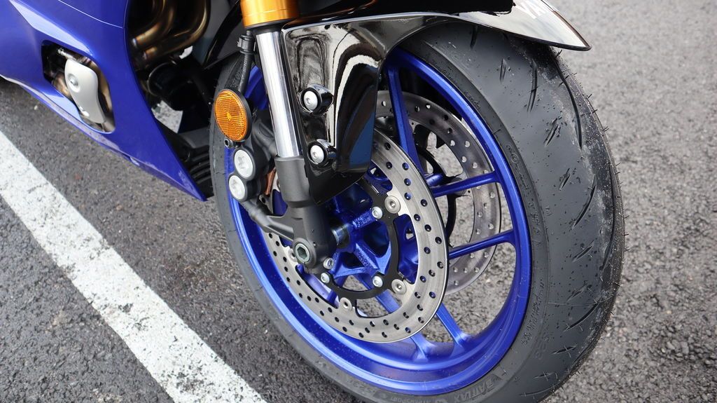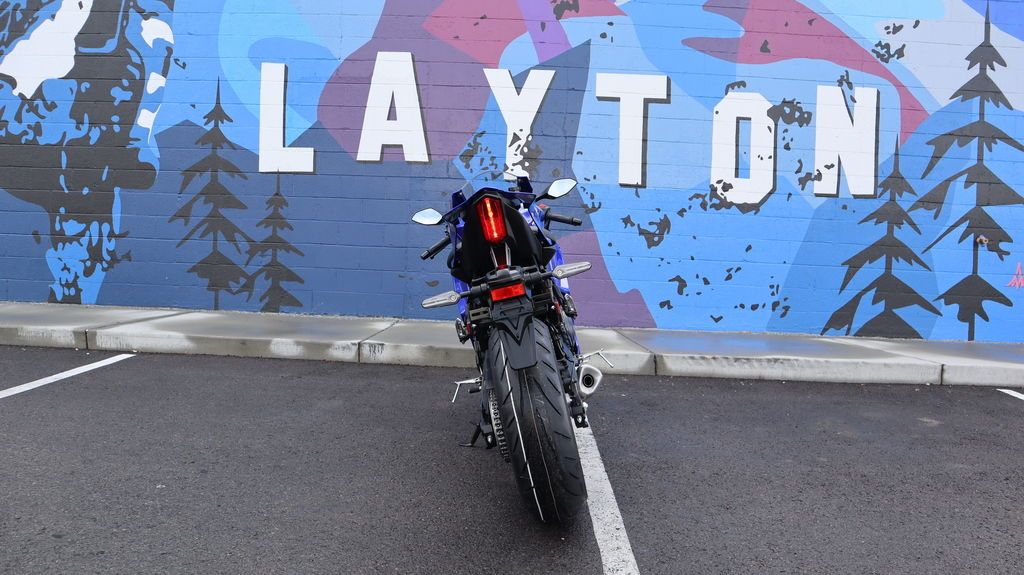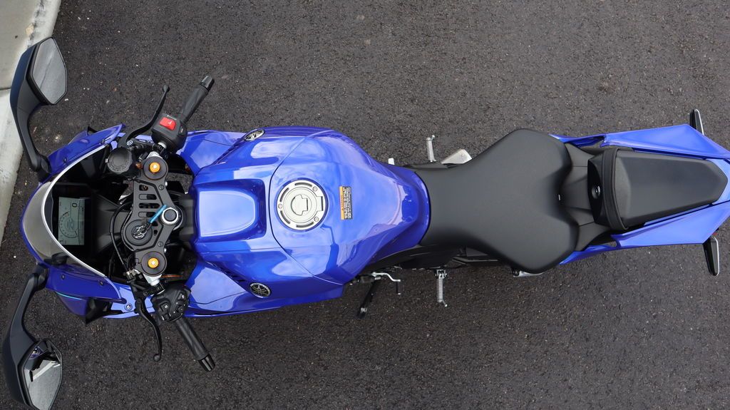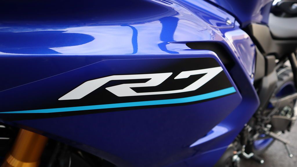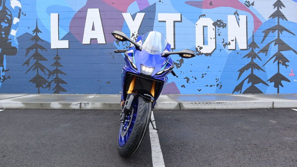 Sharp aerodynamic bodywork features a compact front fairing, slim contoured side fairings, aerodynamic winglets, and LED turn signals integrated into the mirrors, finished with Yamaha R-Series DNA throughout.