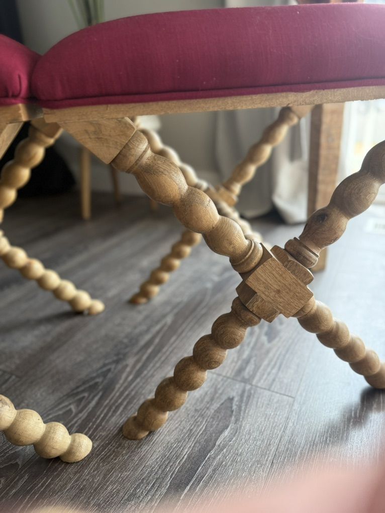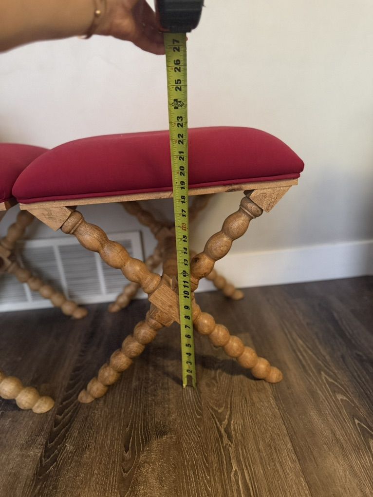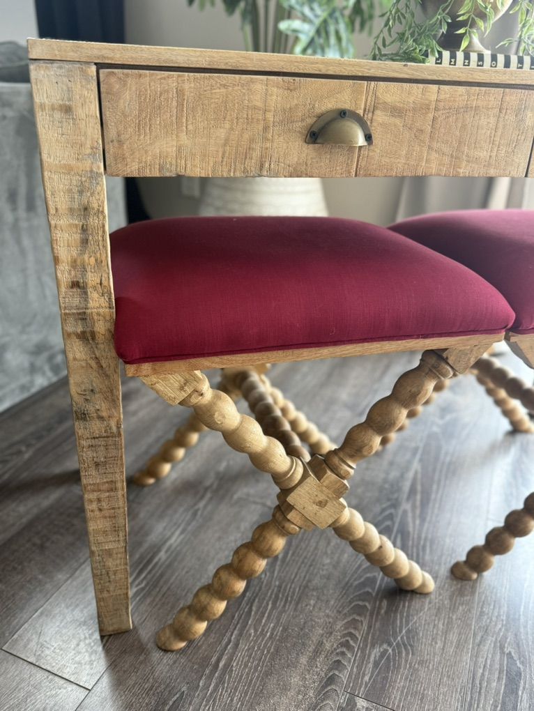 VenmoC.G sparks made local brand in Utah. High quality. Real wood. X-base or curule style stools with feature distinctive bobbin-turned legs and vibrant deep magenta upholstered seats with coordinating desk/entry table. Price dramatically dropped to move quickly. Buy both ottomans or desk separately if preferred, however ottomans need to be sold together. Lehi. Pick up only. Final price $600.00 First come first serve.