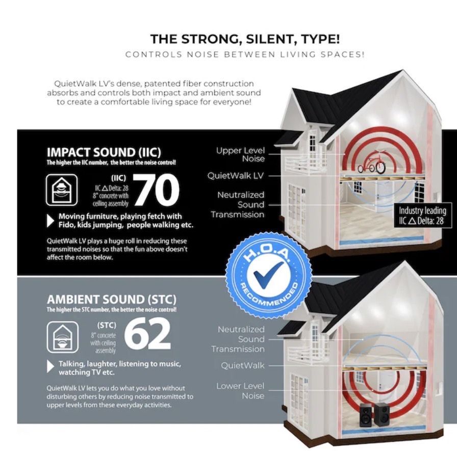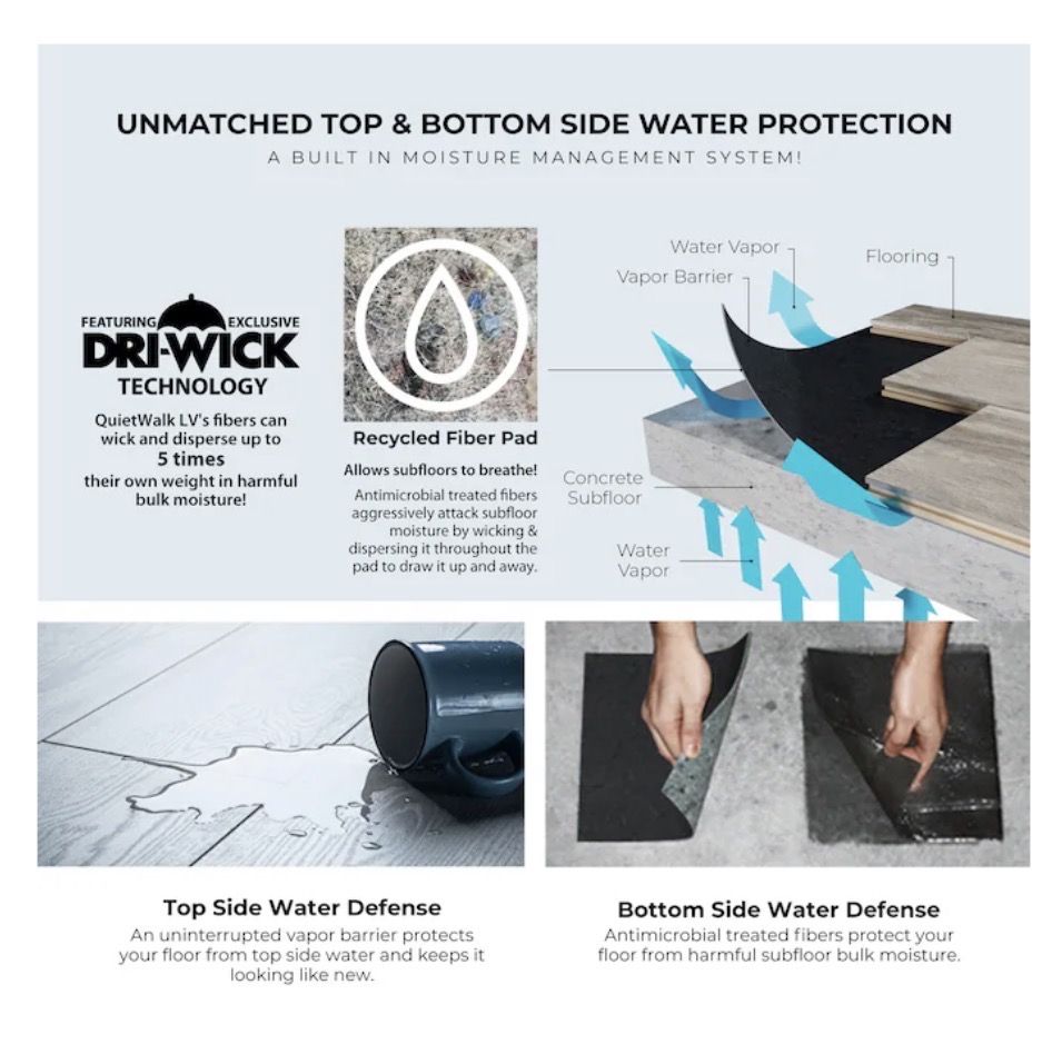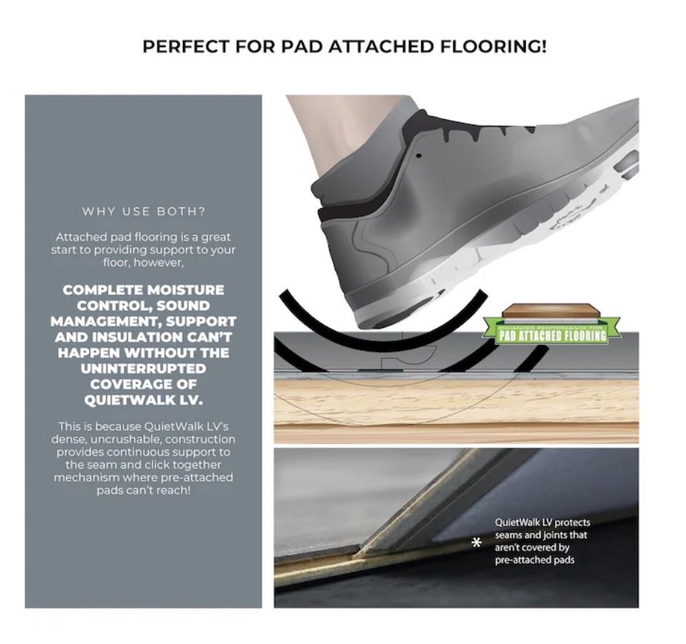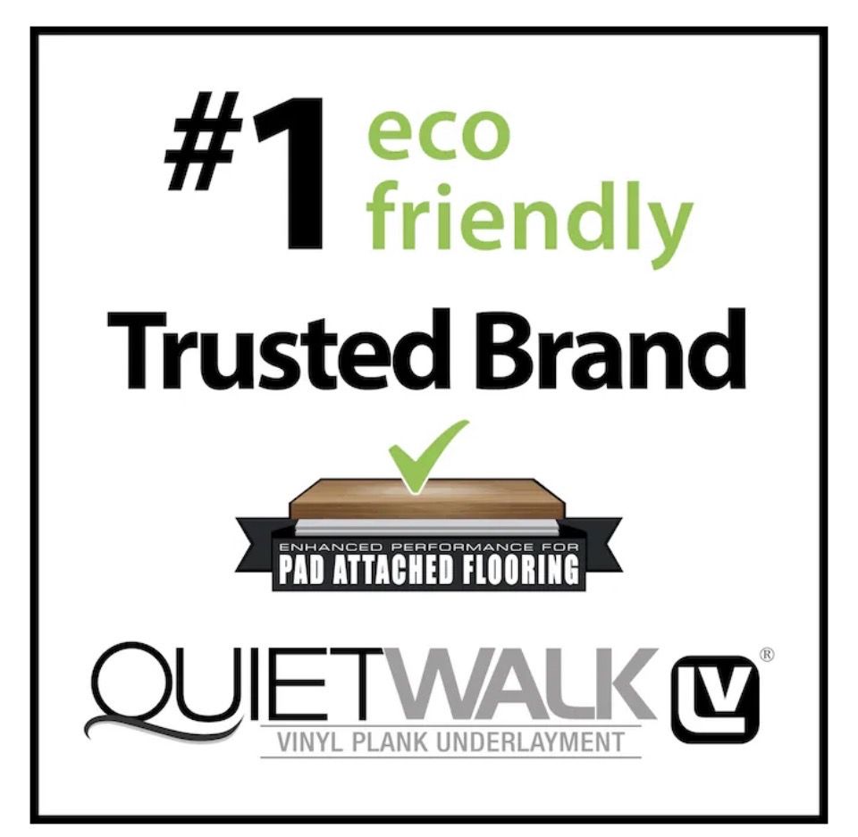 360 sq. ft. coverage - roll size 6 ft. x 60 ft. for full-room installs Maximum versatility - works with LVP, LVT, SPC, WPC, laminate, and engineered wood (4 mm+) LAMINATE AND FLOATING HARDWOODS: For best performance under laminate and floating hardwoods view QuietWalk here. Superior sound reduction - Delta IIC 28, IIC 70, STC 62 for reduced noise transfer Enhanced support and protection for flooring with pre-attached pads Advanced moisture protection - Dri-Wick fibers + attached 6-mil vapor barrier Supports all install types - floating, glue-down, and nail-down applications Compression-resistant support - prevents floor deflection and maintains long-term performance Radiant heat compatible - approved for use with in-floor heating systems, such as QuietWarmth. GREENGUARD Gold Certified - low VOC emissions for healthier indoor air Mold & mildew resistant - antimicrobial treated fibers inhibit growth Made in the USA from Recycled Fibers - Helps reduce landfill waste while delivering high performance Easy installation - rolls out flat with lip-and-tape system APPROVED FOR IN-FLOOR RADIANT HEAT SYTEMS: allows heat to permeate evenly while helping to protect the floor covering material from thermal shock, achieve warmth with QuietWarmth radiant heat system NALFA CERTIFIED: QuietWalk LV meets all underlayment standards set by the North American Laminate Floor Association (NALFA).