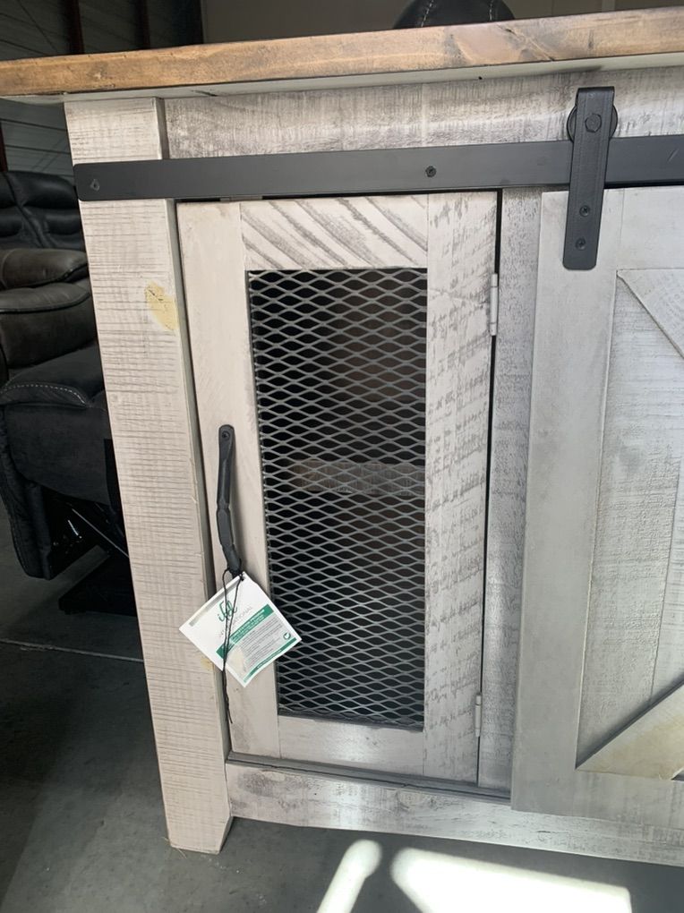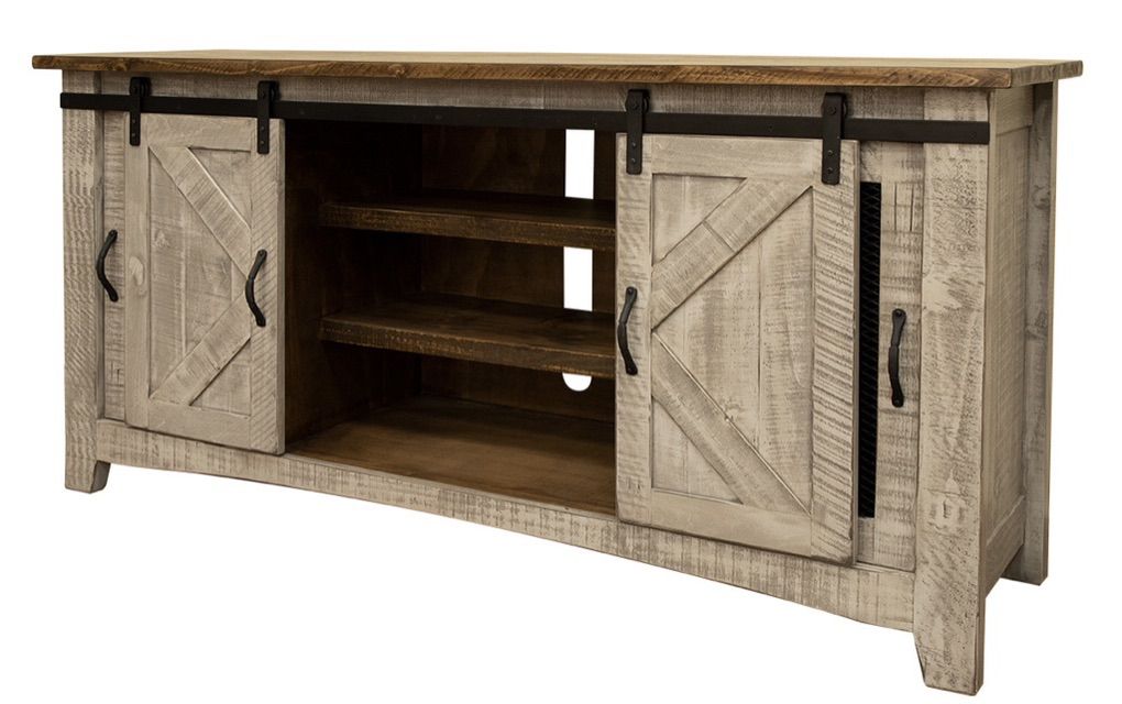 ApplePay100% solid pine offers great durability. Multi-step lacquer in a sophisticated Oyster finish. All shelves are fixed. Tv stands feature wire management on the back panel to accommodate several electronics. Doors feature iron mesh on panels.