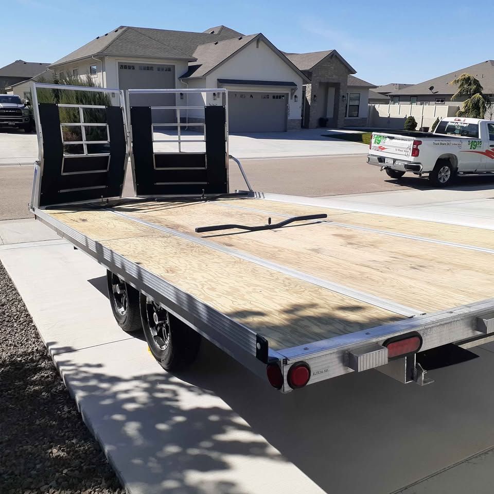 2025 Triton Elite 101-16. The trailer deck is 101" wide and 16ft long with adjustable tie down points. It has every option offered by Triton including drive on/drive off front, electric brakes, 15" tires and premium wheel option. I sold the toys and no longer need the trailer. It was used once towing it from Utah back to Idaho. It has a 5000lb weight capacity and can be used for snowmobiles, ATV's or side by sides