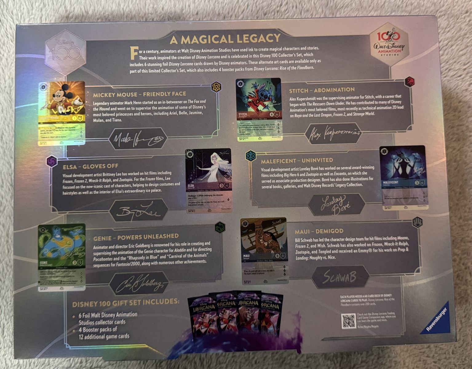 PayPalDisney Lorcana Trading Card Game 100 Year Collector's Edition. Includes 6 foil Disney Lorcana cards drawn by Disney animators. Also inside package are 4 booster packs from Rise of the Floodborn. Factory Sealed.