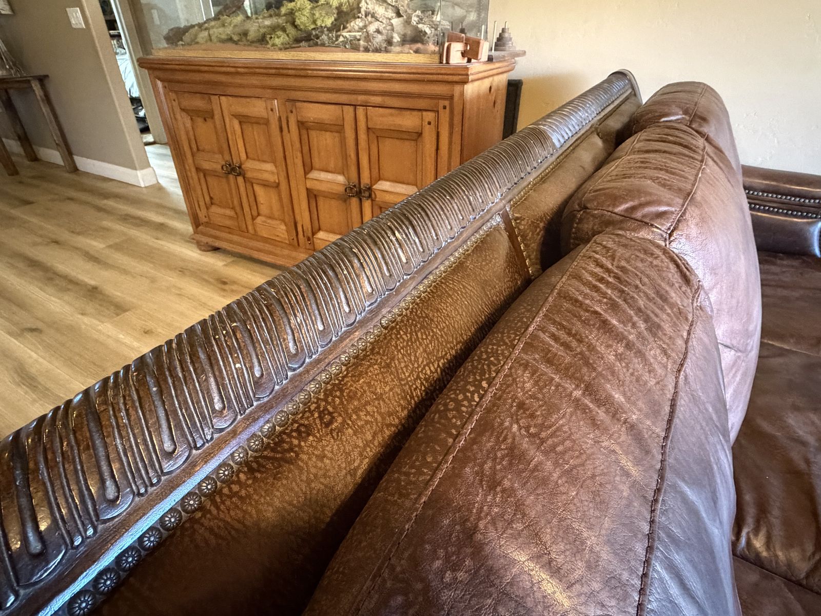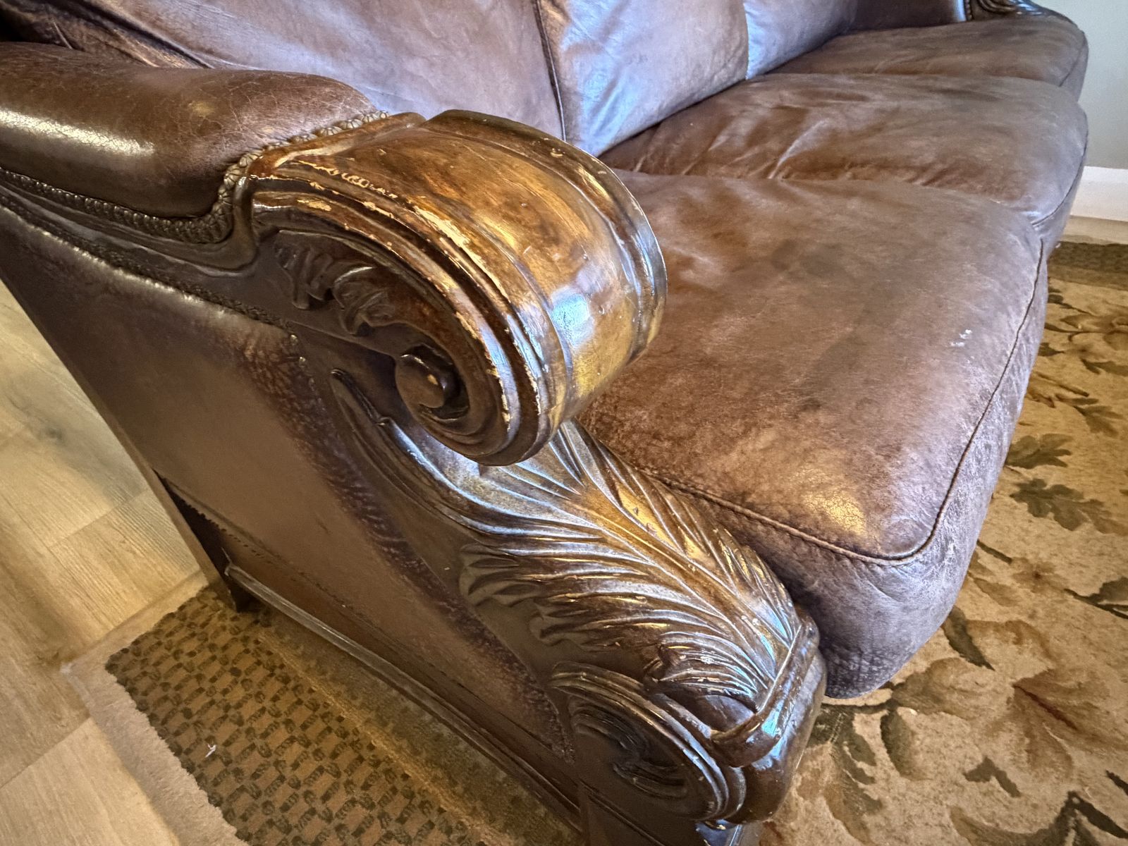 VenmoStunning traditional sofa with intricate hand-carved solid wood detailing — acanthus leaf scrollwork on the arms, ornate carved detailing along the back rail, and carved bun feet. Rich cognac/tobacco brown genuine leather upholstery with nailhead trim. Foam-core cushions wrapped in a down & feather blend for that perfect combination of support and luxury.