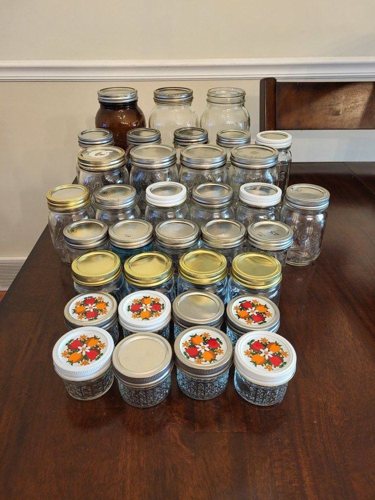 Zelle35 jars ranging in size from 4 oz to half gallon. Most have lids and rings. Quality varies.