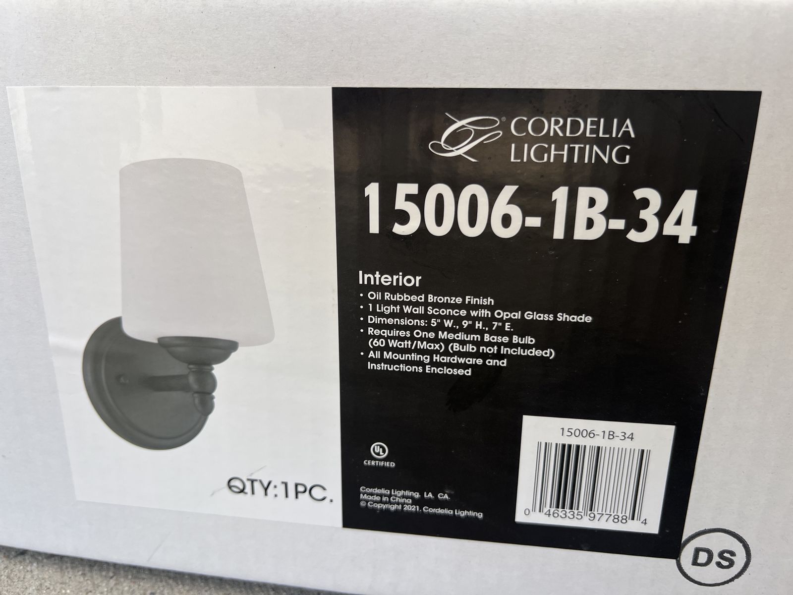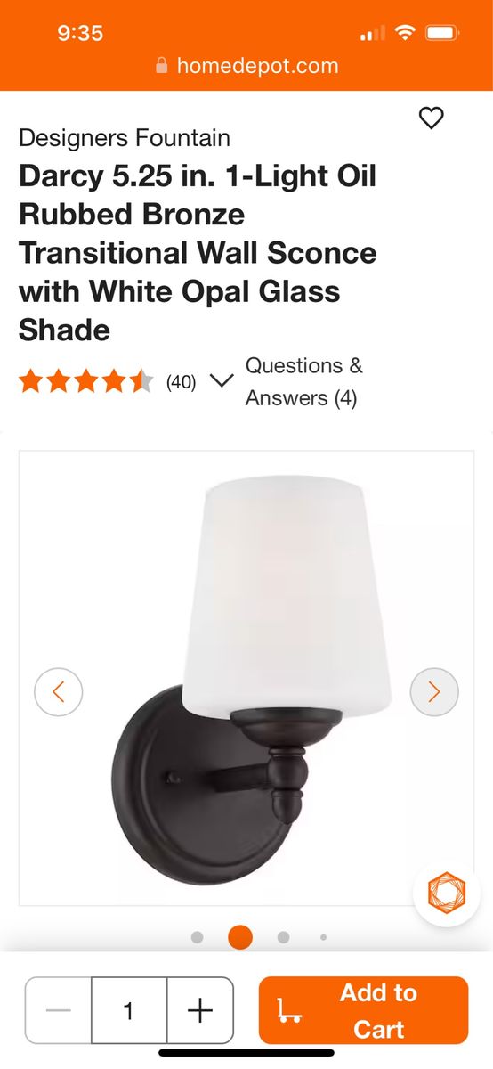 From the Home Depot website- The Darcy family of light fixtures adds a transitional touch to your interior decor. With its warm oil rubbed bronze finish and opal glass shade, the Darcy wall sconce is sure to be a conversation piece and a visual joy for years to come. This wall-mounted light is perfect for hallways, bedrooms, bathrooms, and anywhere else you may need some accent lighting. Darcy wall sconces are easy to install with included instructions and hardware, and should be hardwired to an in-wall 120V power source. This sconce light requires (1) E26 60W max incandescent bulb, or the LED equivalent, which needs to be purchased separately. Be sure to check out other fixtures in the Darcy collection on this site.