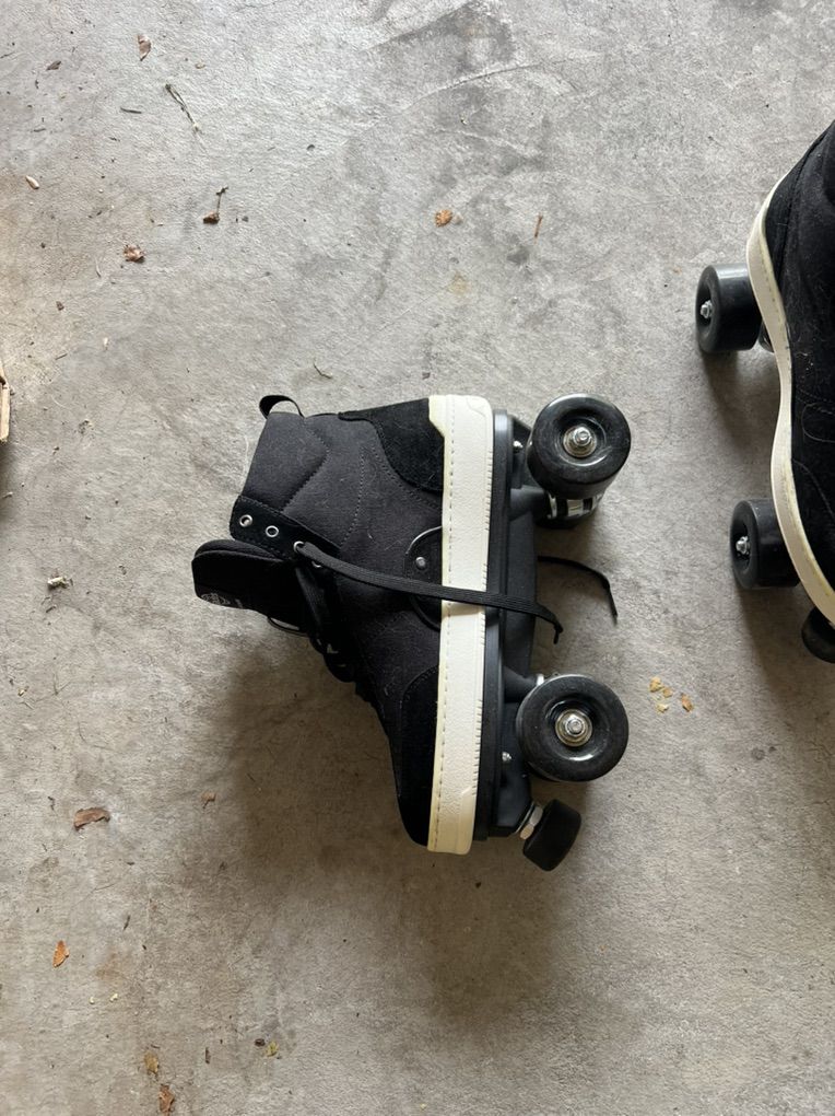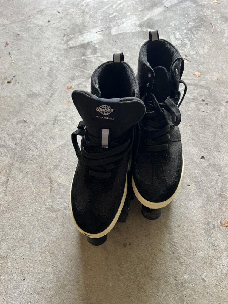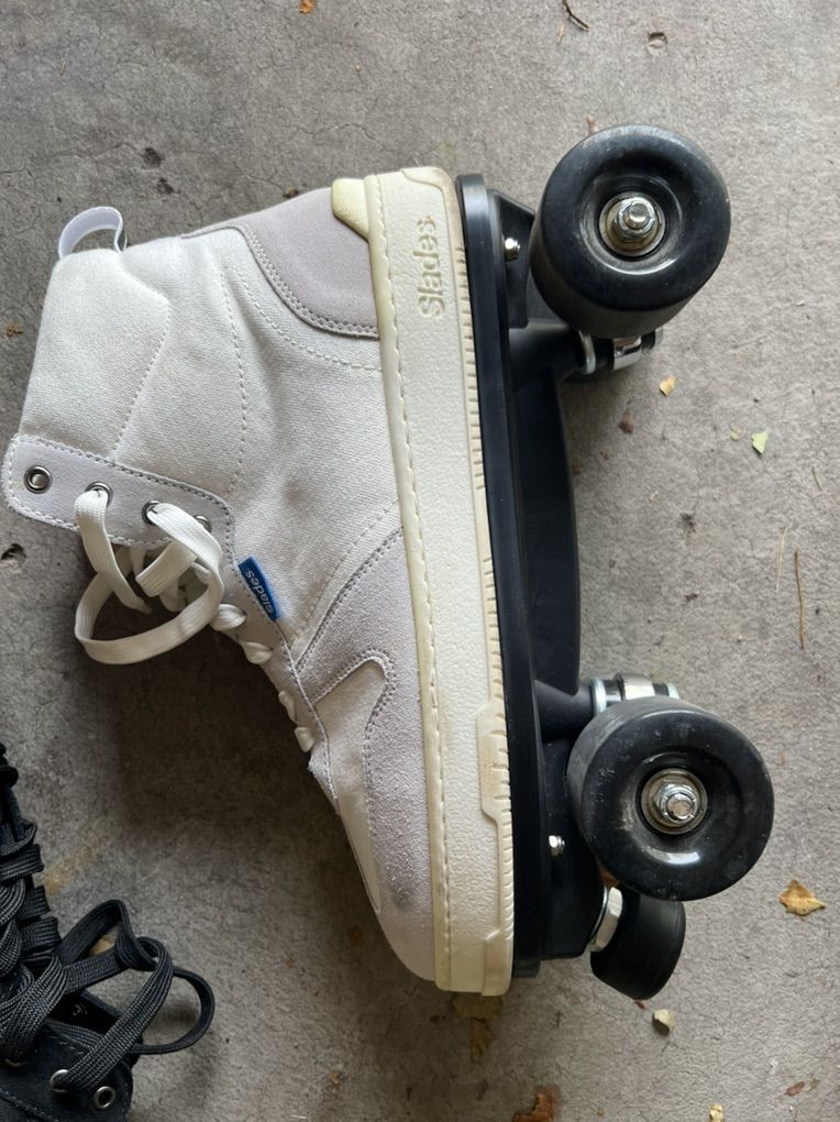 Roller skate shoes with detachable plates. They were a gift and only tried once. One pair black and one pair white. About a size 10.