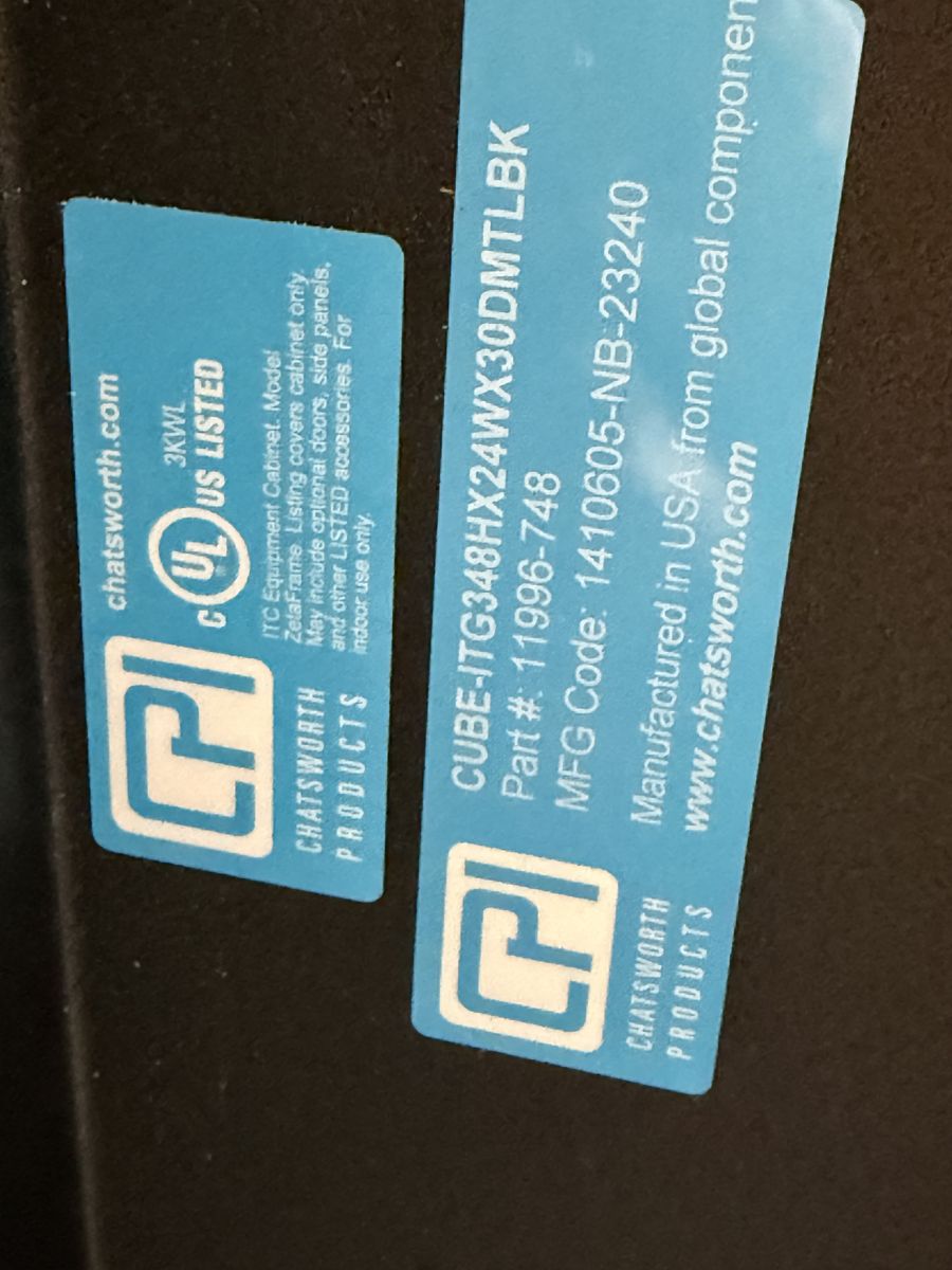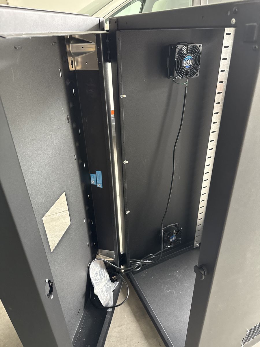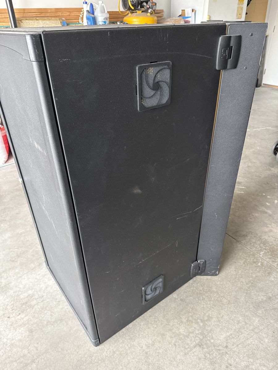 ApplePay48Hx24Wx30”D black network cabinet. Comes with two cooling fans. Use for offices, home, and video equipment. Can be wall mounted. Excellent condition.