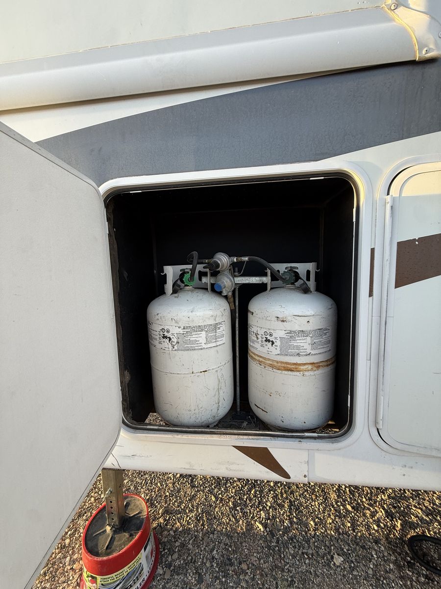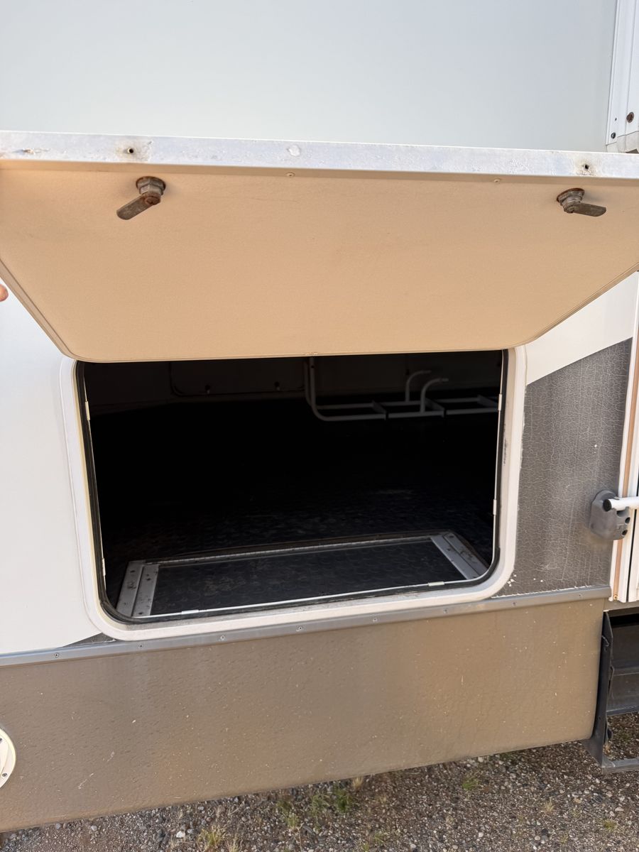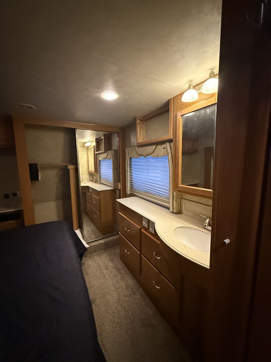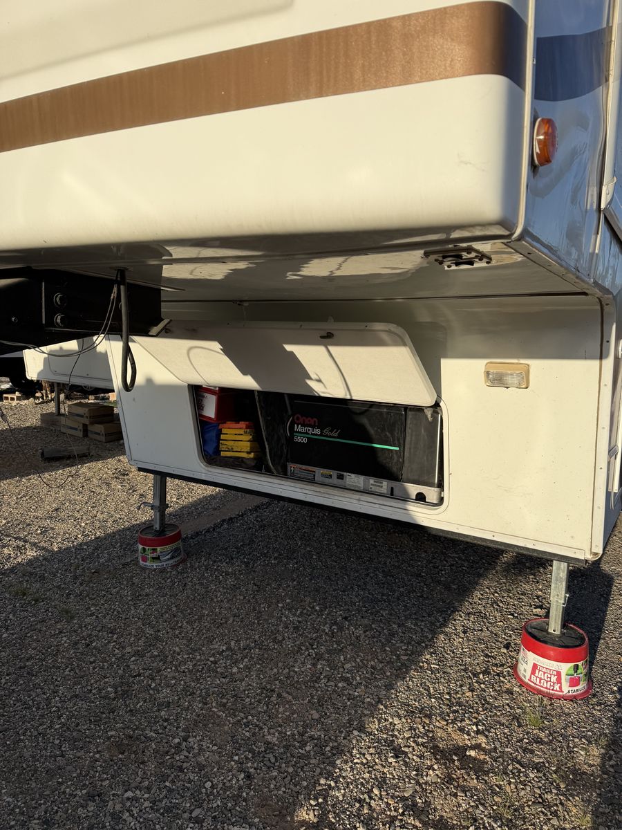 -Dry weight: 13,629 LBS/GVWR: 18,000 -air ride suspension -just did a full tune up on the onboard generator (at Birdies in Spanish fork). Has low hours @208. -onboard fuel tank -two 7 gallon propane tanks with a mobile propane reader -3 batteries -All new tires last summer -new motors for both front jacks -electric rear jacks -kitchen garbage access from outside -central vacuum system -outdoor entertainment center -3 slide outs -two full sized beds in the rear -two electric heaters (110) -including Anderson jack blocks -including some supplies in the trailer -mattress topper on main bed -it does have solar panels but they aren’t working and we’re not sure why. -replaced most of the interior light bulbs this winter. -we’ve never had water leaking issues -Has never had dogs in it -cold weather package/insulation under