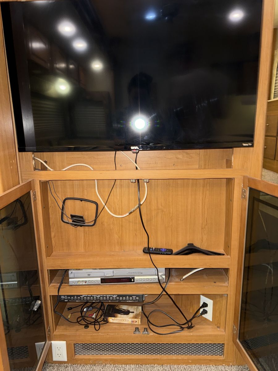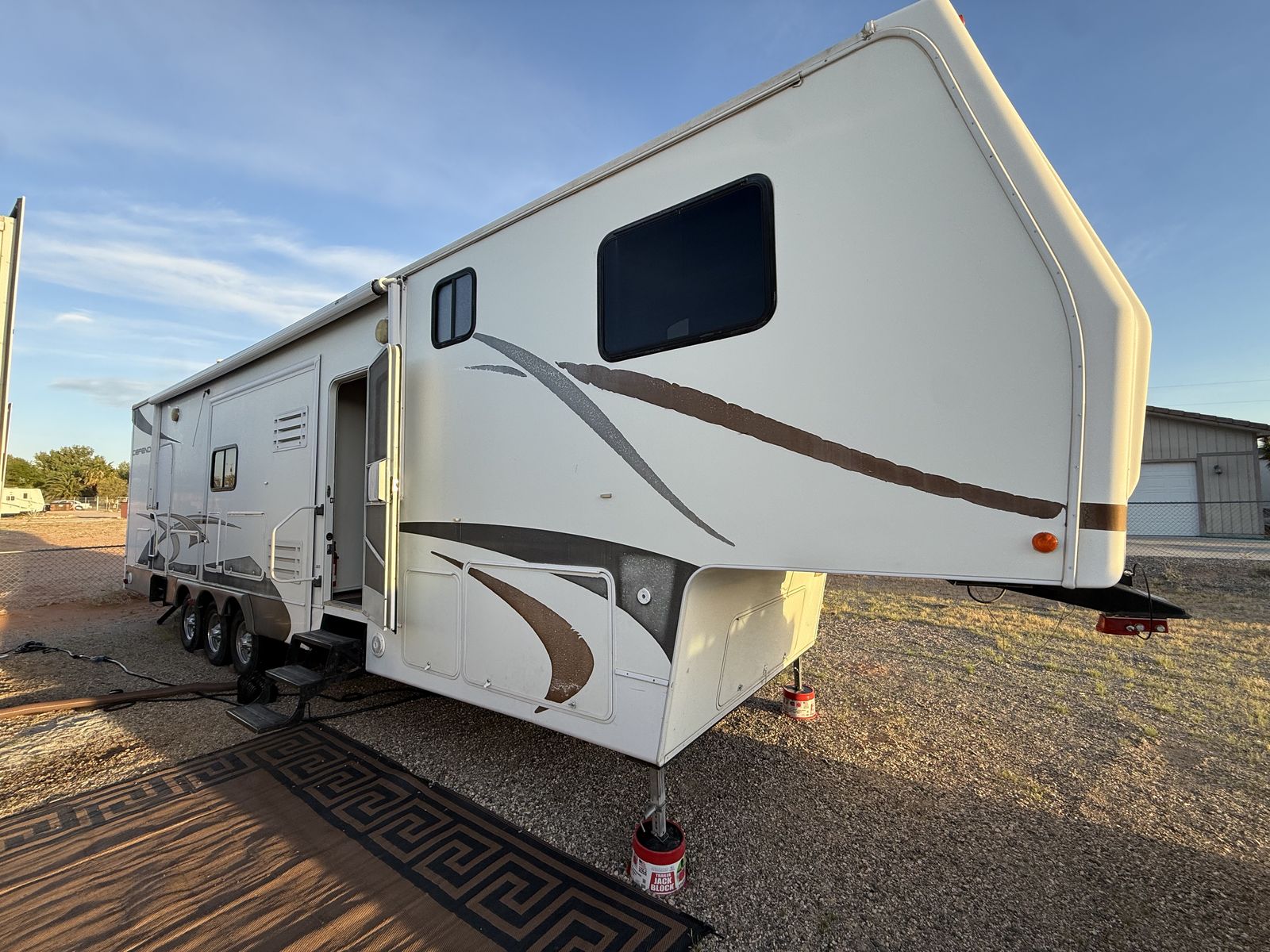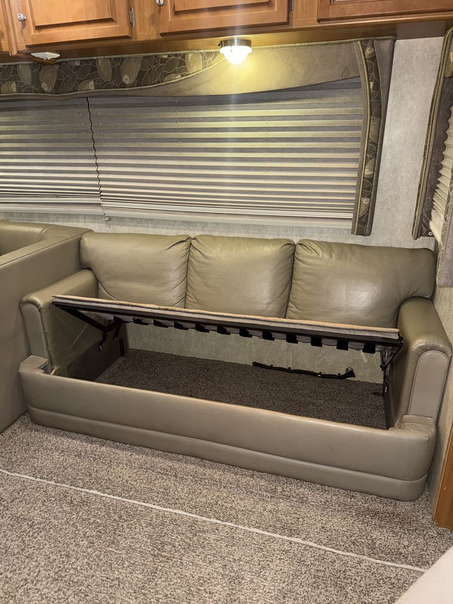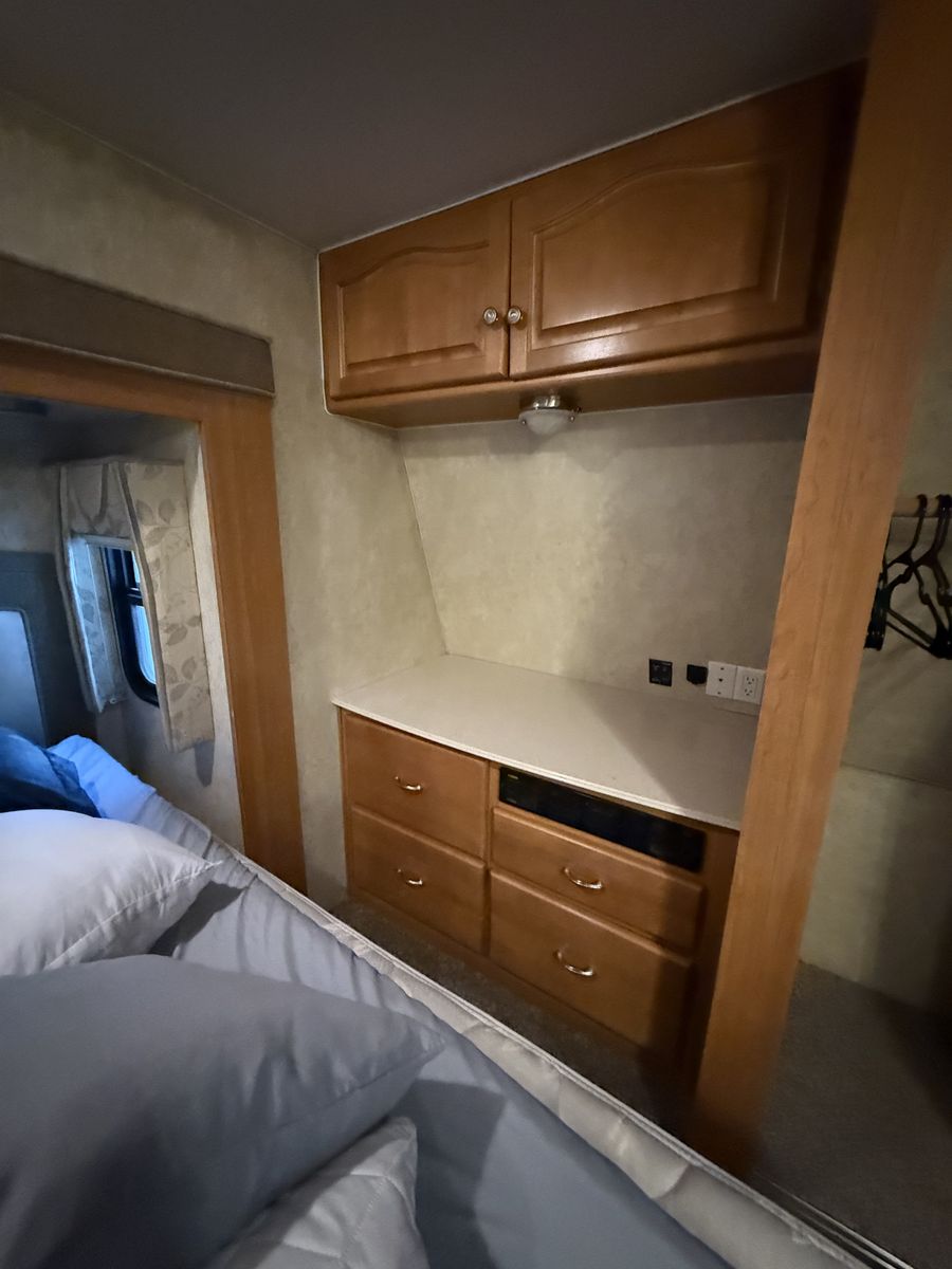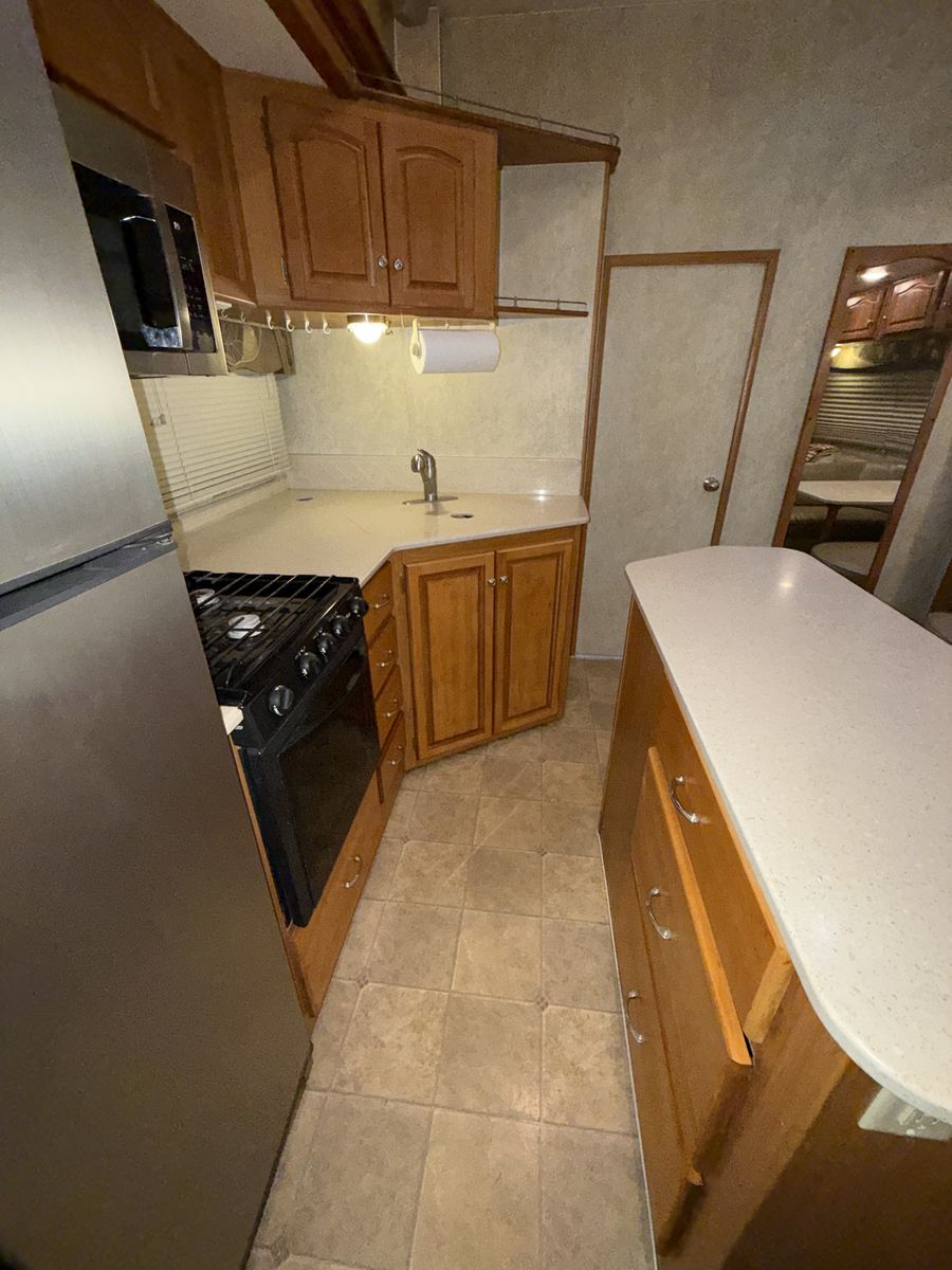 -Dry weight: 13,629 LBS/GVWR: 18,000 -air ride suspension -just did a full tune up on the onboard generator (at Birdies in Spanish fork). Has low hours @208. -onboard fuel tank -two 7 gallon propane tanks with a mobile propane reader -3 batteries -All new tires last summer -new motors for both front jacks -electric rear jacks -kitchen garbage access from outside -central vacuum system -outdoor entertainment center -3 slide outs -two full sized beds in the rear -two electric heaters (110) -including Anderson jack blocks -including some supplies in the trailer -mattress topper on main bed -it does have solar panels but they aren’t working and we’re not sure why. -replaced most of the interior light bulbs this winter. -we’ve never had water leaking issues -Has never had dogs in it -cold weather package/insulation under