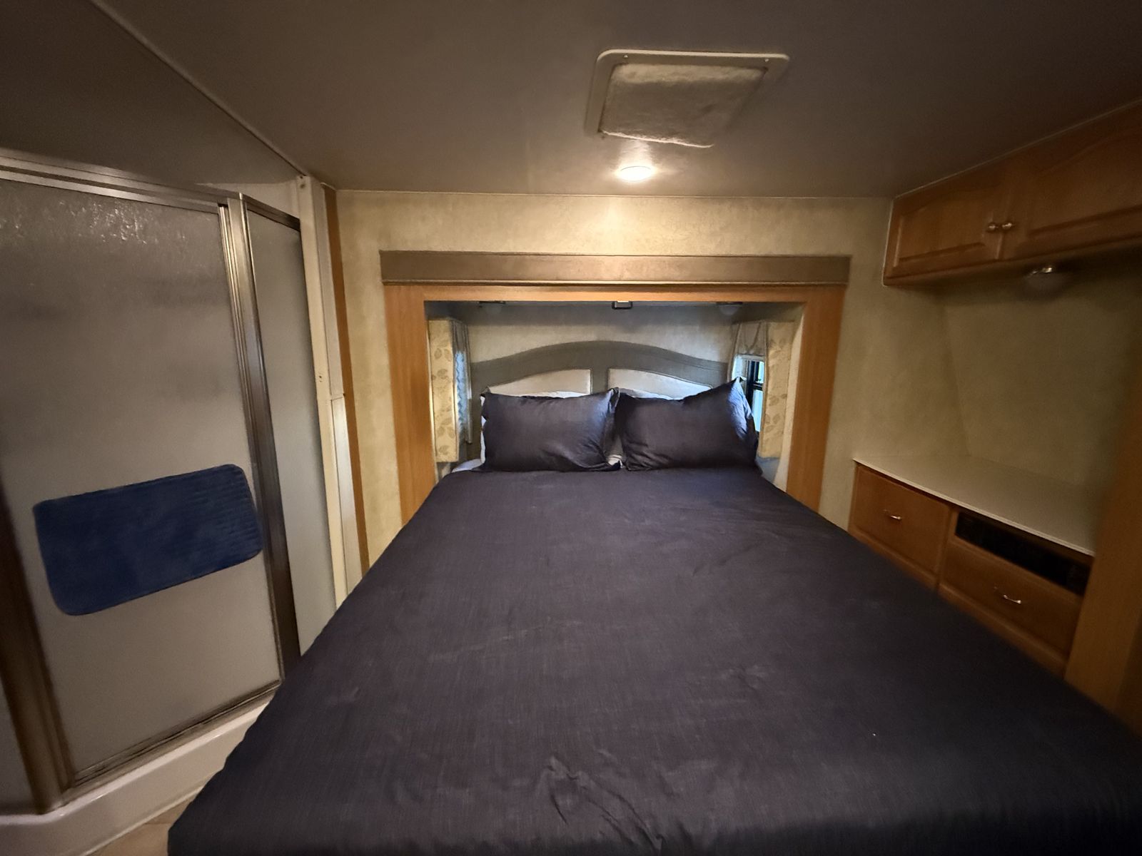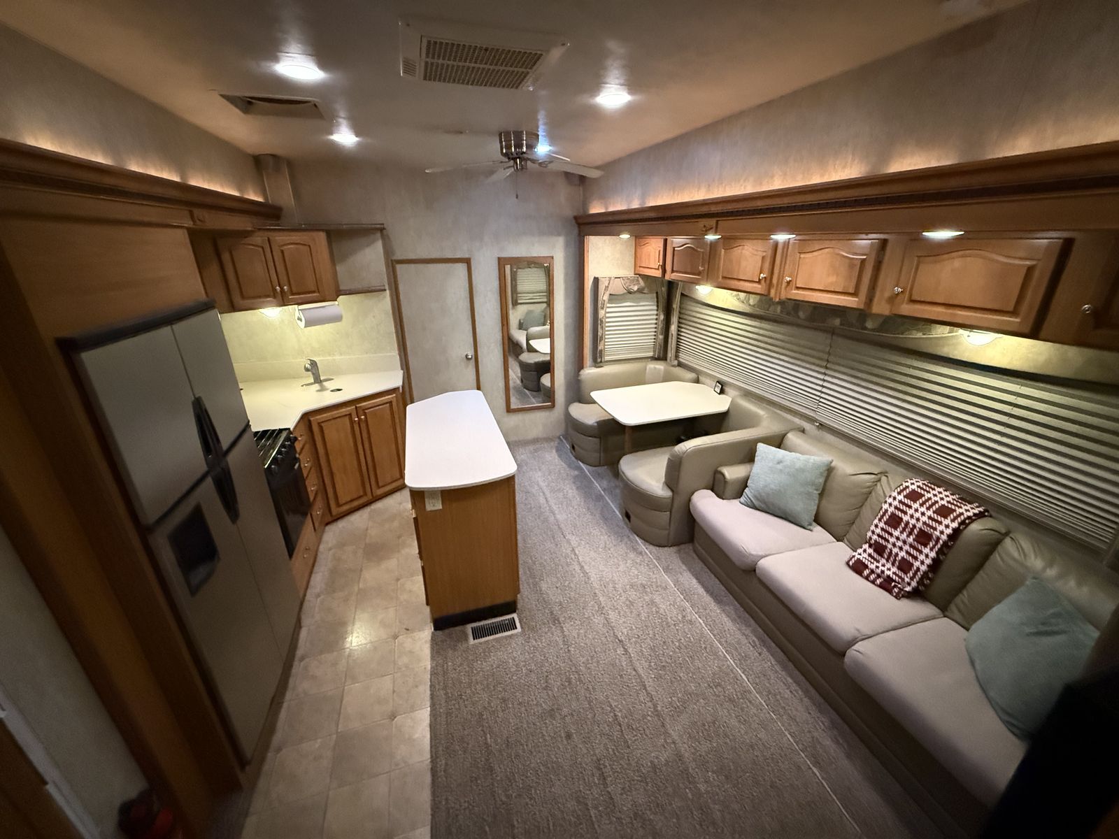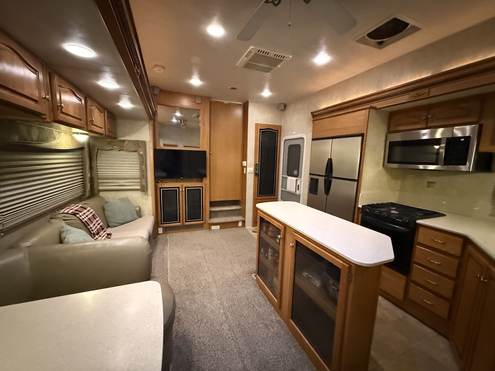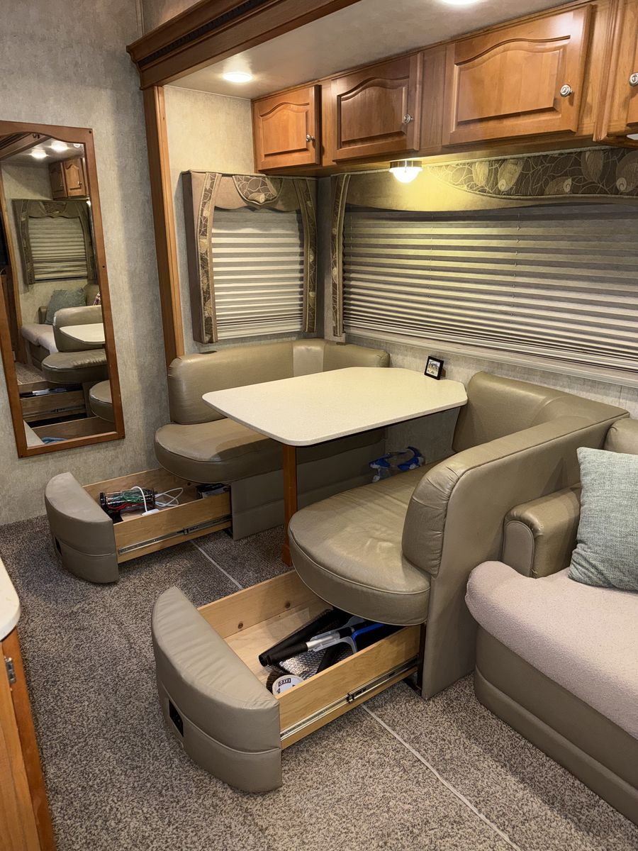 -Dry weight: 13,629 LBS/GVWR: 18,000 -air ride suspension -just did a full tune up on the onboard generator (at Birdies in Spanish fork). Has low hours @208. -onboard fuel tank -two 7 gallon propane tanks with a mobile propane reader -3 batteries -All new tires last summer -new motors for both front jacks -electric rear jacks -kitchen garbage access from outside -central vacuum system -outdoor entertainment center -3 slide outs -two full sized beds in the rear -two electric heaters (110) -including Anderson jack blocks -including some supplies in the trailer -mattress topper on main bed -it does have solar panels but they aren’t working and we’re not sure why. -replaced most of the interior light bulbs this winter. -we’ve never had water leaking issues -Has never had dogs in it -cold weather package/insulation under