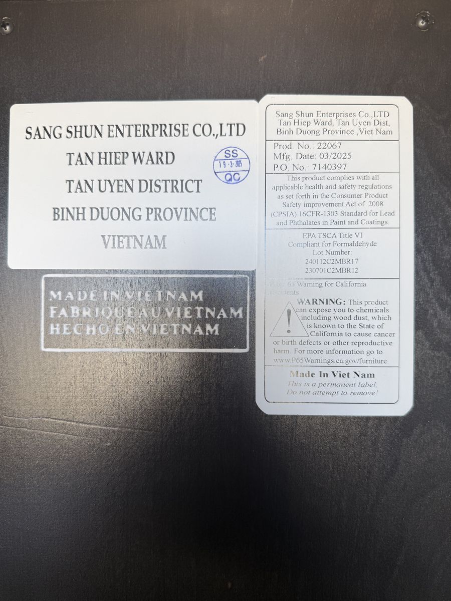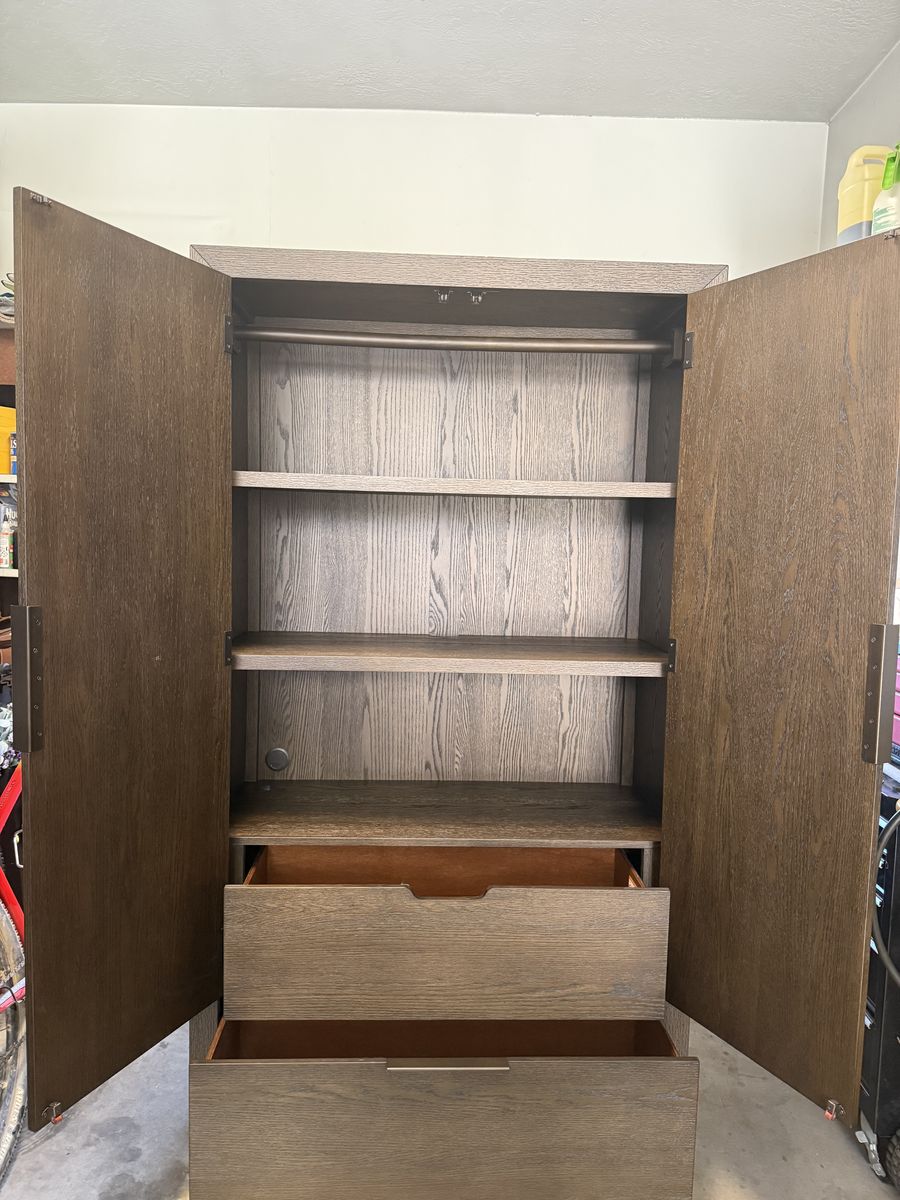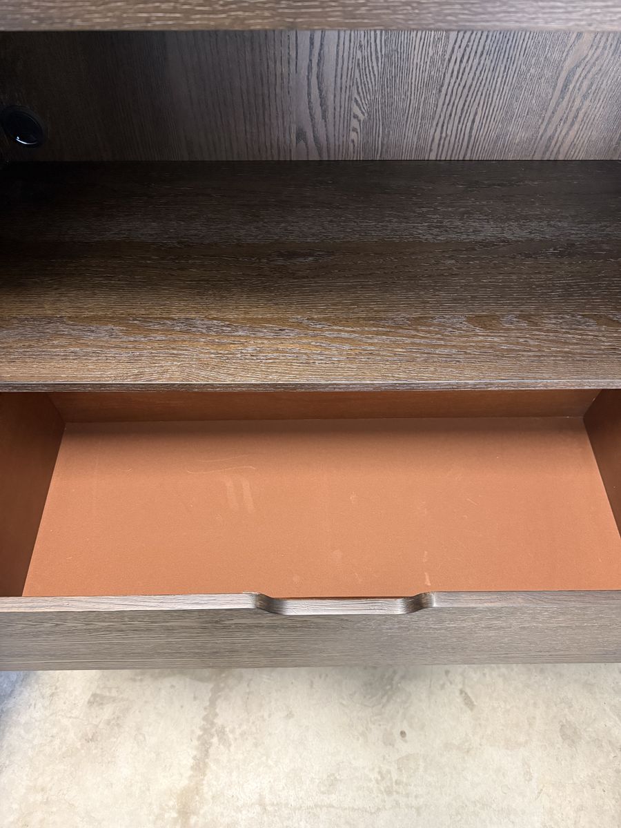 ZelleNEW! I purchased this for my sister at Living Spaces and she passed away 2 weeks later. There is an opening to put a cord for a TV and the bar on top is removable. See photos for size.
