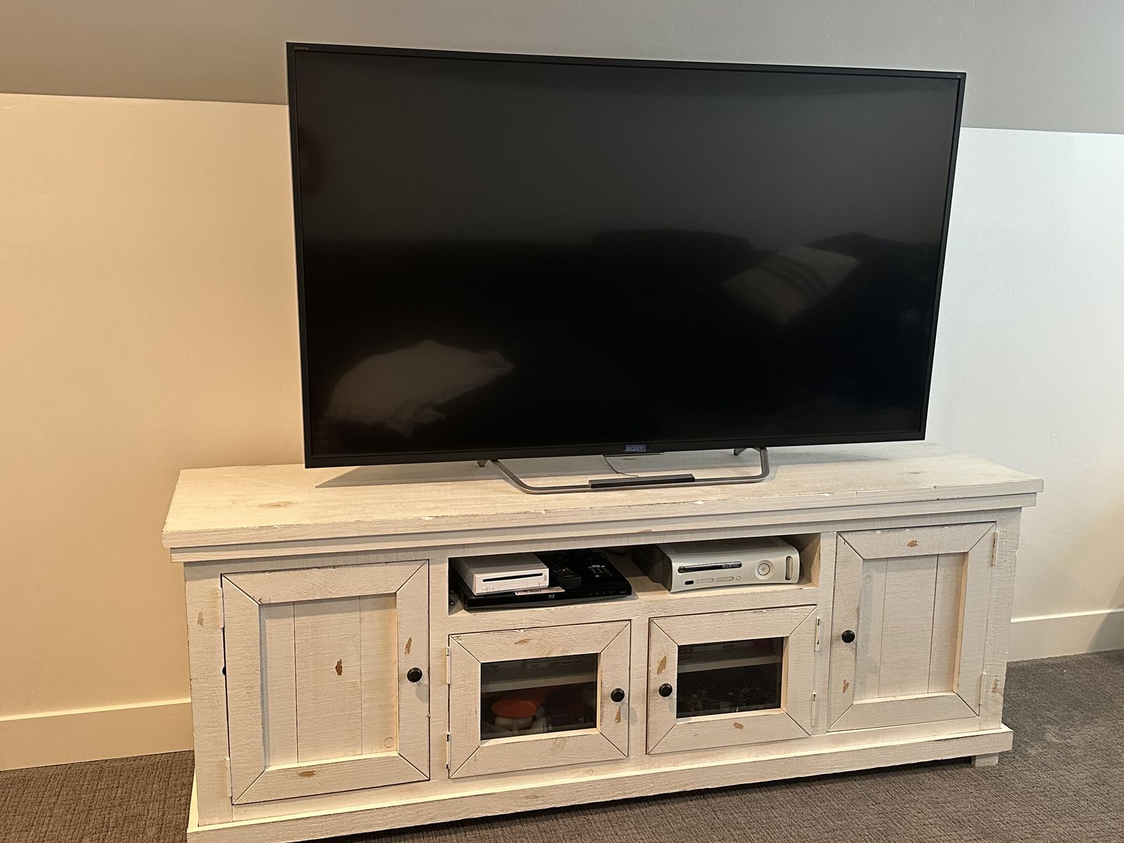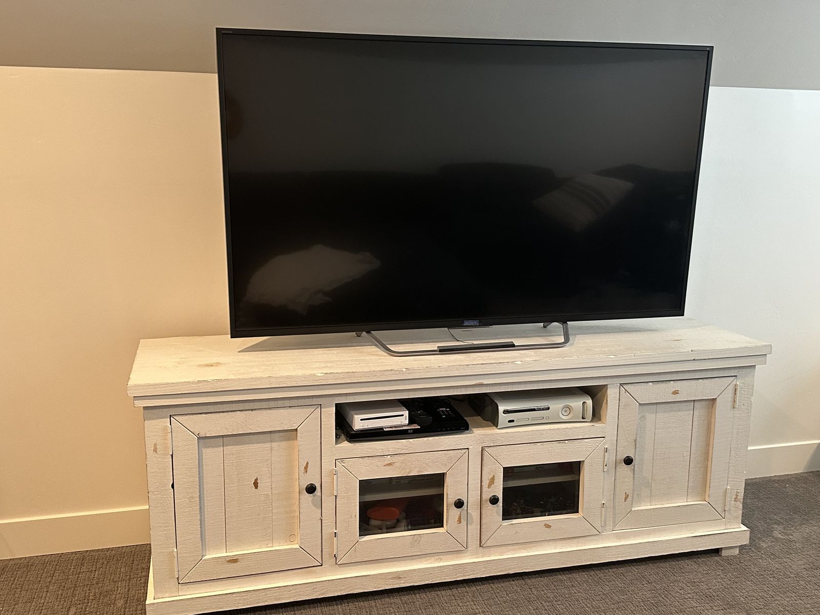 Venmo74” wide white washed entertainment center. Excellent condition, Great set up for your family room. Lots of storage.