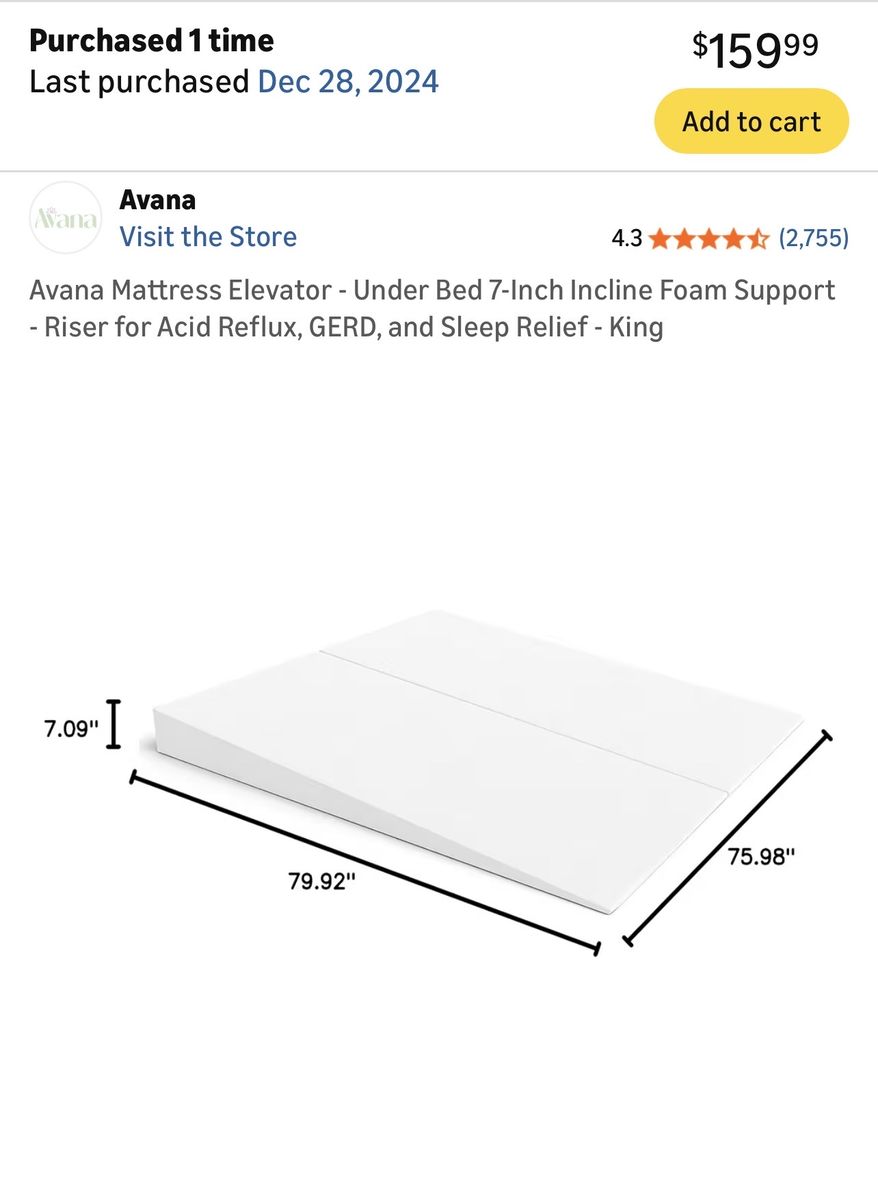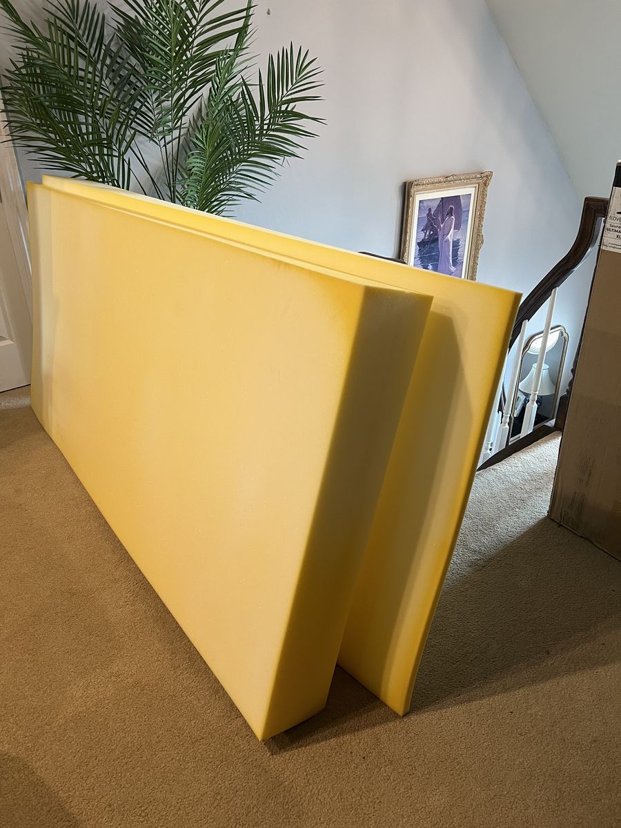 7” Foam mattress elevator for King sized bed. Used under mattress to raise the bed to an angle which can aid in better sleeping and prevent snoring. Clean, no smoking and in great condition; it just has yellowed over time. $160 original price.
