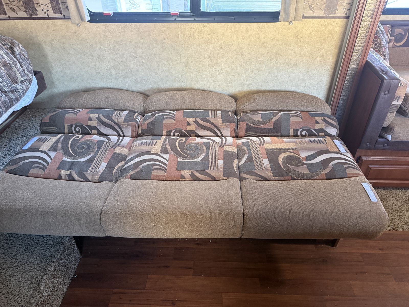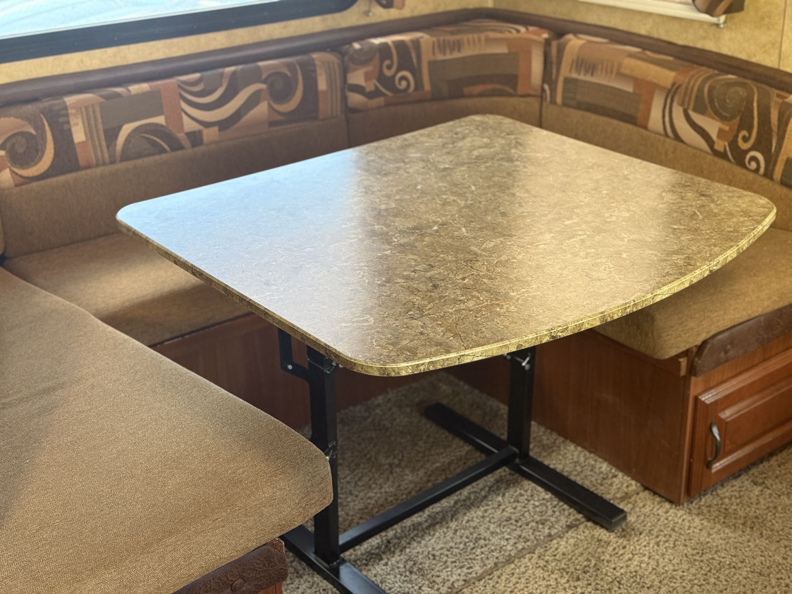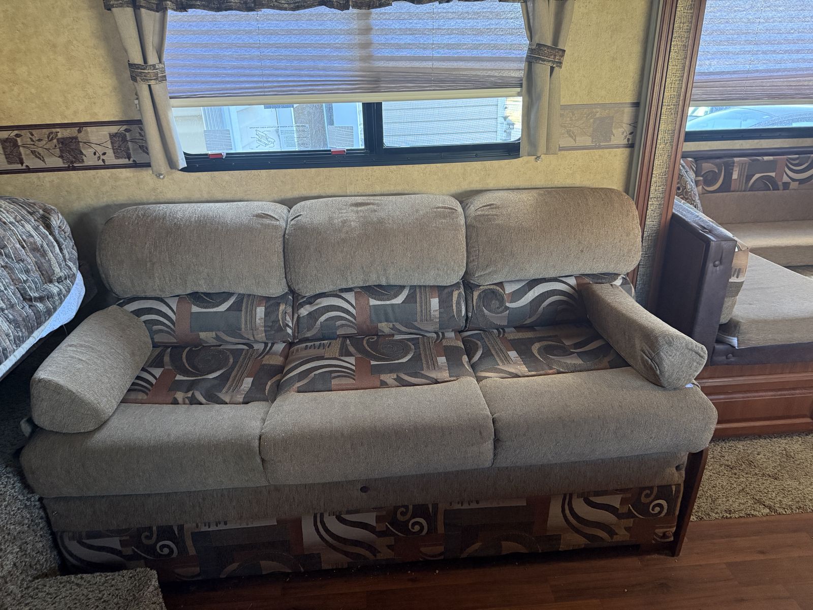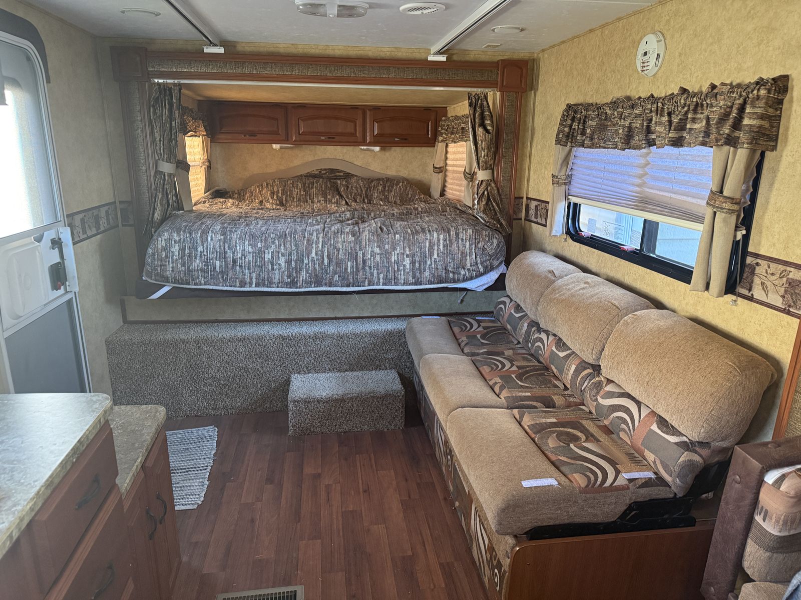 The couch makes into a bed as well as small children can sleep over the table area when table is down. There are two bunks at the front of the trailer. The bottom bunk folds up for storage when traveling.