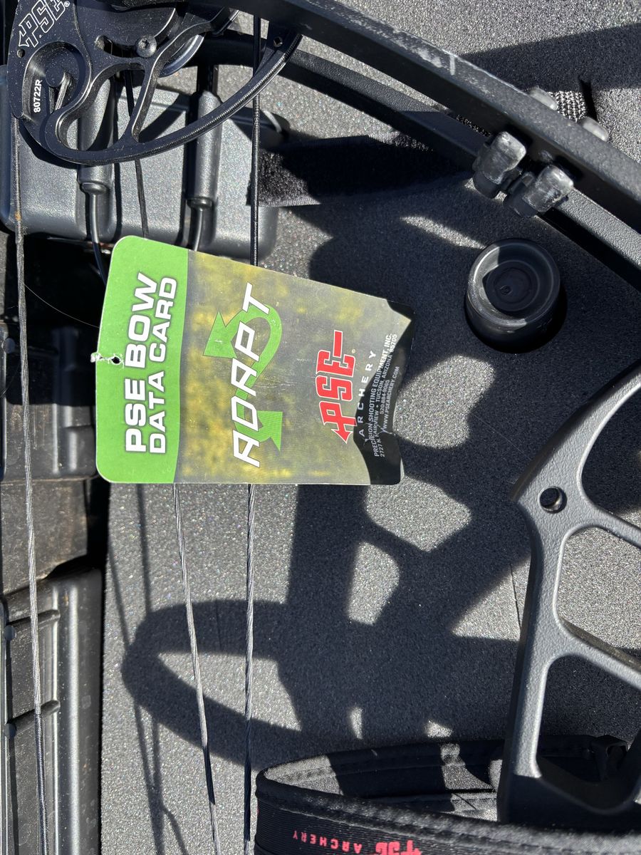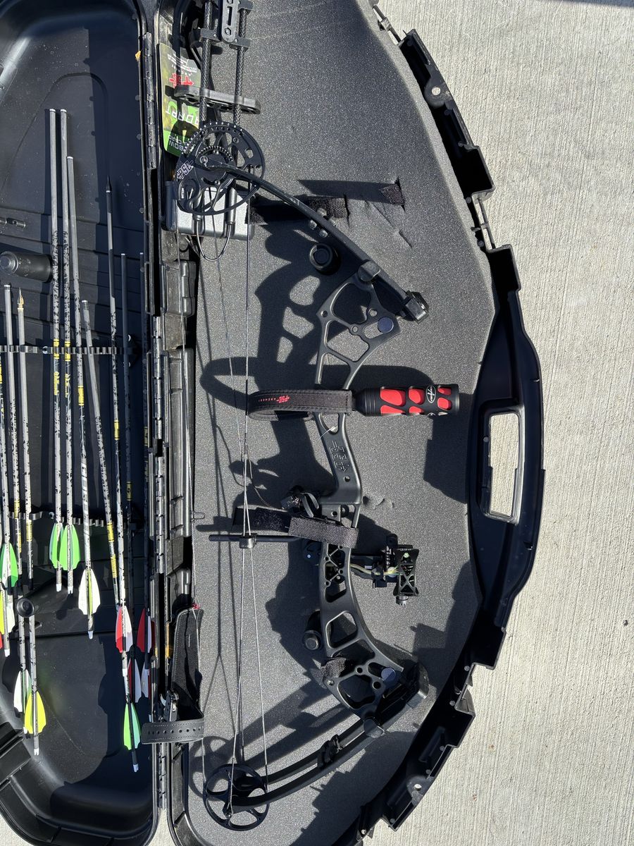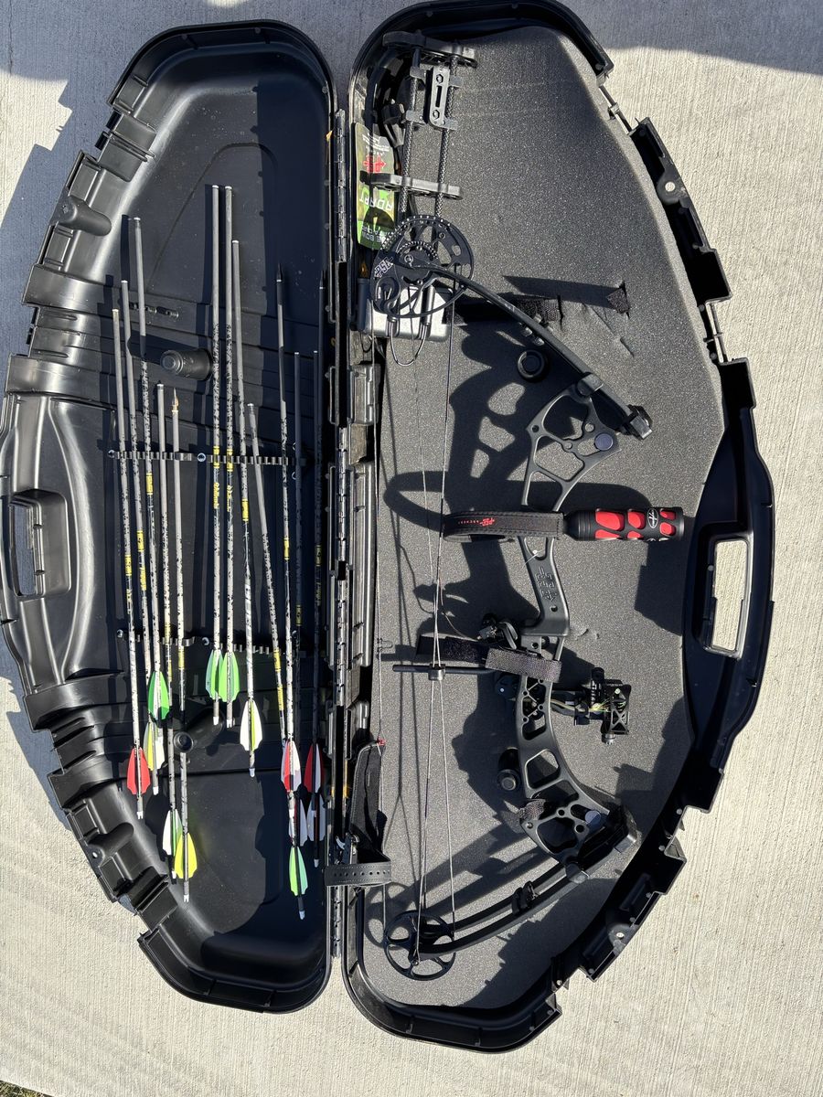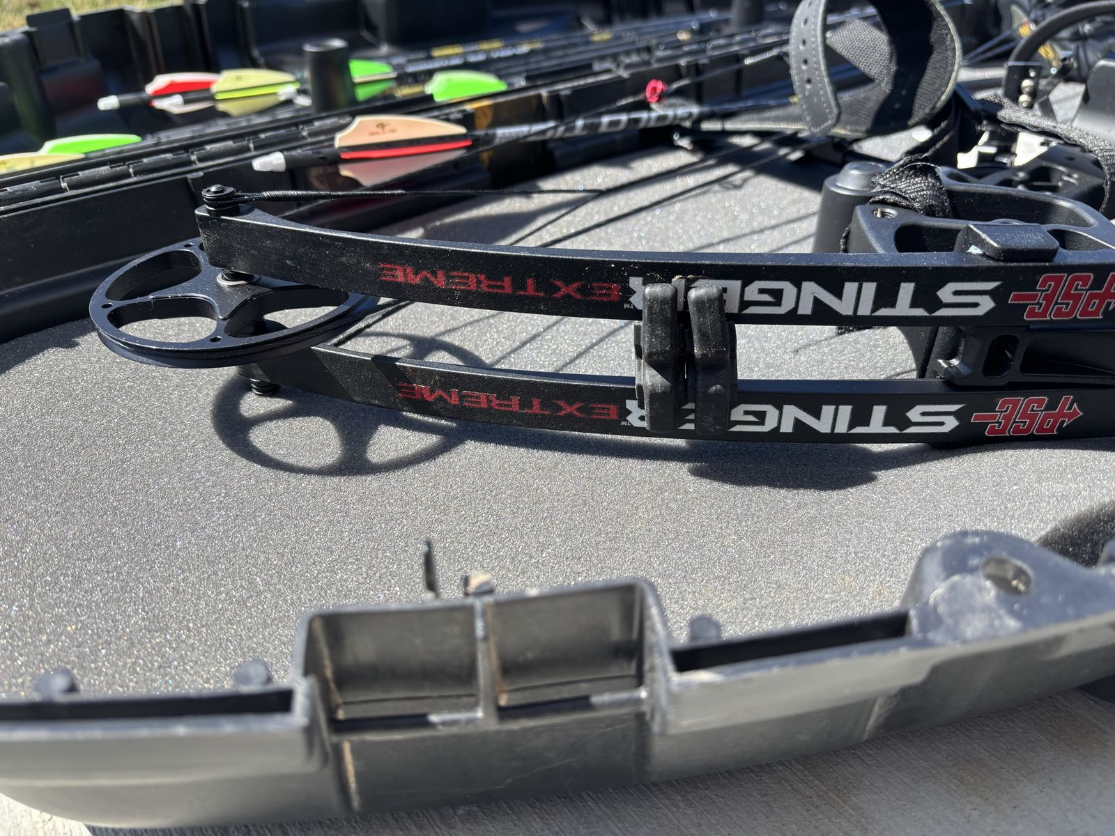 Like new compound bow. Used only once or twice. Comes with hard case, arrows, quiver, wrist release, and broad head tips. PSE stinger extreme. Right handed, has sights. Adjustable draw.