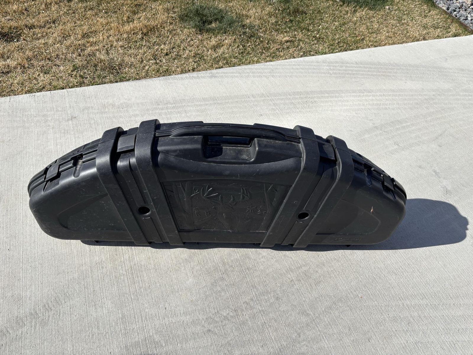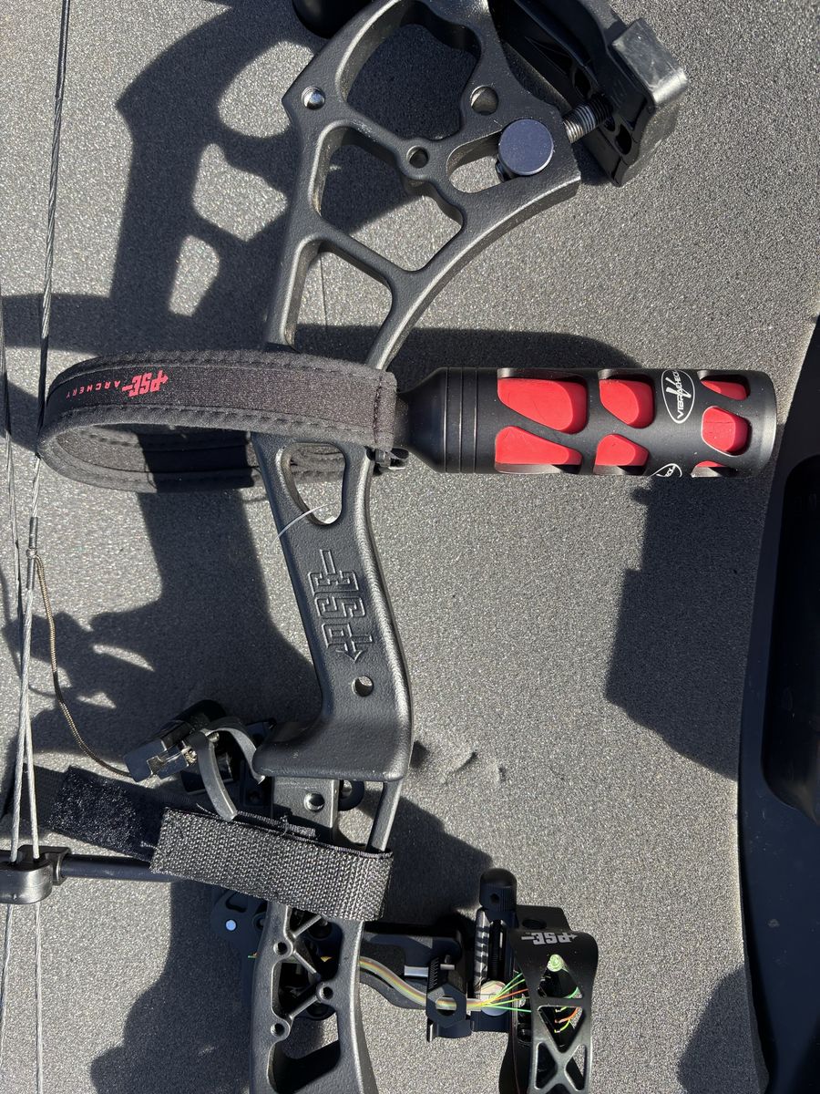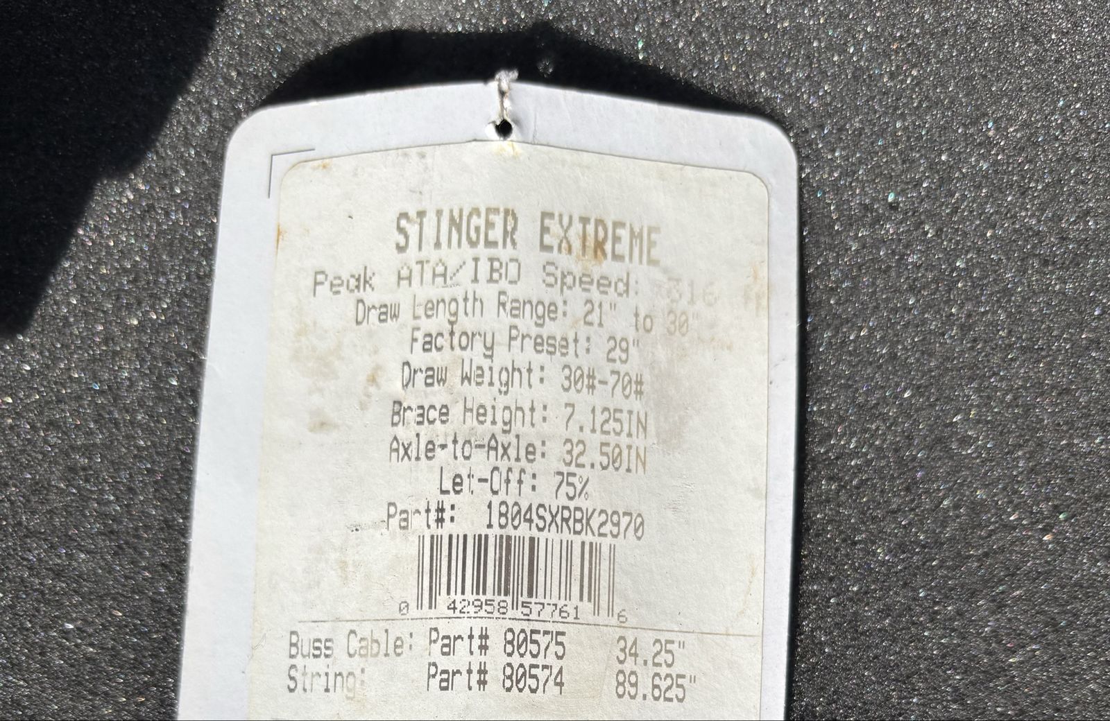 Like new compound bow. Used only once or twice. Comes with hard case, arrows, quiver, wrist release, and broad head tips. PSE stinger extreme. Right handed, has sights. Adjustable draw.