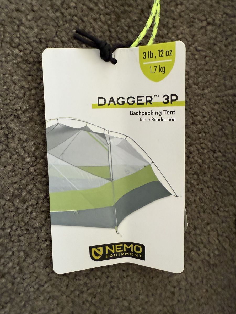 Selling a brand new Nemo Dagger 3P tent with tags still attached that retails for $650. The is a lightweight tent that has excellent reviews and only weighs 3 lb 12 oz. Perfect for 2 people who want a bit more room for a dog or keeping packs indoors for nights might encounter rain or snow.
