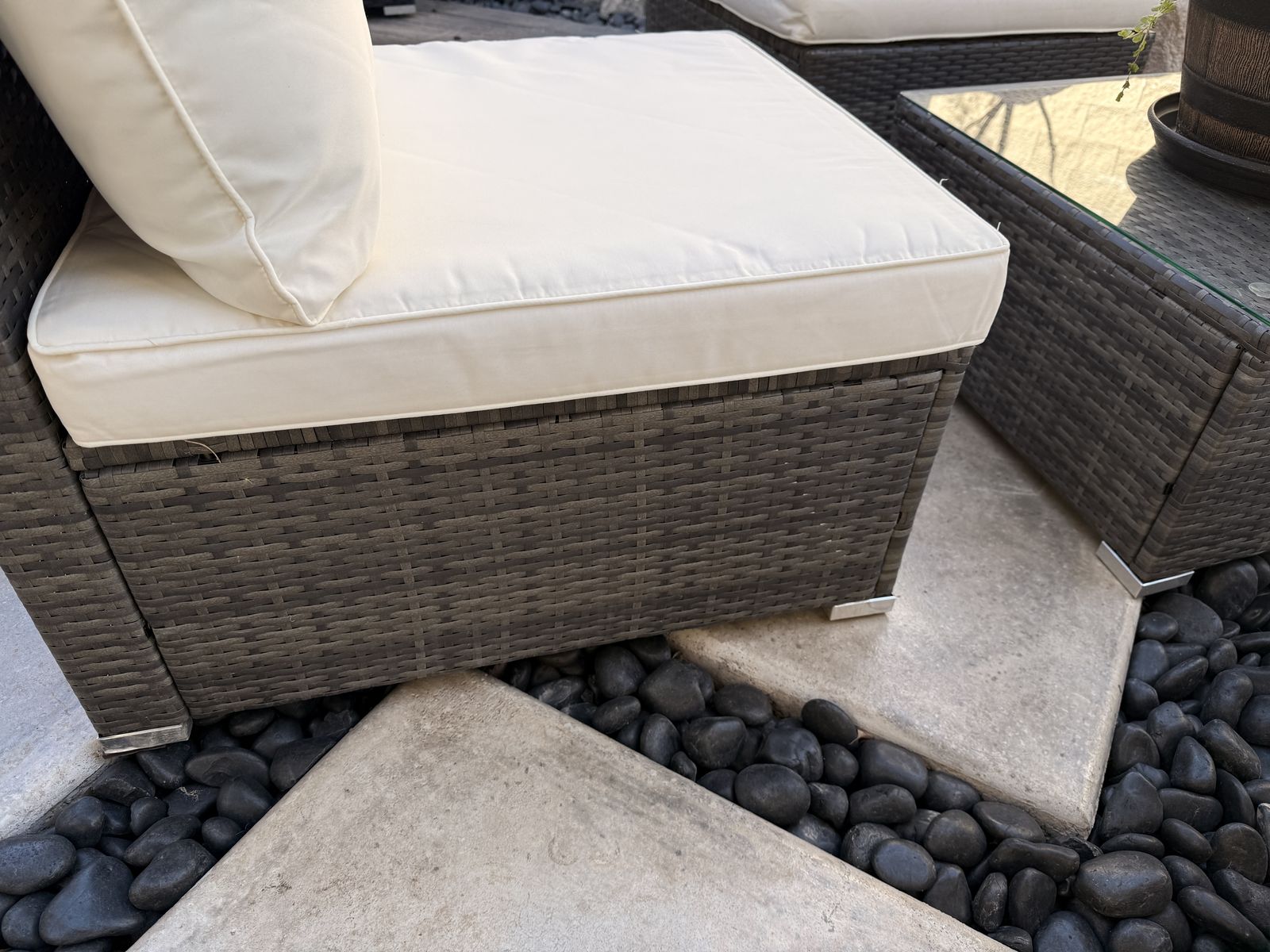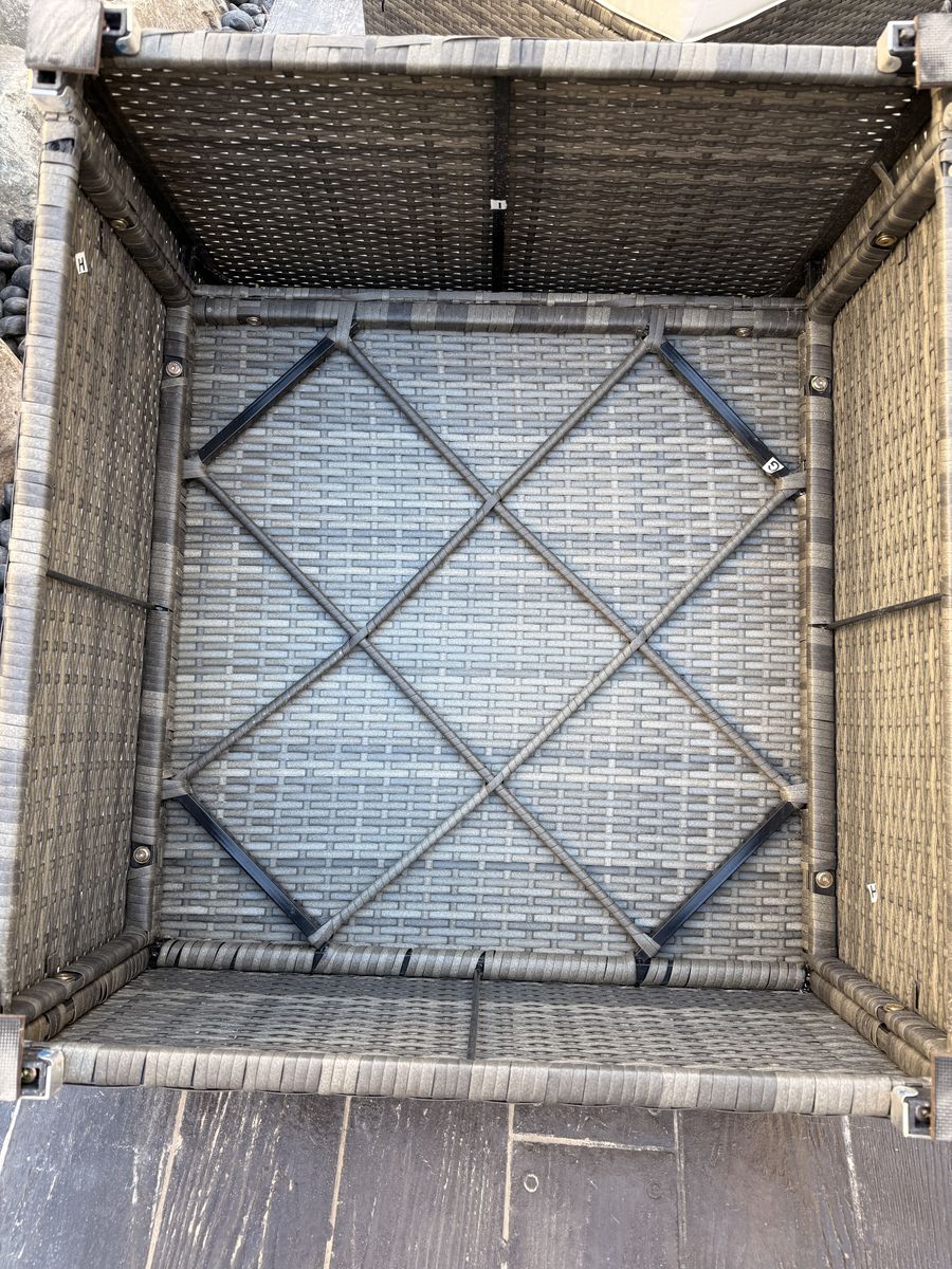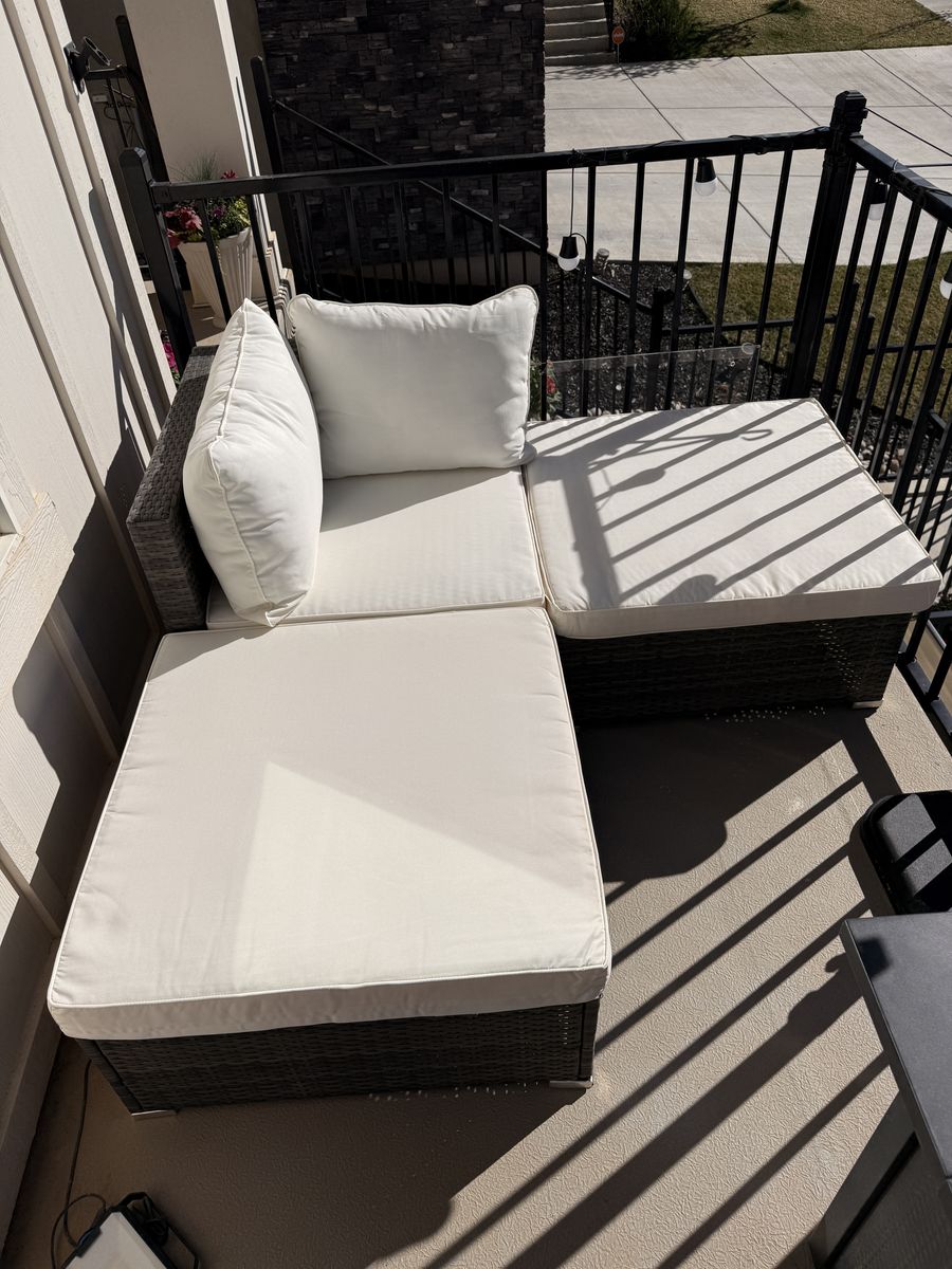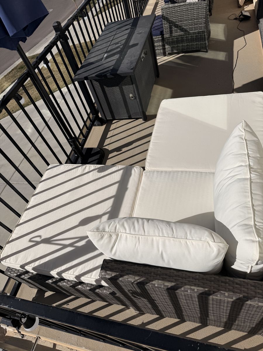 ApplePayBarely used excellent condition 8 piece outdoor patio sectional. We received it as a gift (Aug 25’) after we remodeled our back yard but it to large for the space. It was covered the entire winter and the cushions were stored in a waterproof trunk. Everything is like new. I put rubber feet on the bottom of each piece to prevent them from sliding. Comes with 8 clamps and a set of additional grey covers.