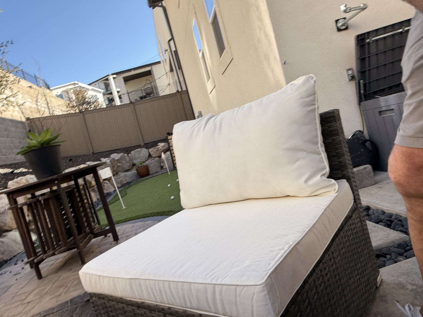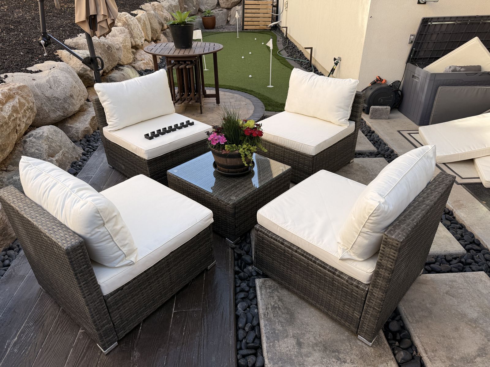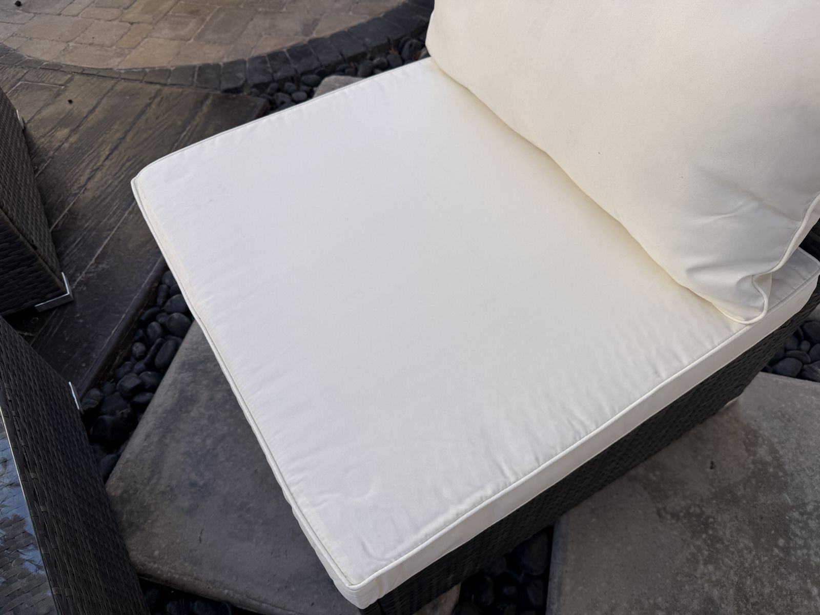 ApplePayBarely used excellent condition 8 piece outdoor patio sectional. We received it as a gift (Aug 25’) after we remodeled our back yard but it to large for the space. It was covered the entire winter and the cushions were stored in a waterproof trunk. Everything is like new. I put rubber feet on the bottom of each piece to prevent them from sliding. Comes with 8 clamps and a set of additional grey covers.