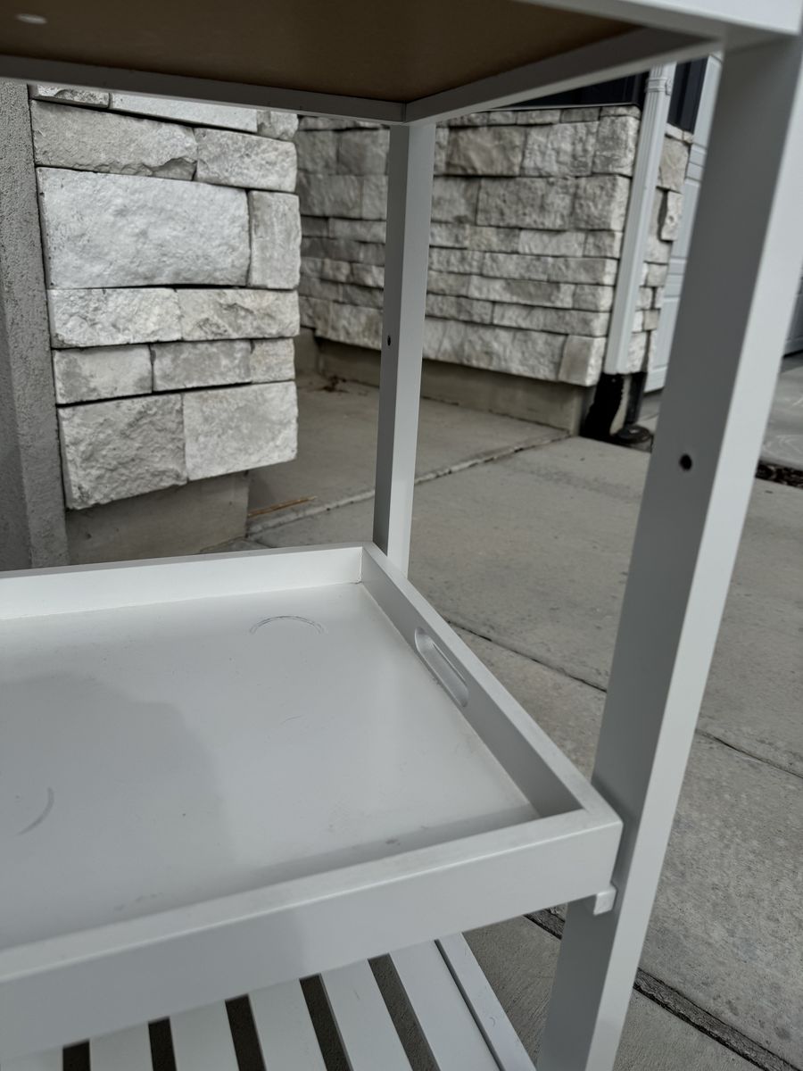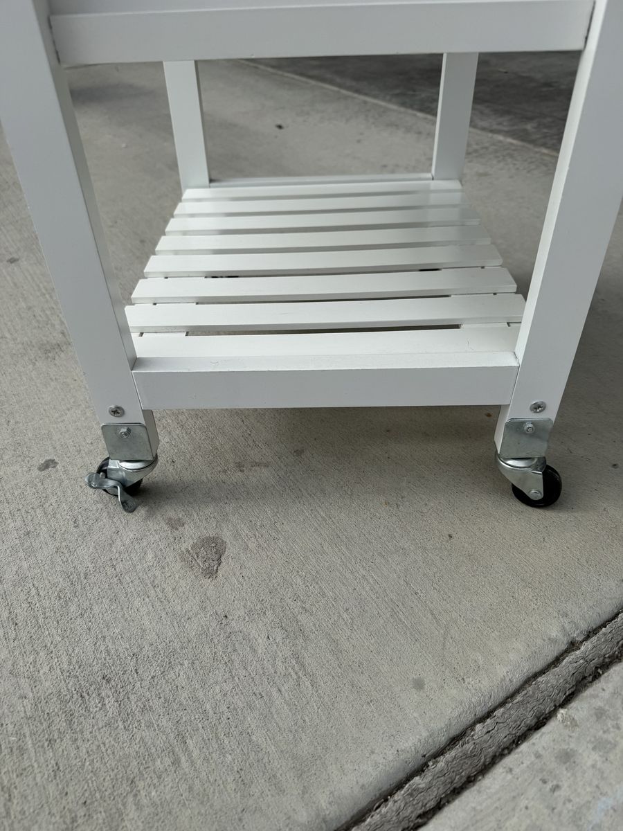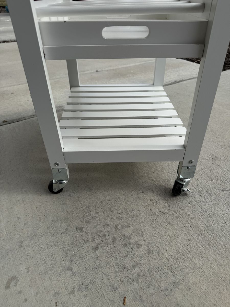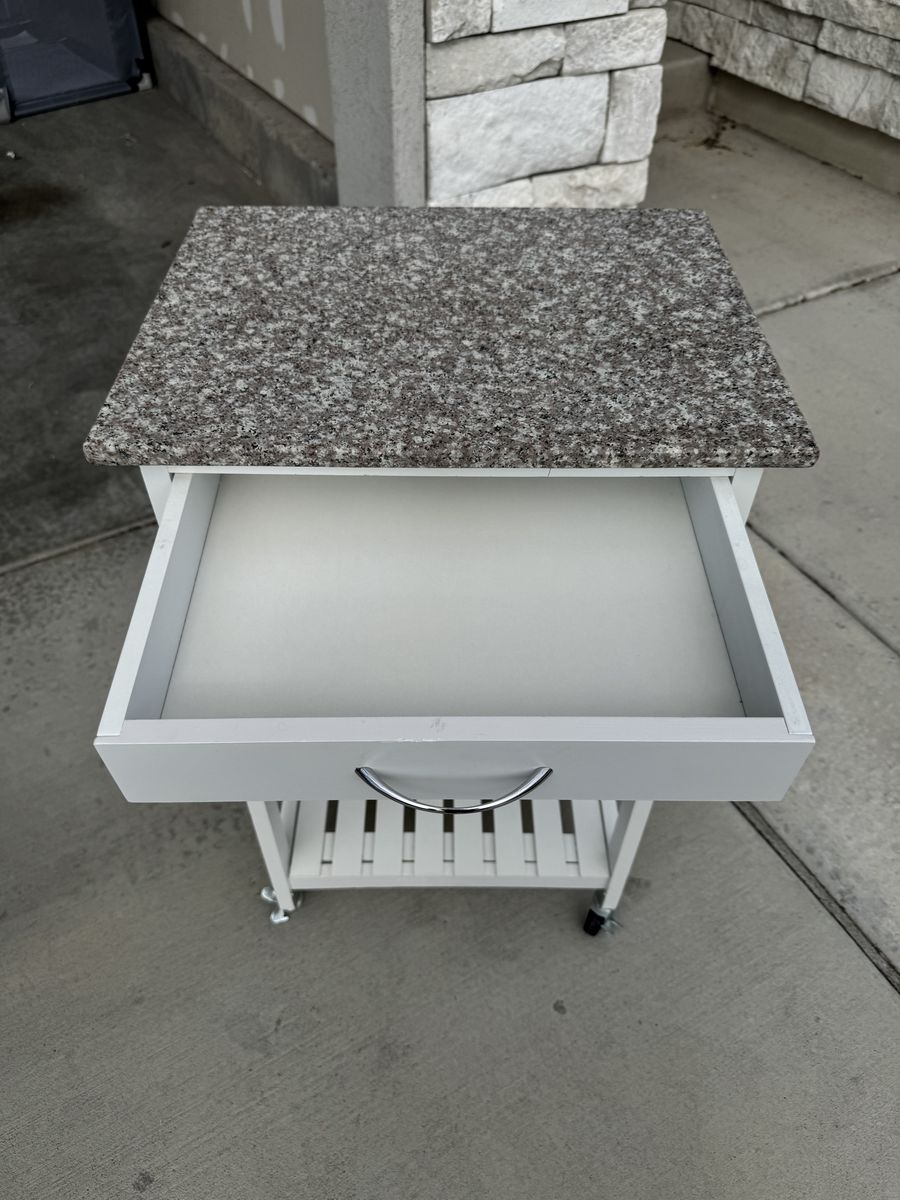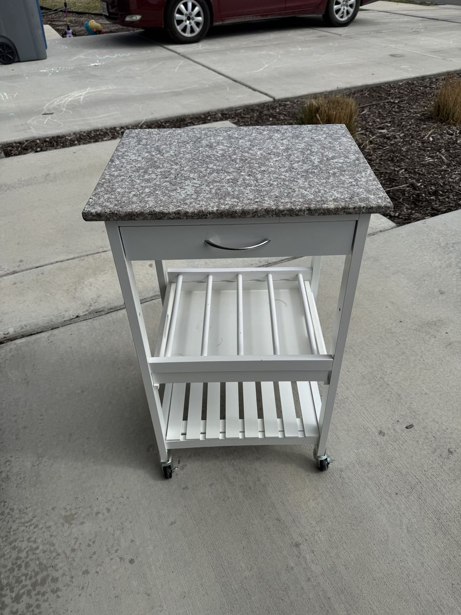 White rolling kitchen cart with heavy granite look top. Great for extra counter/prep space, coffee station, or bar cart. Includes one drawer, wine/bottle rack, and lower slatted shelf. Rolls on casters. Good condition. Missing wood pegs for one shelf.