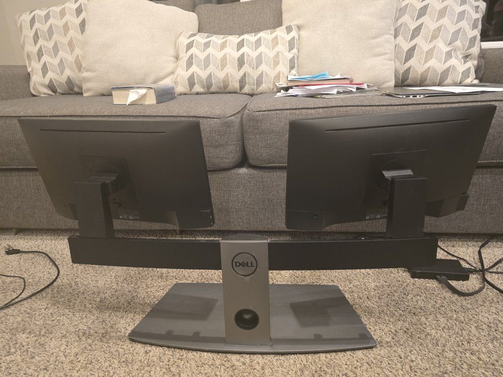 GooglePayfully working. stand is heavy duty. Monitors are about 19" each. have power cables. Just switched to 32 inch Monitors that are not compatible with this stand.