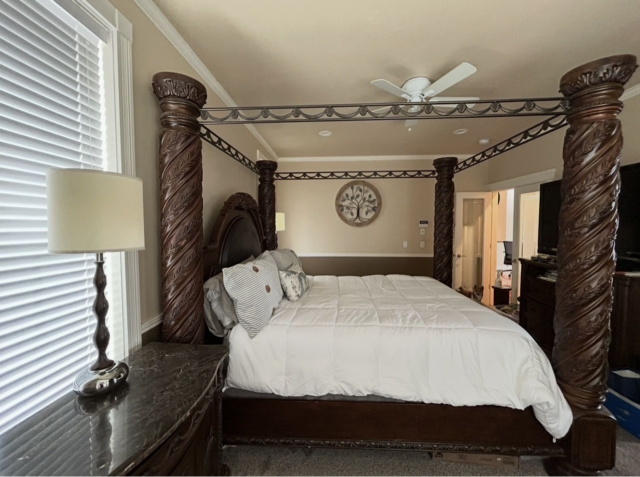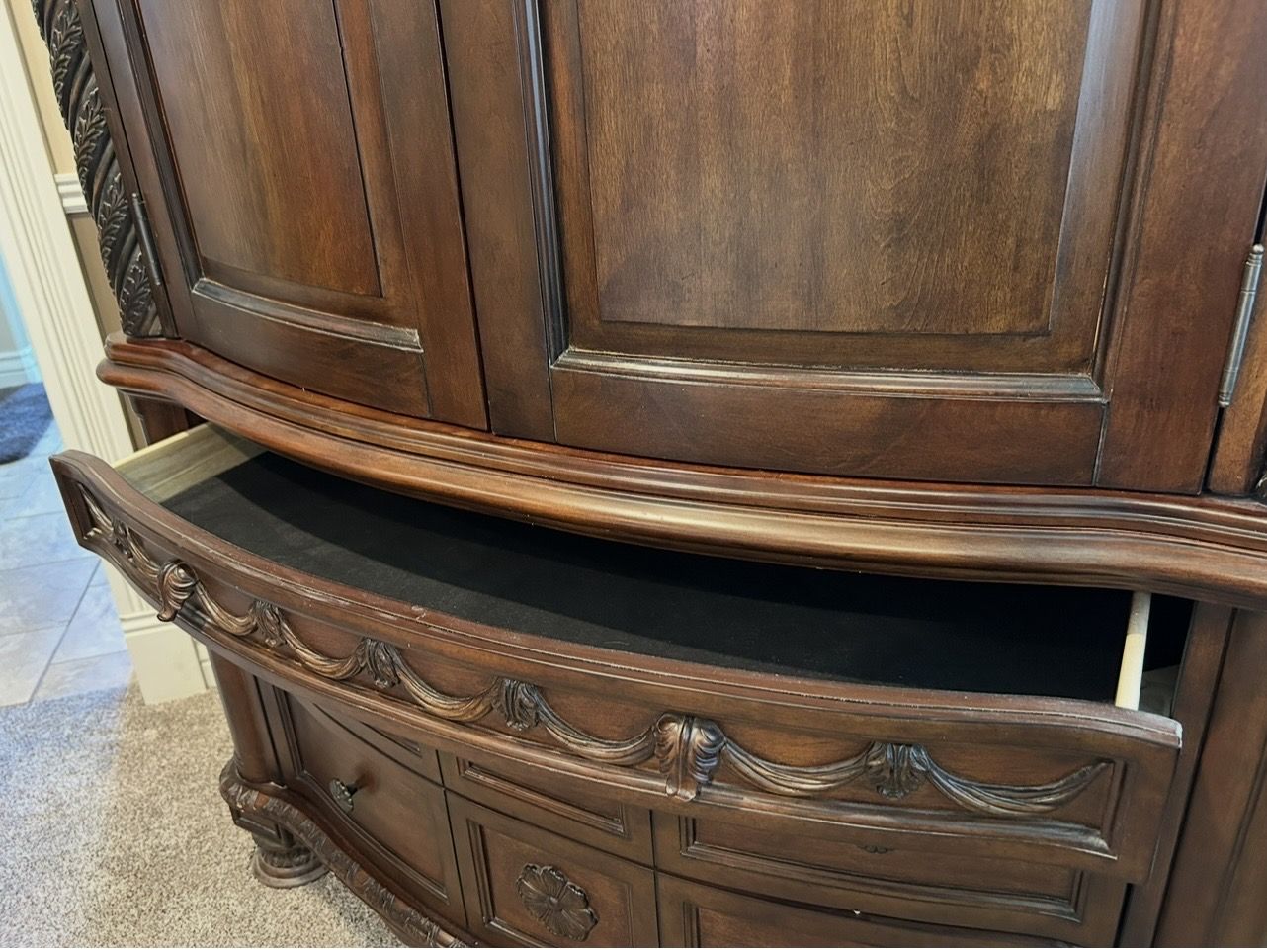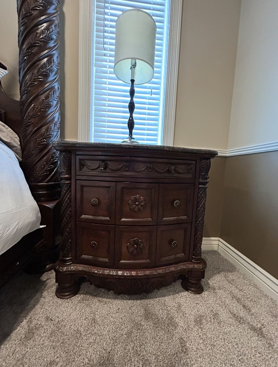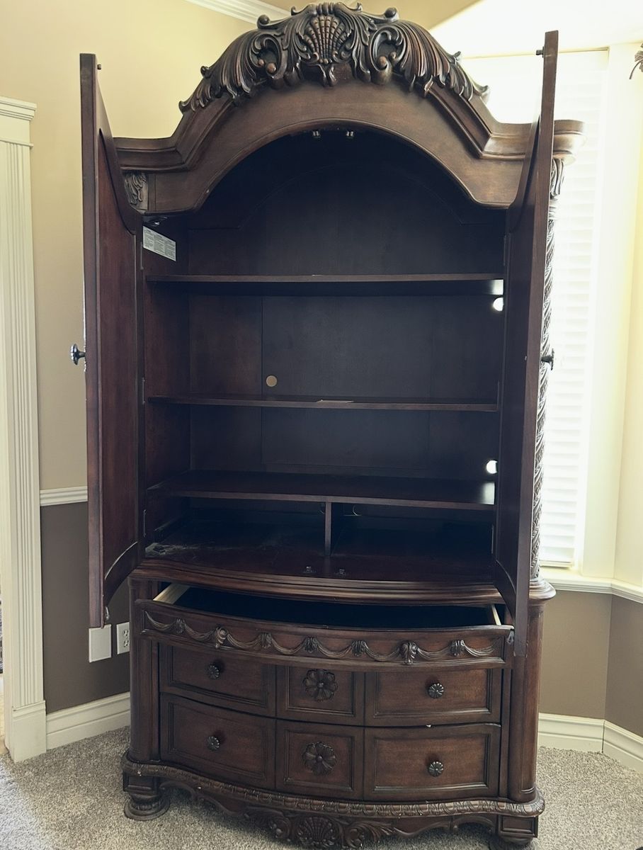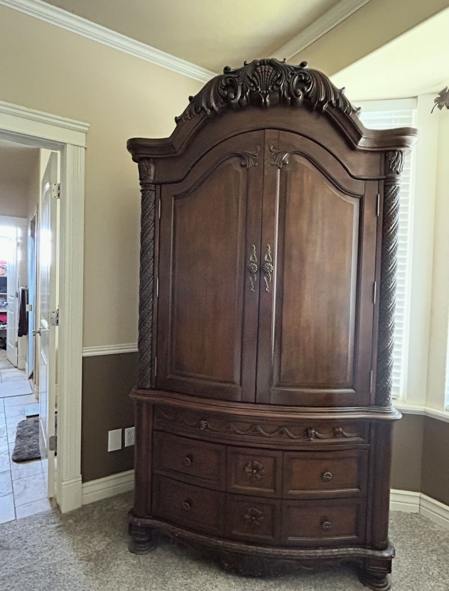 ApplePayKing dark stain bed frame, large armoire with jewelry drawer and 2 large nightstands with granite tops. This set was originally $8,000 when purchased new.
