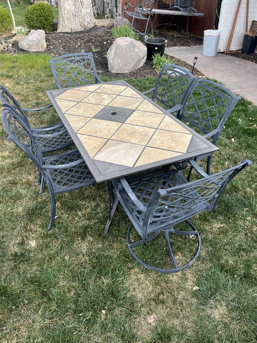 VenmoOutdoor dining set. Has a rectangular table with a pretty tile top and umbrella hole. Comes with 8 chairs, 2 of them are swivel chairs. Great for backyard hangouts. Pickup in sandy!