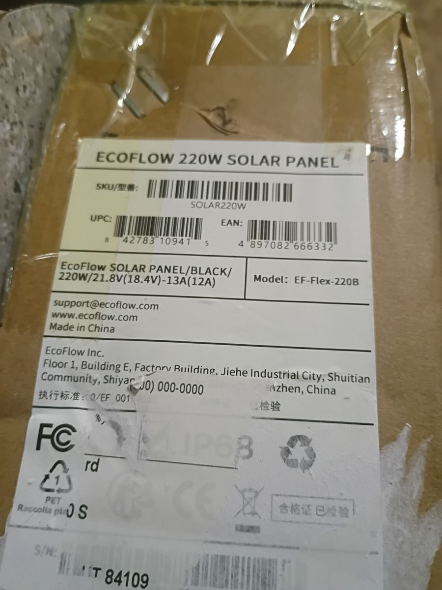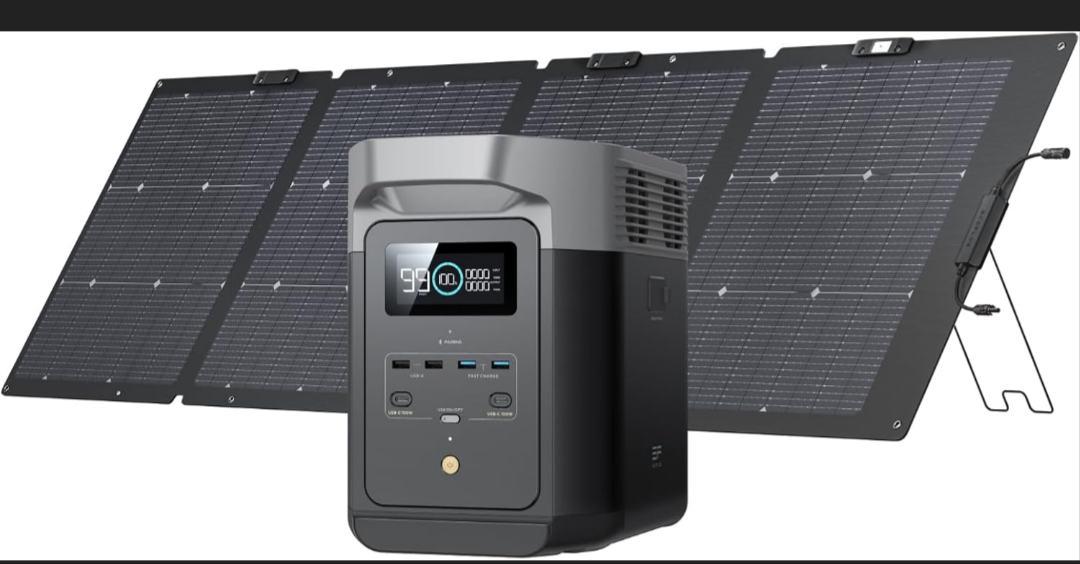 Solar Panel: EcoFlow 220W bifacial portable/foldable solar panel with kickstand and carry case. Folds compact for easy storage/transport. Unfolded: ~24×85 inches. Lightweight (~15–21 lbs with case). Great for off-grid, camping, RV, or backup use