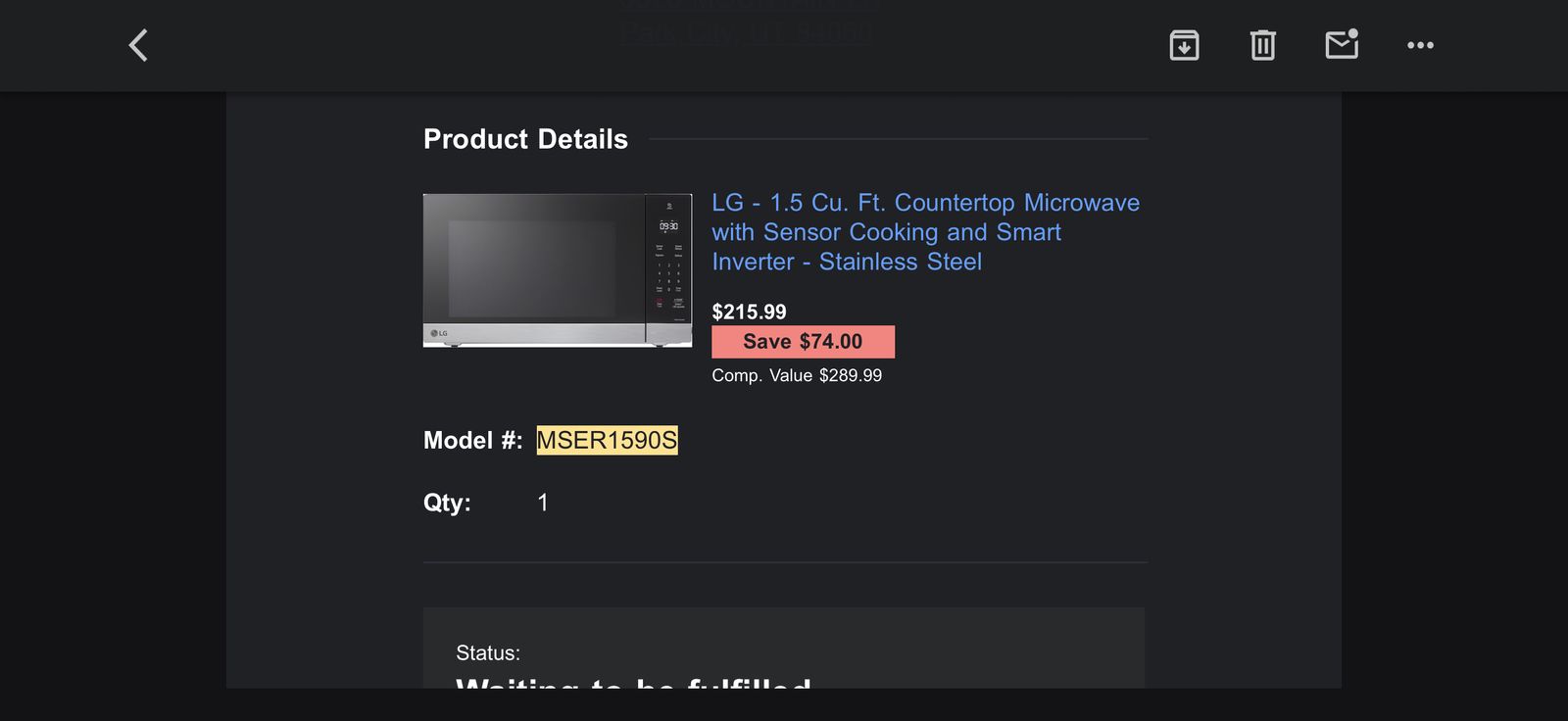 LG 1.5 cu ft LG countertop microwave purchased for $215. Model MSER1590S