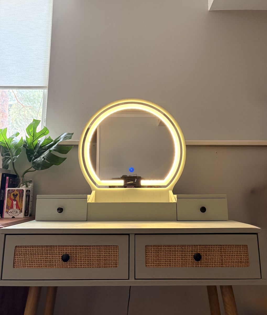 The round mirror features a built-in LED light ring with 3 lighting modes (warm, cool, and natural), perfect for makeup, skincare, or getting ready any time of day.