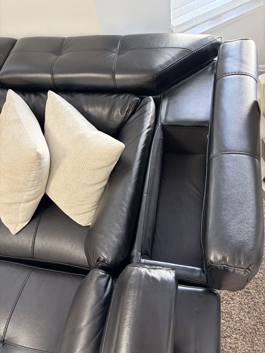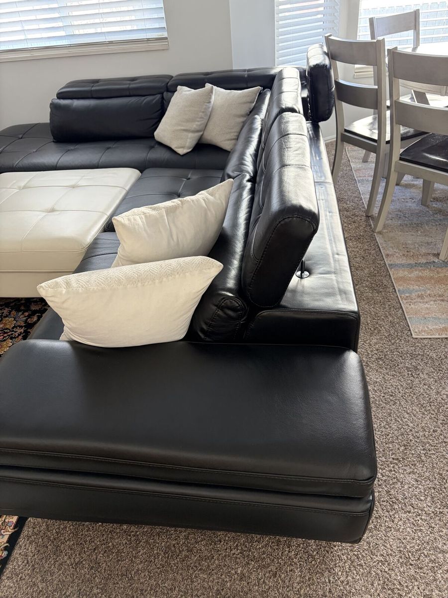 VenmoBlack leather sectional with adjustable head and arm rests. There is storage in two of the head pieces and in the middle white table. Comes with a glass tray table and the pillows if you like. The couch is 35 inches deep the long section of the L is 117 inches with the arm rest, the short section of the L where there is a leg rest is about 92 inches. You can separate the L in two pieces. The white middle table is 36 X 35 inches and 15.5 inches tall. The seating section of the couch is 15.5 inches tall and the back is about 29 inches tall. Like new with minimal wear.