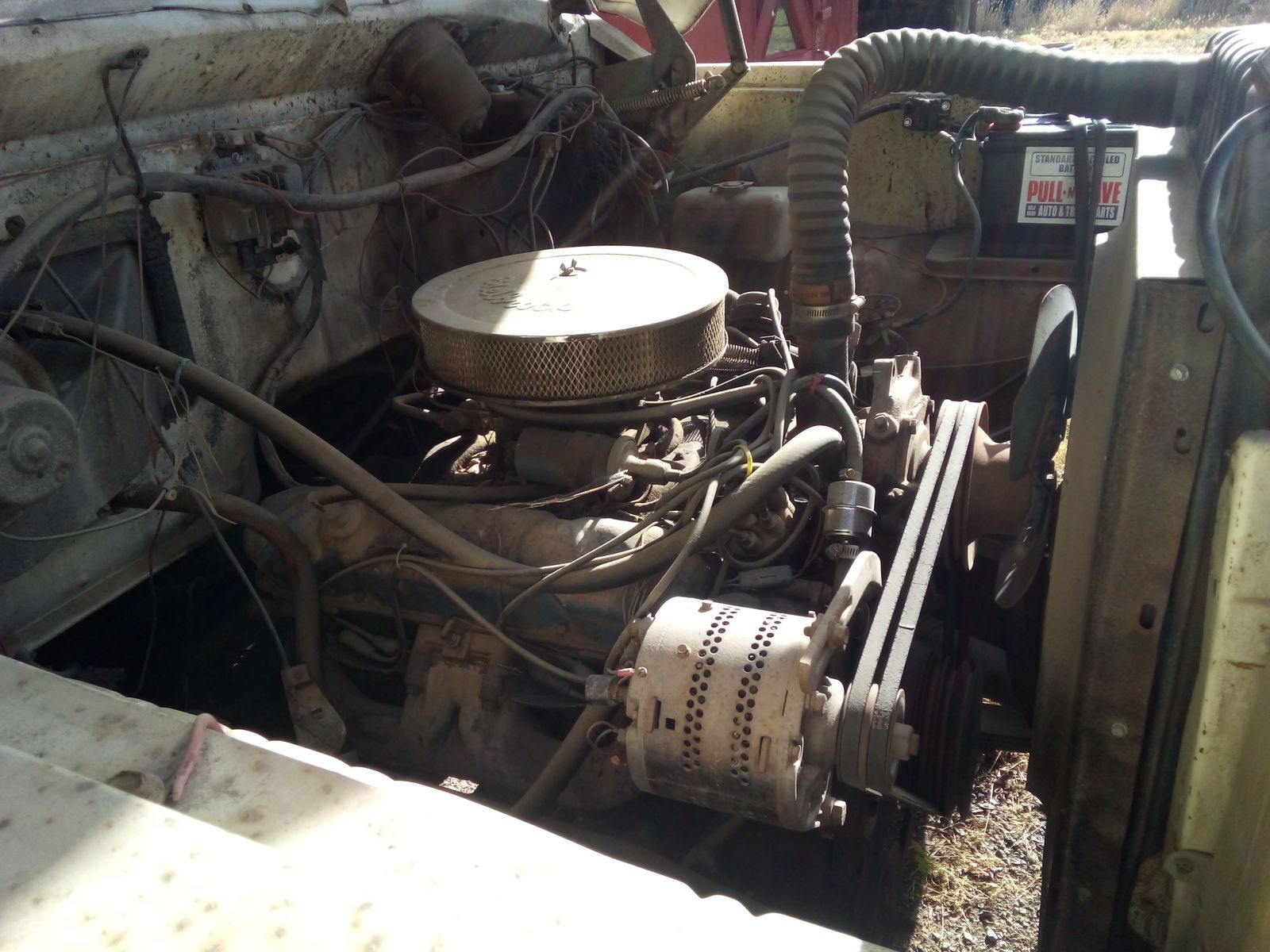 Venmo8'X12' hydraulic bed, dodge 413 engine, 5 speed manual transmission with a 2 speed rear differential, dual fuel tanks, electric fuel pump, 81,620 miles. Truck runs and drives good but will have to be trailerd the, master cylinder went out.