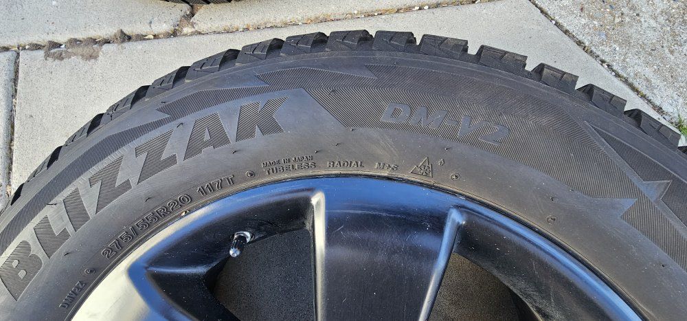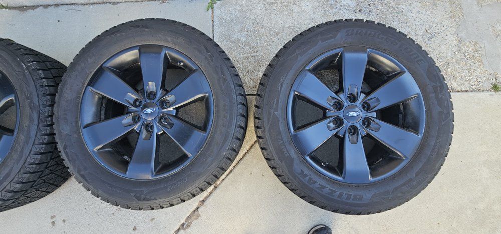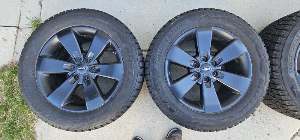 Bridgestone Blizzak DMV2 tires on Black Ford wheels. Lug pattern is 6x135, used on several years of F-150's and Expeditions, may fit more. See the pictures for all the details.