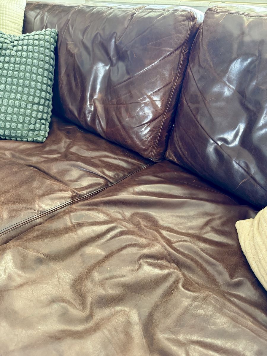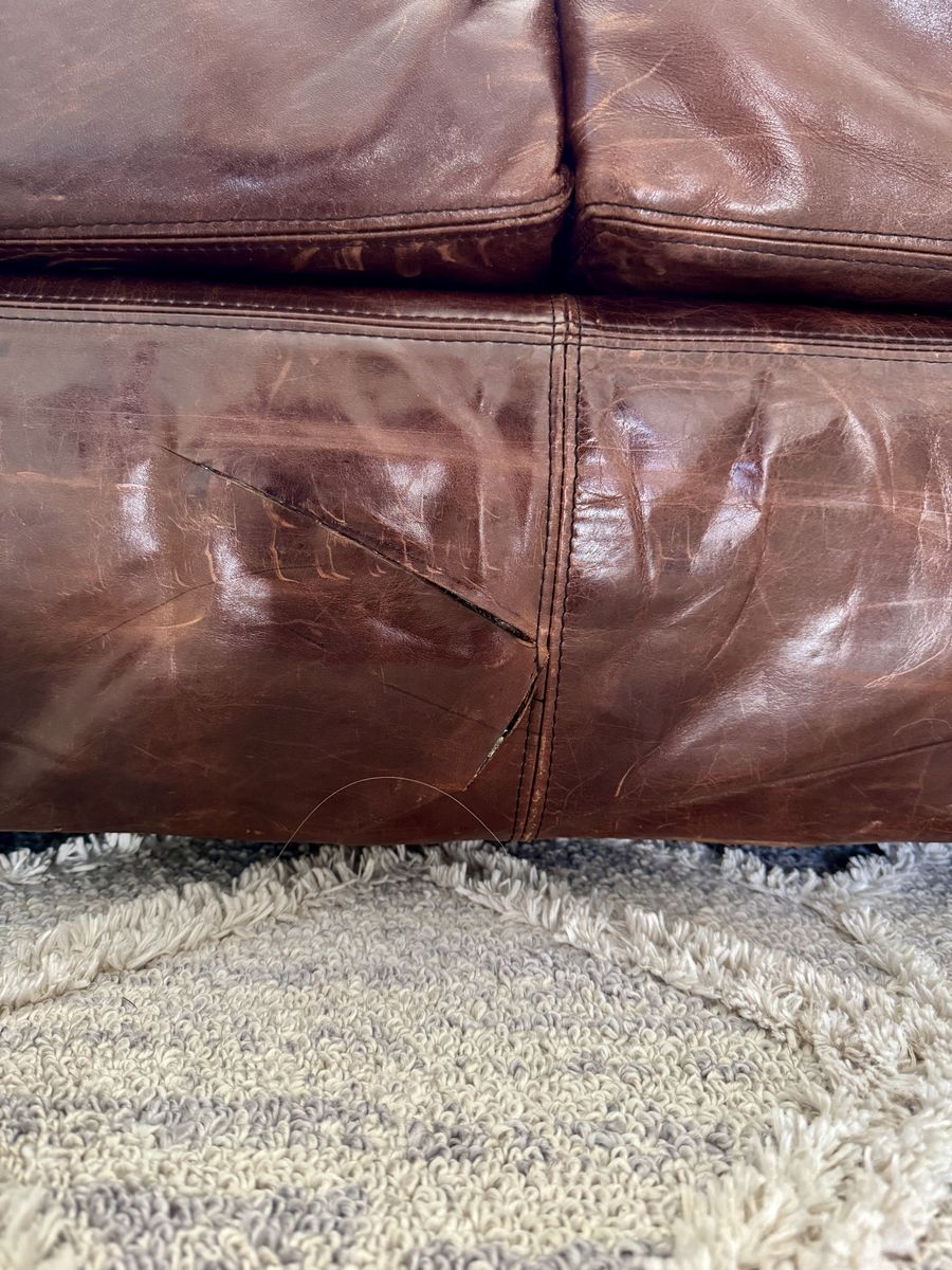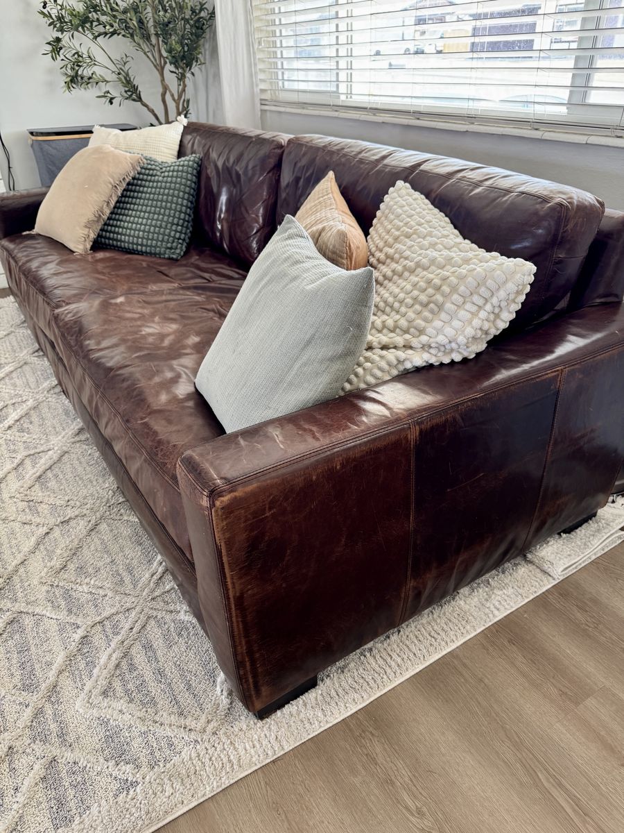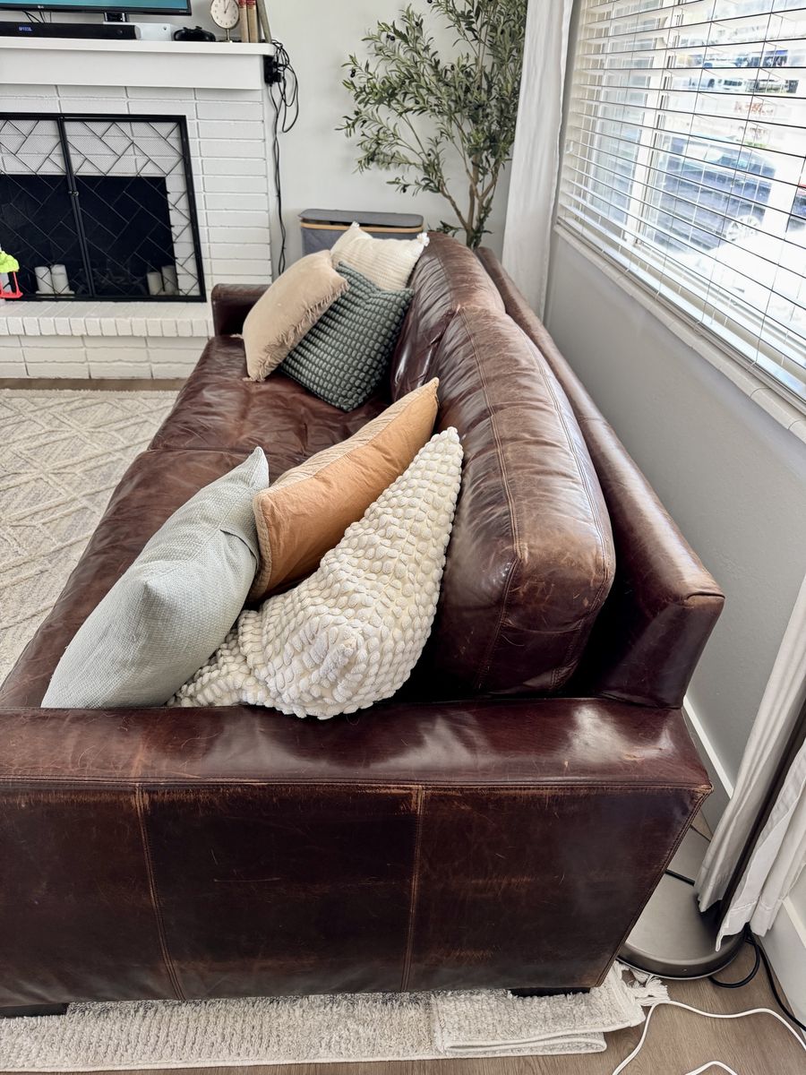 Super solid construction, extremely comfortable, leather is in great shape, full down cushions.
