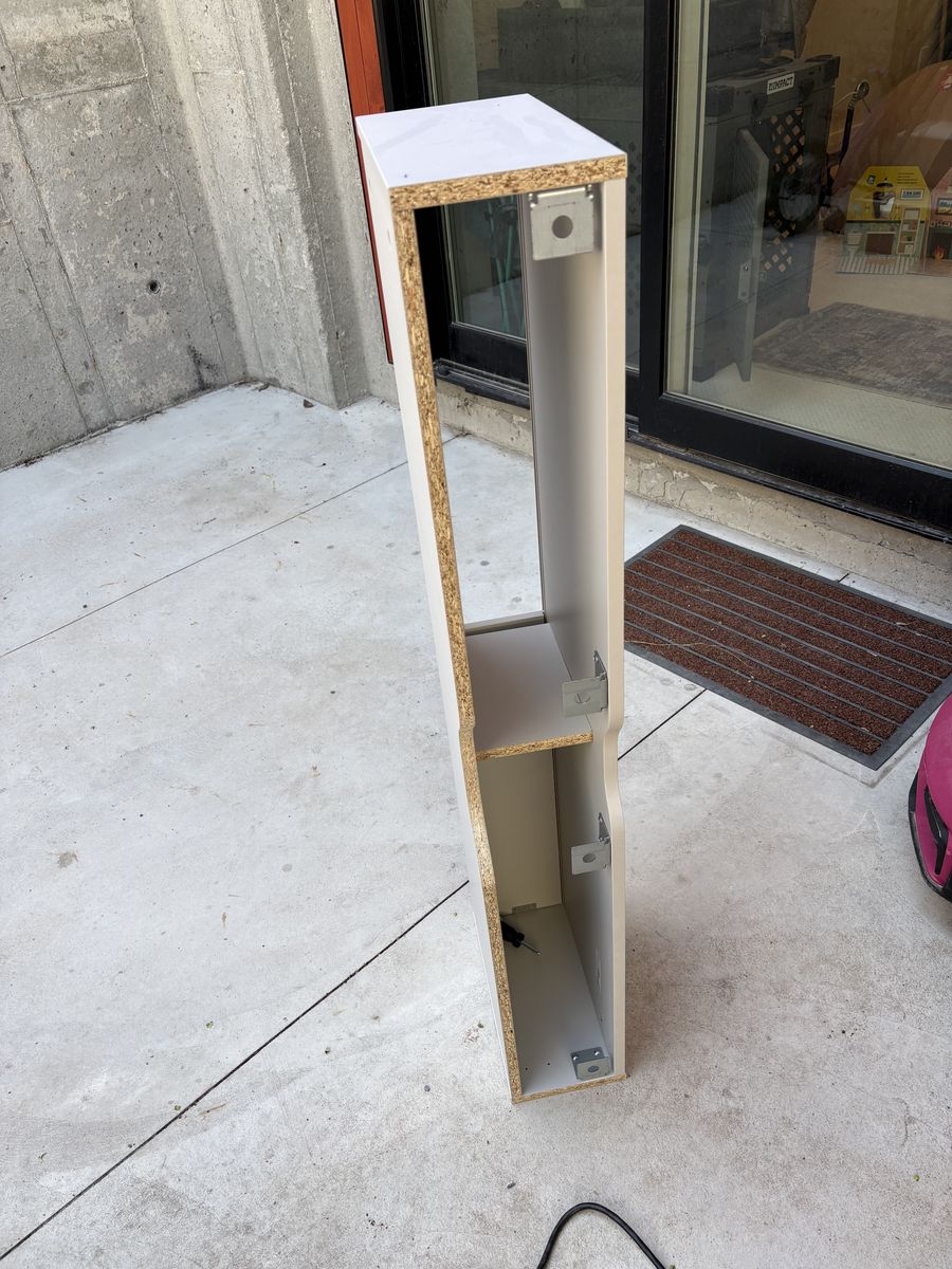 Brand new and assembled. Does not have screws to mount in wall. Approx 40 inches wide.