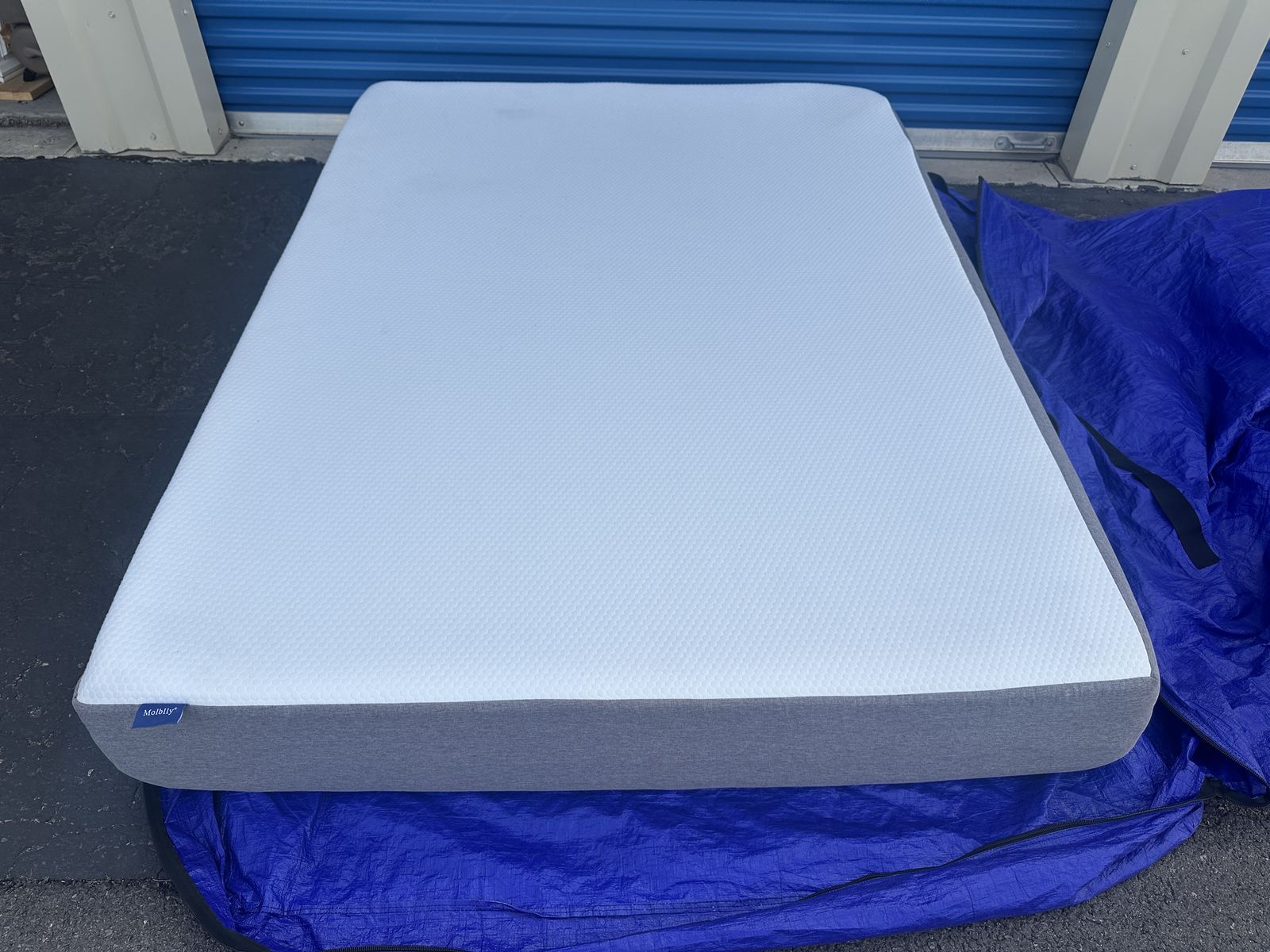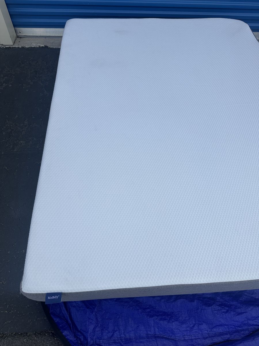 Check out this 10” Molblly queen mattress. Overall, it is in great condition. There are some noticeable signs of imperfections, some marks on the side and front from moving, some signs of use, etc.