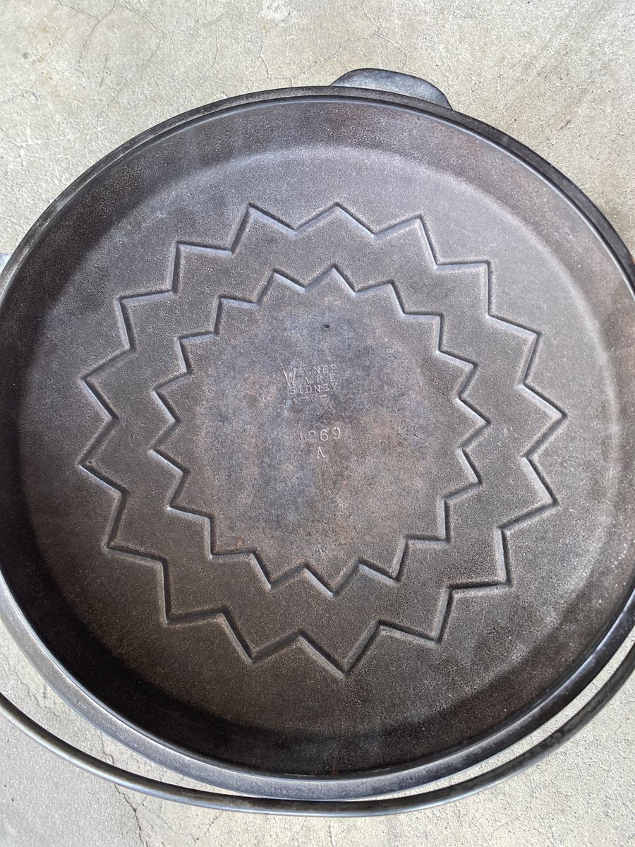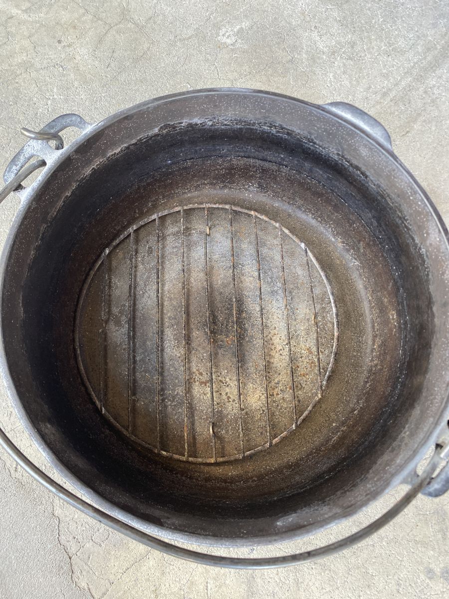 Wagner Dutch Oven for sale. 10" diameter x 4.5" tall without lid. Will need to be reseasoned. Hanging handle is slightly bent. FCFS. Cash only. Thanks for looking!