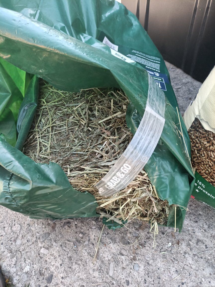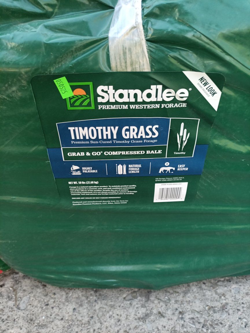 The rabbit food is 70% full of a 50 lb bag. There is a compressed bale of Timothy hay that is unopened and a bale that is just about gone. The new bale of hay sells for $29 at tractor supply. my rabbit is gone, so these are not needed anymore. $20 for all of it. Cash please.