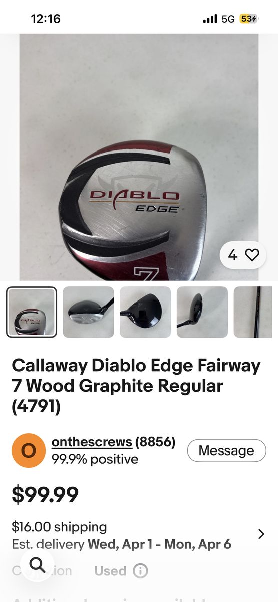 VenmoCallaway Diablo Edge 7 Wood. Regular flex shaft. Club head and face are in great shape with minimal scratching and no dents. Callaway grip on it is in almost perfect shape. 7 woods are all the rage on tour right now. This one’s ready for the course! Asking $90 OBO. Message/text me with any questions you have!