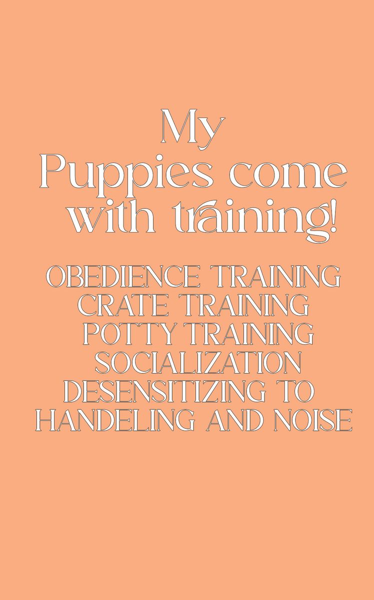 My puppies come with obedience training! Including Sit, Down, Up, Come, Stay, Leave it, Look at me, and Potty. Of course, I do all the early puppy development training, socializing and desensitizing, potty training, and crate training, as well. You will not find other puppies with this much training. The work I do shapes their personality, it makes a huge difference! Check out my Instagram to see more, send me a DM for more info. QR code in photos above.